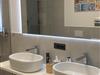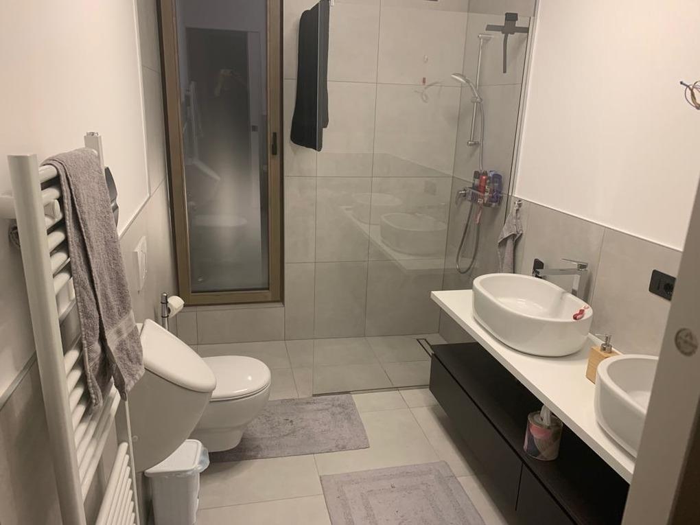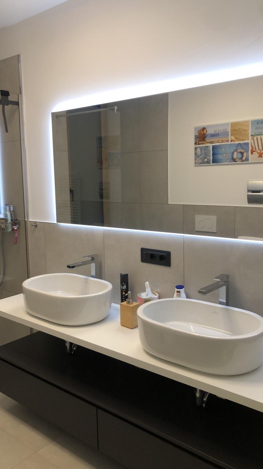 Das helle, moderne Badezimmer verfügt über einen Doppelwaschtisch, einer großräumigen, barrierefreien Dusche und einem bodenlangen Fenster. Die mit Gartenmöbel ausgestattete überdachte -Balkon-Terrasse, ist von allen Räumen des Apartments mit einer eigenen Terrassentüren zugänglich.