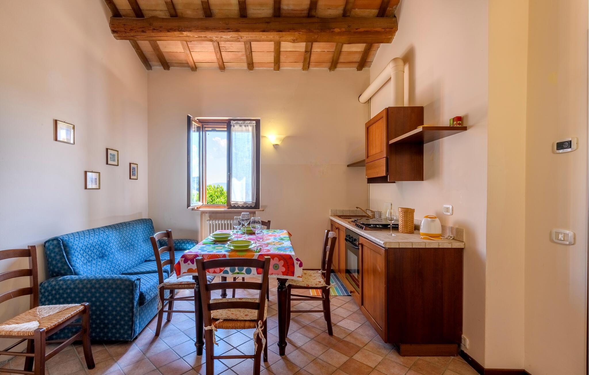 Treten Sie ein und lassen Sie sich von der harmonischen Kombination aus rustikalen Holzbalken, warmen Terrakottaböden und liebevollen Details verzaubern. Freuen Sie sich auf gesellige Kochabende in der offenen Küche und genießen Sie gemeinsame Mahlzeiten am gemütlichen Esstisch. Lassen Sie den Tag mit einem spannenden Buch auf dem Sofa ausklingen oder veranstalten Sie einen Spieleabend mit Ihren Liebsten.