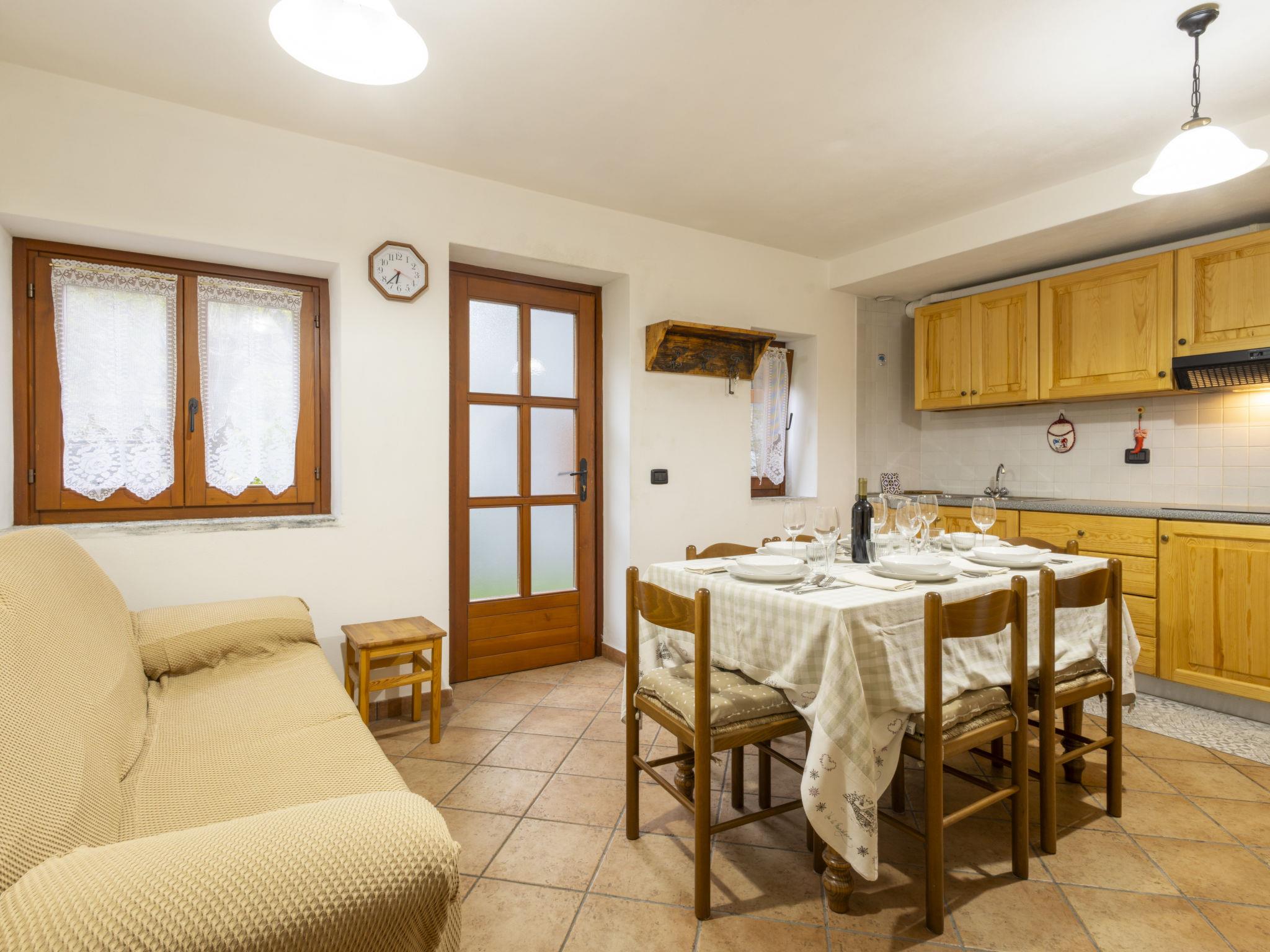 2-Zimmer-Wohnung 50 m2 auf 2 Stockwerken. Zweckmässig und komfortabel eingerichtet: Wohn-/Esszimmer mit Esstisch, TV und Heizofen. Kochnische (4 Induktionskochplatten, Toaster, Wasserkocher, Mikrowelle). Dusche/Bidet/WC. Holzheizung. Obergeschoss: (steile Treppe) 1 Zimmer mit 1 x 2 Etagenbetten, 1 franz. Bett und 1 Doppelbett. Ausgang zur Terrasse. Parkettboden. Kleine Terrasse. Terrassenmöbel. Schöne Panoramasicht auf die Berge. Zur Verfügung: Haartrockner. Internet (WLAN, gratis). Bitte beachten: Kühlschrank ohne Gefrierfach, Nichtraucher-Unterkunft. Maximal 1 Haustier/Hund erlaubt. Eigener Eingang, Rauchmelder, Feuerlöscher. IT014074C2WTDK8KIC