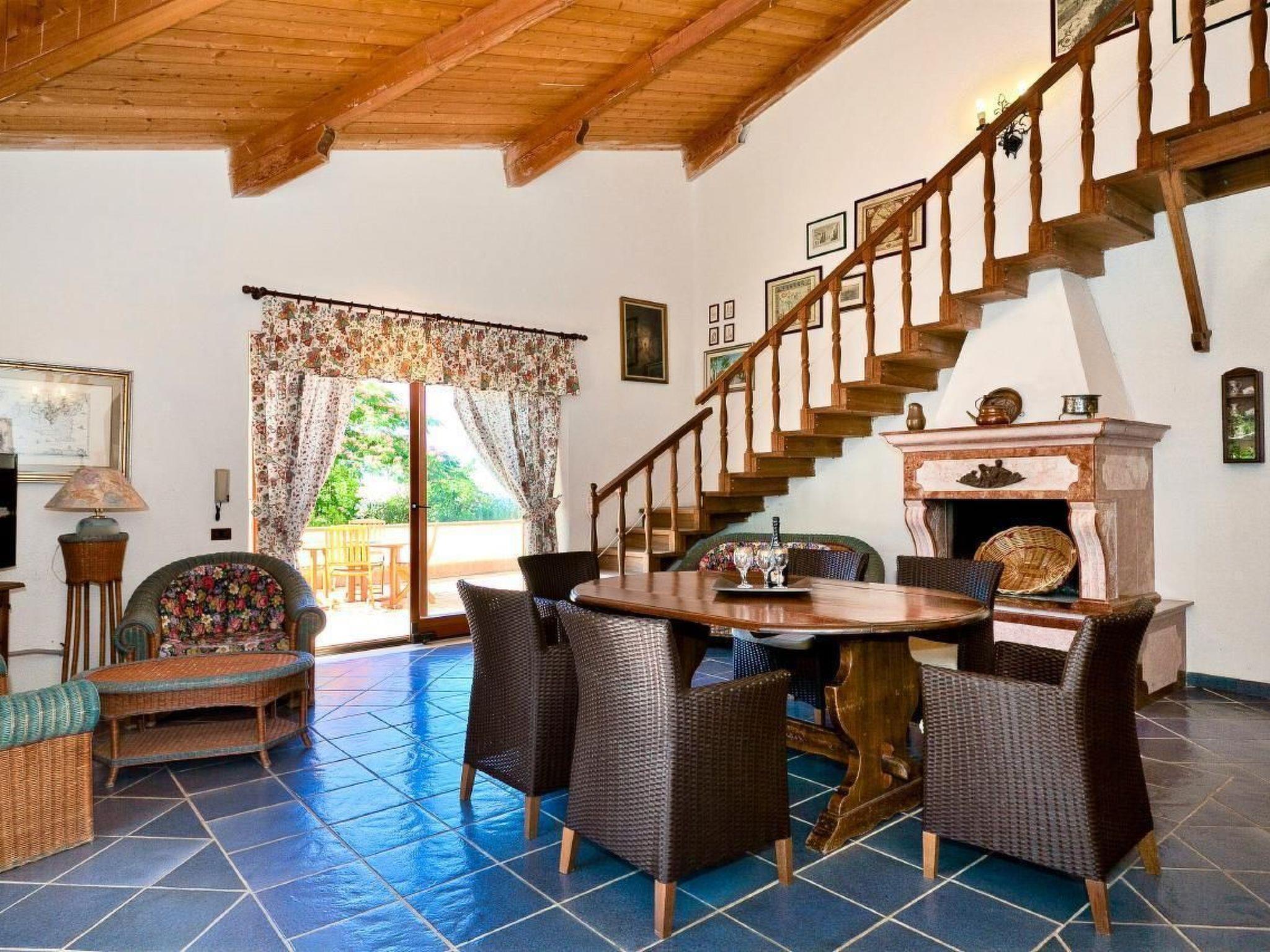 Sie betreten das geräumige und helle Wohnzimmer mit großen Fenstern, die direkt auf die Veranda und den Poolbereich führen. Das Wohnzimmer hat einen gemütlichen Kamin und eine Holztreppe, die in den ersten Stock und zum Schlafzimmer führt. Die Küche, die sich zum Wohnzimmer hin öffnet, ist praktisch, fröhlich und mit allem Notwendigen ausgestattet. Sie wurde aus Mauerwerkselementen und feinen, farbigen Majolikafliesen nach typisch sizilianischer Tradition gebaut. In der Küche gibt es einen Vorratsraum und eine Glastür, die auf eine Veranda mit Außenküche, Grill und Holzofen führt. Im Erdgeschoss befinden sich ein Schlafzimmer mit Doppelbett und ein Bad mit Dusche.