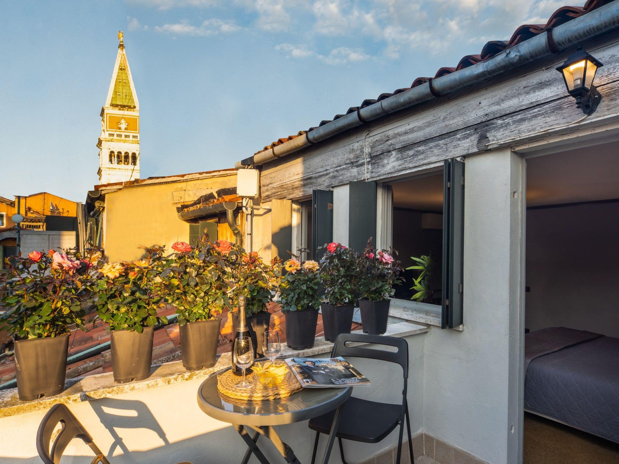 Der Außenbereich der San Moisè Lounge ist nicht weniger beeindruckend und bietet eine kleine Terrasse, von der aus man einen herrlichen Blick über die Dächer von Venedig genießen kann. Eine ruhige Ecke, in der man sich nach einem Tag der Erkundung der Stadt entspannen kann, inmitten der einzigartigen Atmosphäre, die nur Venedig bieten kann.