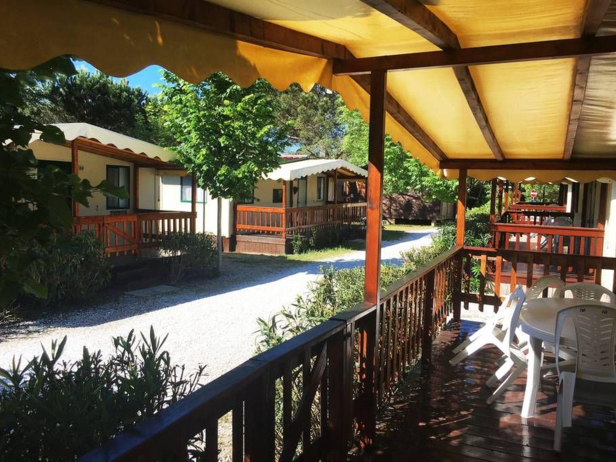 Draußen gibt es eine große, überdachte und möblierte Veranda von 7 x 2 m. Neben dem Mobilheim gibt es einen Parkplatz. Vom Campingplatz aus gibt es einen Shuttlebus zum Meer. Außerdem gibt es einen großen Kinderspielplatz mit sechs großen Trampolinen, einen Fußballplatz, Klettergerüste und ein gemeinsames Schwimmbad. Außerdem gibt es ein Restaurant, einen Supermarkt, ein Geschäft mit Campingausrüstung und einen Fahrrad- und Mountainbike-Verleih. Der Campingplatz hat eine Kapazität von ca. 400 Plätzen und es gibt eine Rezeption, an der Italienisch, Deutsch und Englisch gesprochen wird.