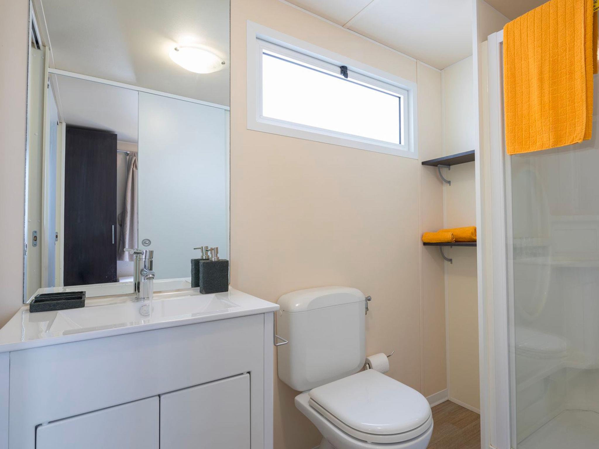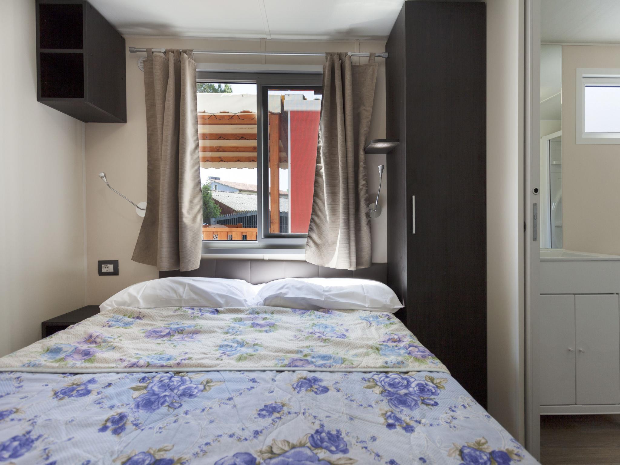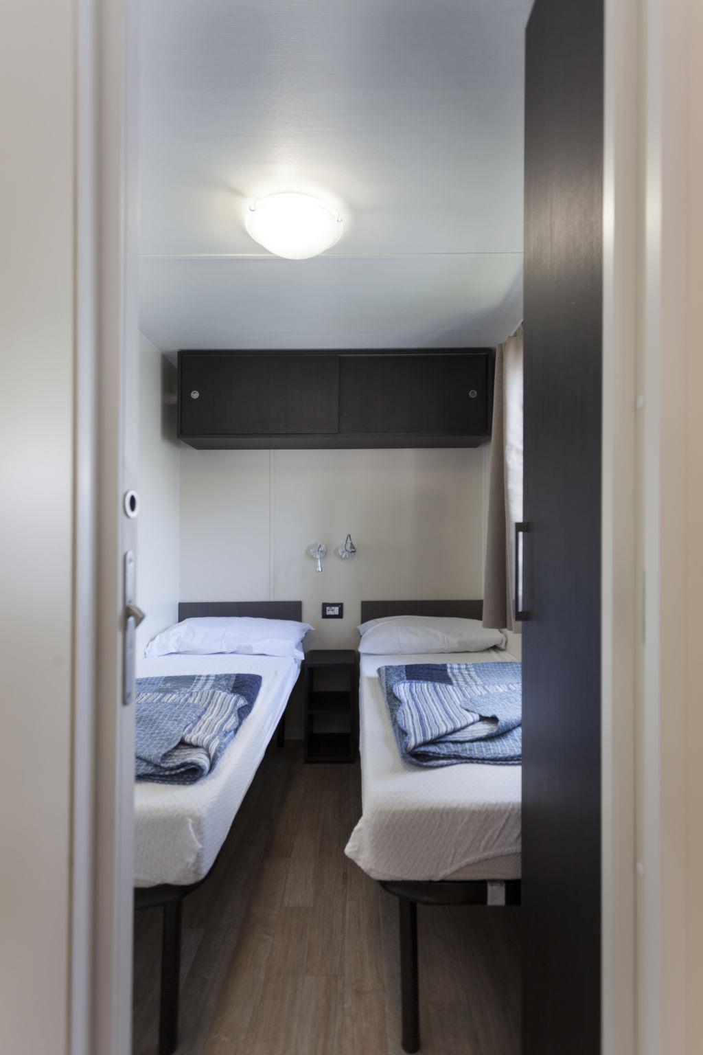 "Baia Relax New", 3-Zimmer-Mobilheim 25 m2. Zweckmässig eingerichtet: Wohn-/Esszimmer mit Esstisch und TV. 1 Zimmer mit 1 franz. Bett (140 cm). 1 Zimmer mit 2 Betten (70 cm). Kochnische (4 Flammen, Tiefkühler). Dusche/WC, sep. WC. Klimaanlage, Warmluftheizung (extra). Terrasse überdacht. Terrassenmöbel. Parkplatz (1 Auto). Bitte beachten: Nichtraucher-Unterkunft. IT090062B1000F2412