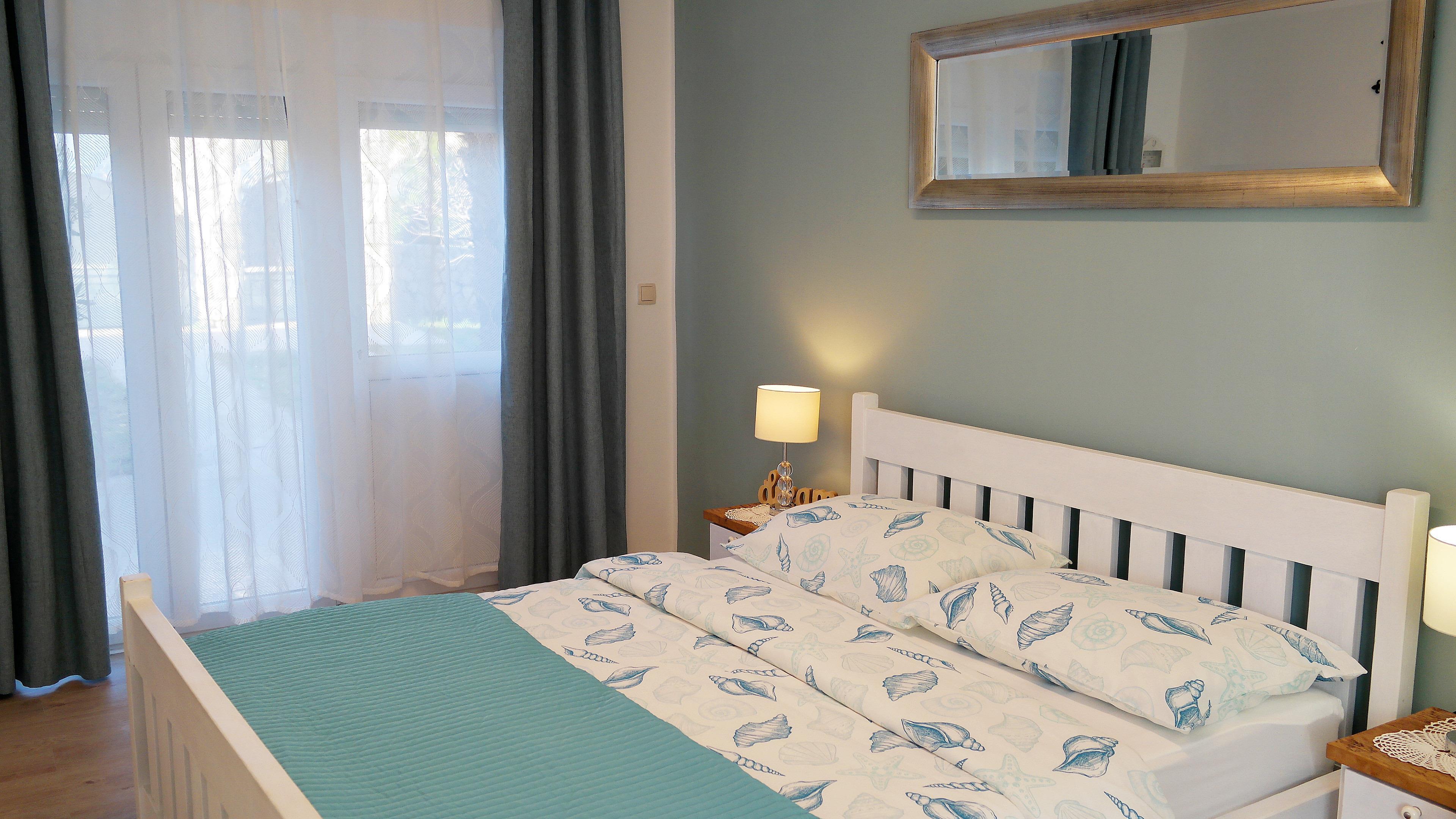Im ersten Stock befinden sich drei Schlafzimmer und ein Badezimmer mit Badewanne und Waschmaschine. Zwei Schlafzimmer sind mit Doppelbetten und ein Schlafzimmer mit zwei Einzelbetten ausgestattet. Jedes Zimmer hat Klimaanlage und Sat-TV. Im ersten Stock befindet sich auch ein Balkon (25 m2), zwei Schlafzimmer haben einen Ausgang auf den Balkon. Ab 2022 hat das Haus einen Swimmingpool mit einer Größe von 25 m2 (Größe 6,60 x4,00 m, Tiefe 1,35 m). Beim Haus ist ein Parkplatz. Das Haus befindet sich nur 100 m vom Geschäft und 200 m vom Restaurant entfernt. Ebenfalls nur 150 m vom Haus entfernt befindet sich der moderne Fitnessraum, der das ganze Jahr über genutzt werden kann (nicht im Preis inbegriffen).