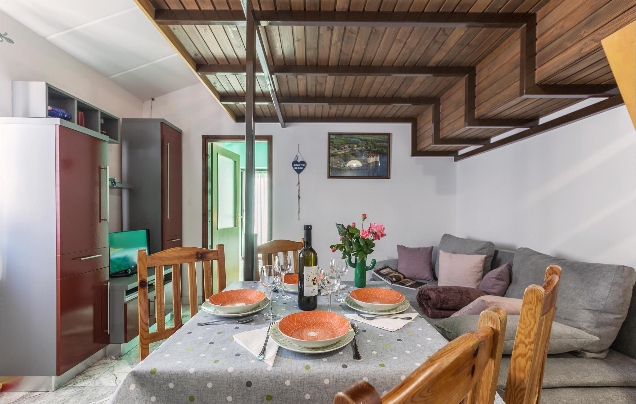 Diese nette Ferienwohnung befindet sich in einem Reihenhaus der Feriensiedlung in Barbariga, an der schönen Küste von Fažana. Im Erdgeschoss gibt es ein Schlafzimmer, Küche, Badezimmer sowie eine Terrasse. Oberhalb des Wohn- und Essbereiches wurde eine Holzgalerie mit Schlafmöglichkeit gebaut, zu der Sie über eine steile Holztreppe gelangen. Nach einem etwa zehnminütigen Spaziergang durch die Natur gelangen Sie zu den Natur- und Felsstränden. Mit dem Auto erreichen Sie die historische Stadt Pula mit ihrem sehenswerten Amphitheater „Arena“ aus der Zeit der Antike, vielen Museen und gastronomischen Einrichtungen.