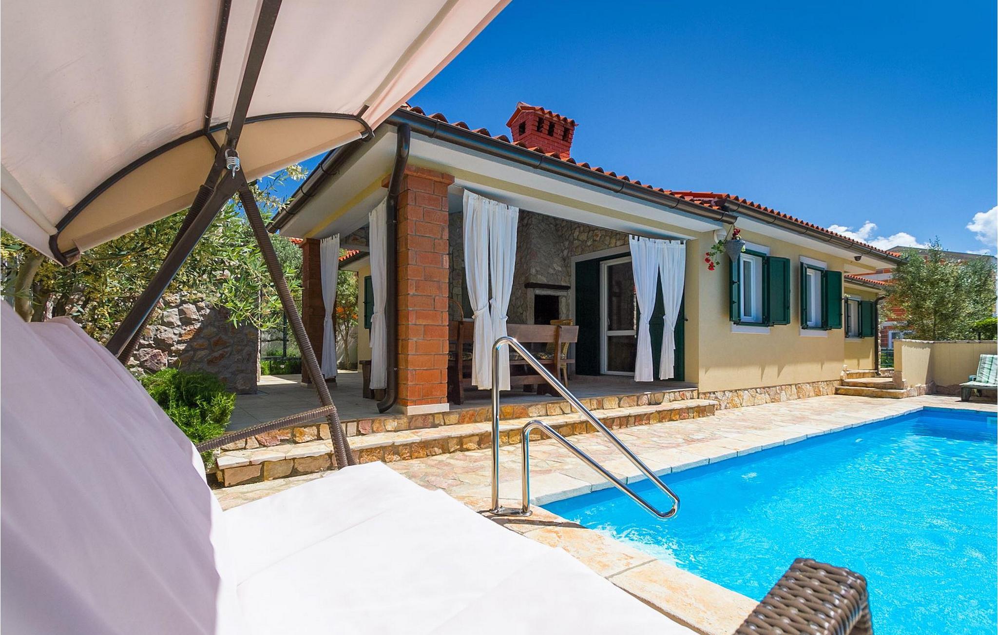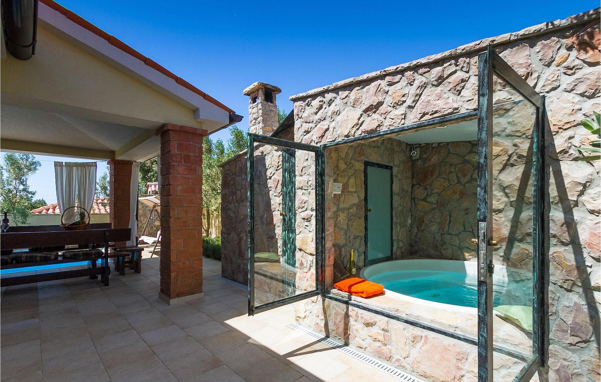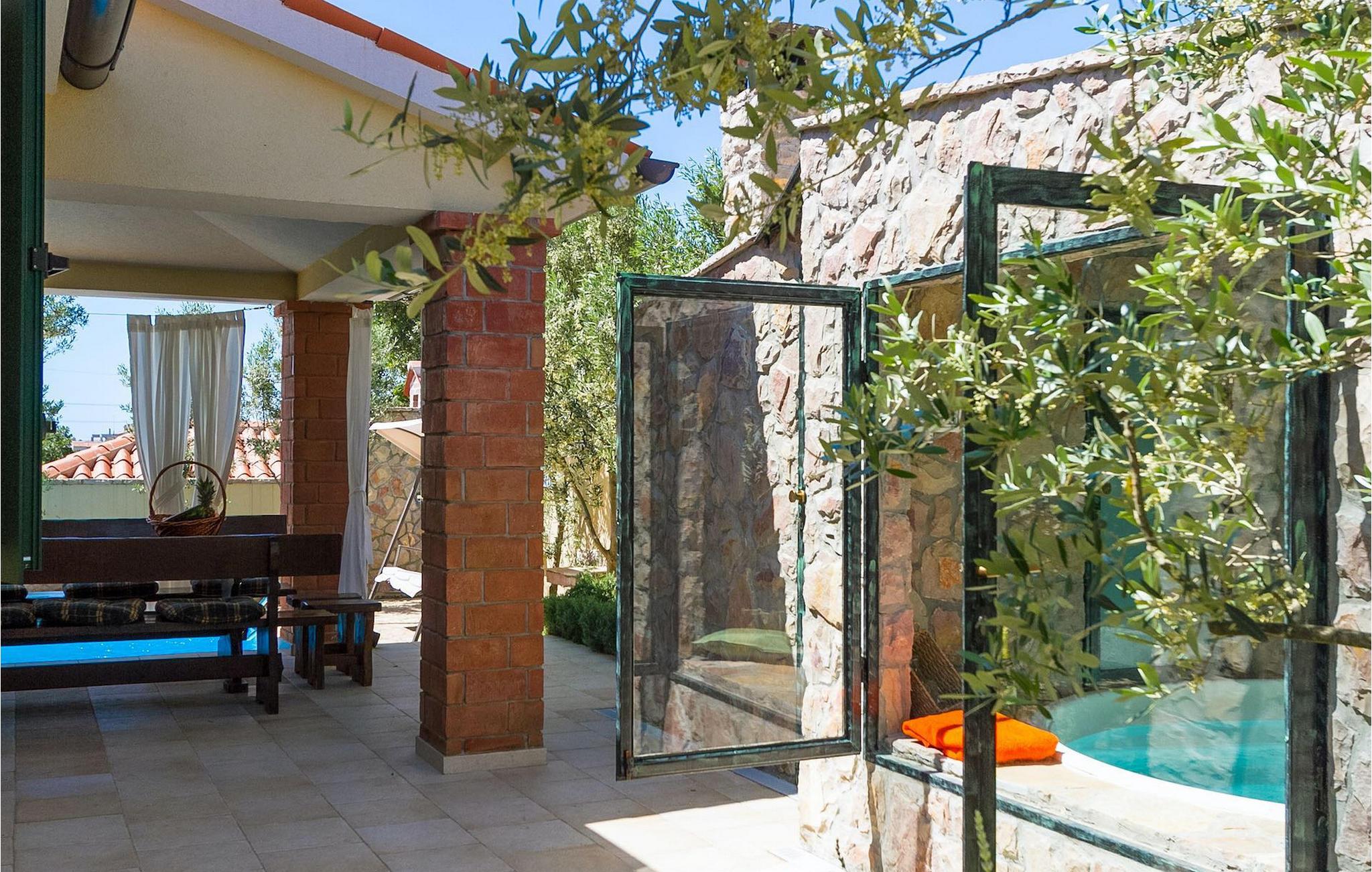 Sie bietet Platz für bis zu acht Personen und verfügt über drei komfortable Schlafzimmer, drei Badezimmer, ein helles und geräumiges Wohnzimmer und eine voll ausgestattete Küche mit Essbereich. Vom Wohnzimmer aus gelangen Sie auf die schöne Terrasse im Garten, auf der Sie sicherlich viele angenehme Stunden verbringen werden. Im Außenbereich der Villa befindet sich auch ein 24 Quadratmeter großer Pool, der auf Anfrage geheizt werden kann. Für zusätzlichen Luxus sorgen auch eine moderne Sauna und ein Jacuzzi, die sich ebenfalls im Außenbereich der Villa befinden.