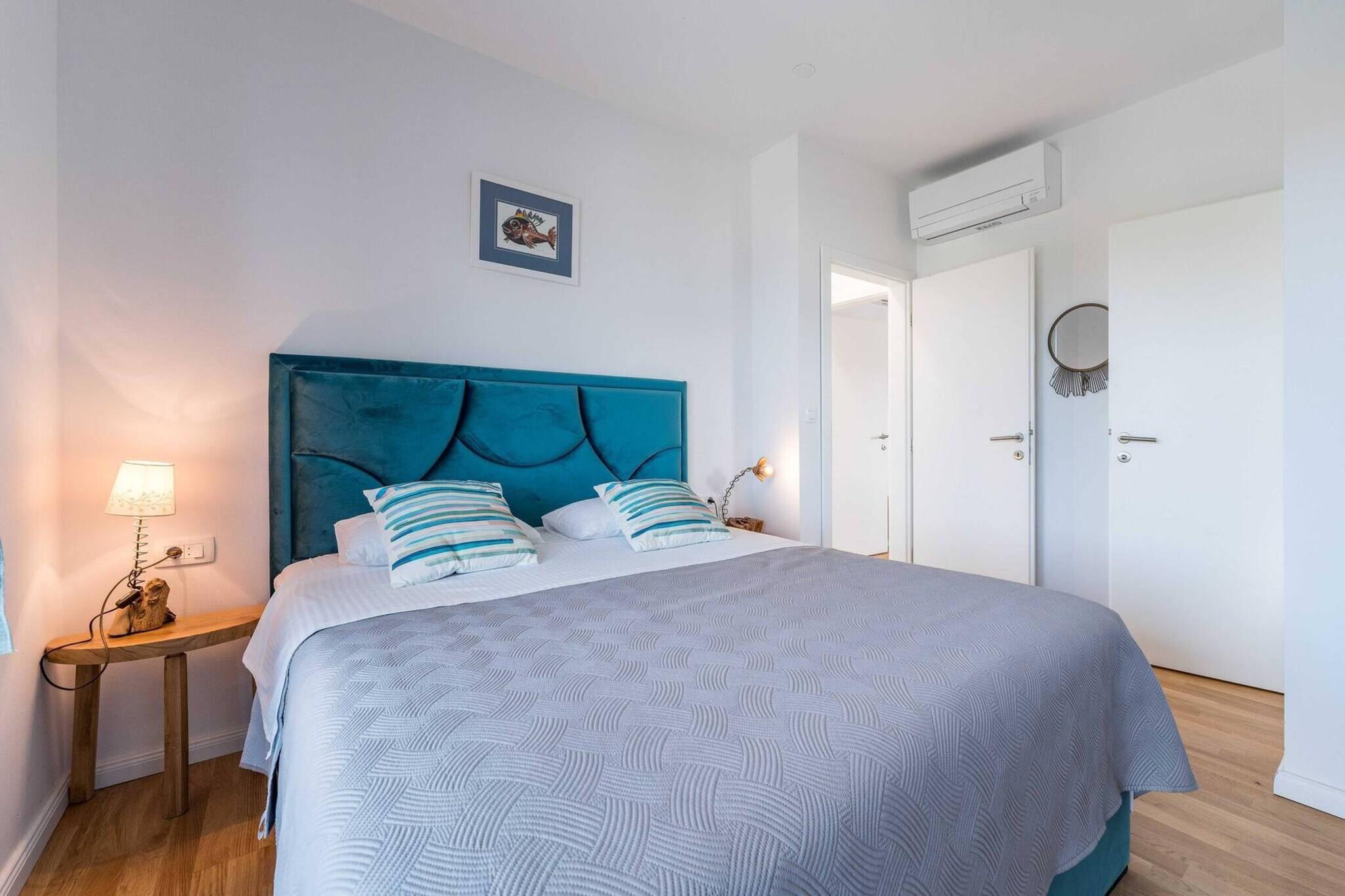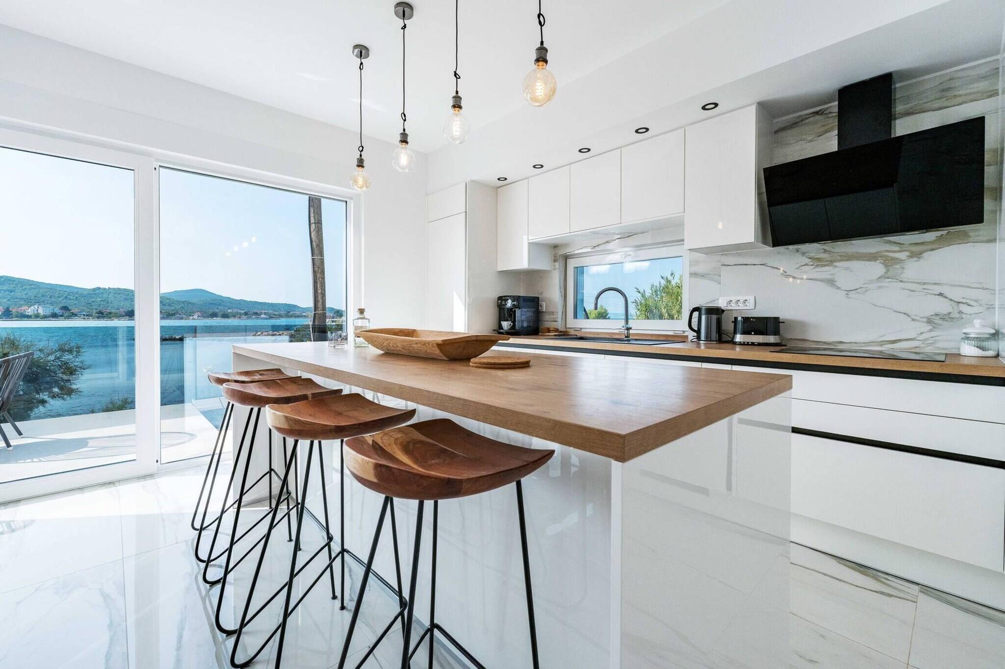 Direkt am Ufer der glitzernden Adria gelegen, bietet diese atemberaubende Villa am Meer einen Logenplatz für die Schönheit der dalmatinischen Küste. Nur wenige Schritte von den sanften Wellen entfernt, lädt sie Sie ein, mit dem Rauschen des Meeres aufzuwachen und jeden Tag mit Sonnenuntergängen zu beenden, die den Horizont in Gold und Rosa tauchen. Dieser elegante Rückzugsort für Familien oder Gruppen von bis zu acht Personen verbindet modernen Komfort mit dem entspannten Rhythmus des Insellebens. Die Villa erstreckt sich über zwei Ebenen, wo helle, luftige Innenräume auf einen Panoramablick auf das Meer treffen. Im Erdgeschoss geht der offene Wohn- und Essbereich nahtlos in eine voll ausgestattete Küche über und schafft so einen warmen, geselligen Raum für Zusammenkünfte. Im Obergeschoss sorgen vier stilvolle Schlafzimmer mit eigenem Bad für Privatsphäre und Komfort, während ein Balkon mit Meerblick einen ruhigen Rückzugsort bietet. Jedes Zimmer ist durchdacht eingerichtet, klimatisiert und mit einem Fernseher ausgestattet. Im Außenbereich verläuft das Leben in einem langsameren Tempo. Ein beheizter Infinity-Pool scheint sich ins Meer zu ergießen und ist von Sonnenliegen umgeben, die sich perfekt für entspannte Nachmittage eignen. Genießen Sie Ihre Mahlzeiten unter der überdachten Terrasse, die Sie in Ihrer Außenküche mit Steinkamin zubereiten können, oder entspannen Sie sich nach dem Schwimmen in der Sauna. Mit einem Fitnessraum, Fahrrädern und sogar einem Paddleboard stehen Ihnen zahlreiche Möglichkeiten zur Erkundung und Entspannung zur Verfügung. Die Insel Pašman ist ein wahres verstecktes Juwel, das mit der Fähre leicht zu erreichen ist und dennoch weit weg vom Trubel des Festlandes liegt. Ein Sandstrand und ein Spielplatz liegen direkt vor Ihrer Villa, ein Café und ein Markt sind in der Nähe und lokale Restaurants erwarten Sie in Laufnähe. Hier fühlt sich jeder Moment mühelos an – Sonne, Meer und Ruhe in perfekter Harmonie.