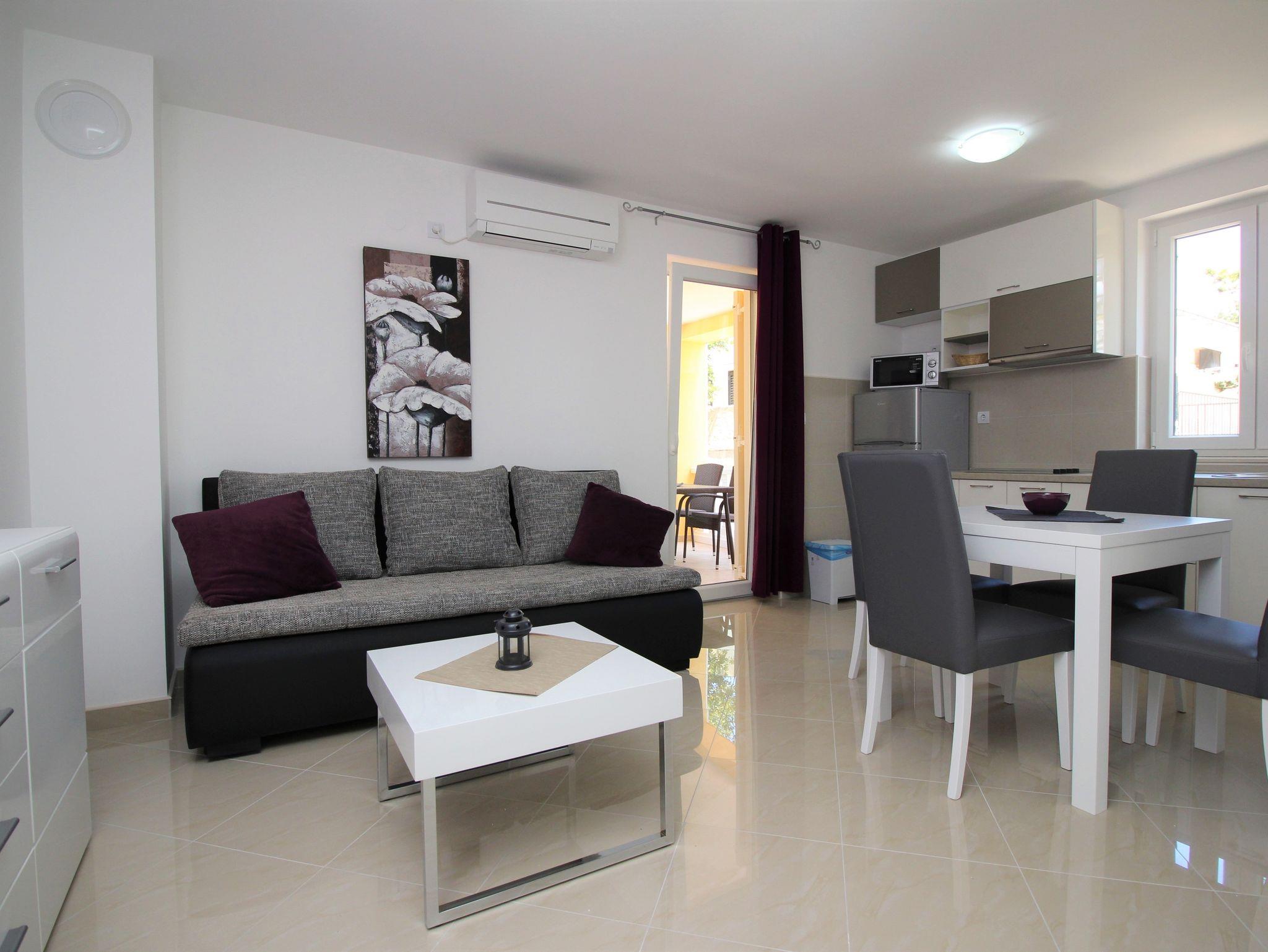 Ferienwohnung bietet Platz für 3 Gäste. Die Betten sind in Schlafzimmern, die es 1 gibt, und in Wohnzimmer, innerhalb einer Gesamtfläche von 42m2, angeordnet. Die Gäste haben eine eigene Terrasse zur Verfügung, auf der sie in warmen Sommernächten genießen können. Es ist erlaubt, Speisen auf dem Gemeinschafts-Grill vorzubereiten. Während ihres Aufenthalts können Gäste das gemeinsam zur Nutzung stehende Schwimmbad benutzen. IM PREIS INBEGRIFFEN: Endreinigung, Klimatisierung, Pool, Parkplatz, Internet, Bügeleisen, Föhn. VERBINDLICHE ZUSÄTZLICHE KOSTEN: Kurtaxe (Erwachsene 0,93 € - 2,20 € Nacht/Person, Kinderermäßigung 12 - 17 Jahre), Aufzahlung für Kurzaufenthalte (prozentualer Zuschlag pro Nächtigungsanzahl: 30% - 1, 20% - 2, 10% - 3). Die Verfügbarkeit zusätzlicher Dienstleistungen in Ihrem reservierten Termin und die Preise derselben (falls nicht aufgeführt) müssen im Voraus überprüft werden. Zusätzliche Dienstleistungen die in der Zahlungsaufforderung nicht aufgeführt sind werden direkt beim Vermieter bezahlt, angenommen der Gast nutzt auch diese.