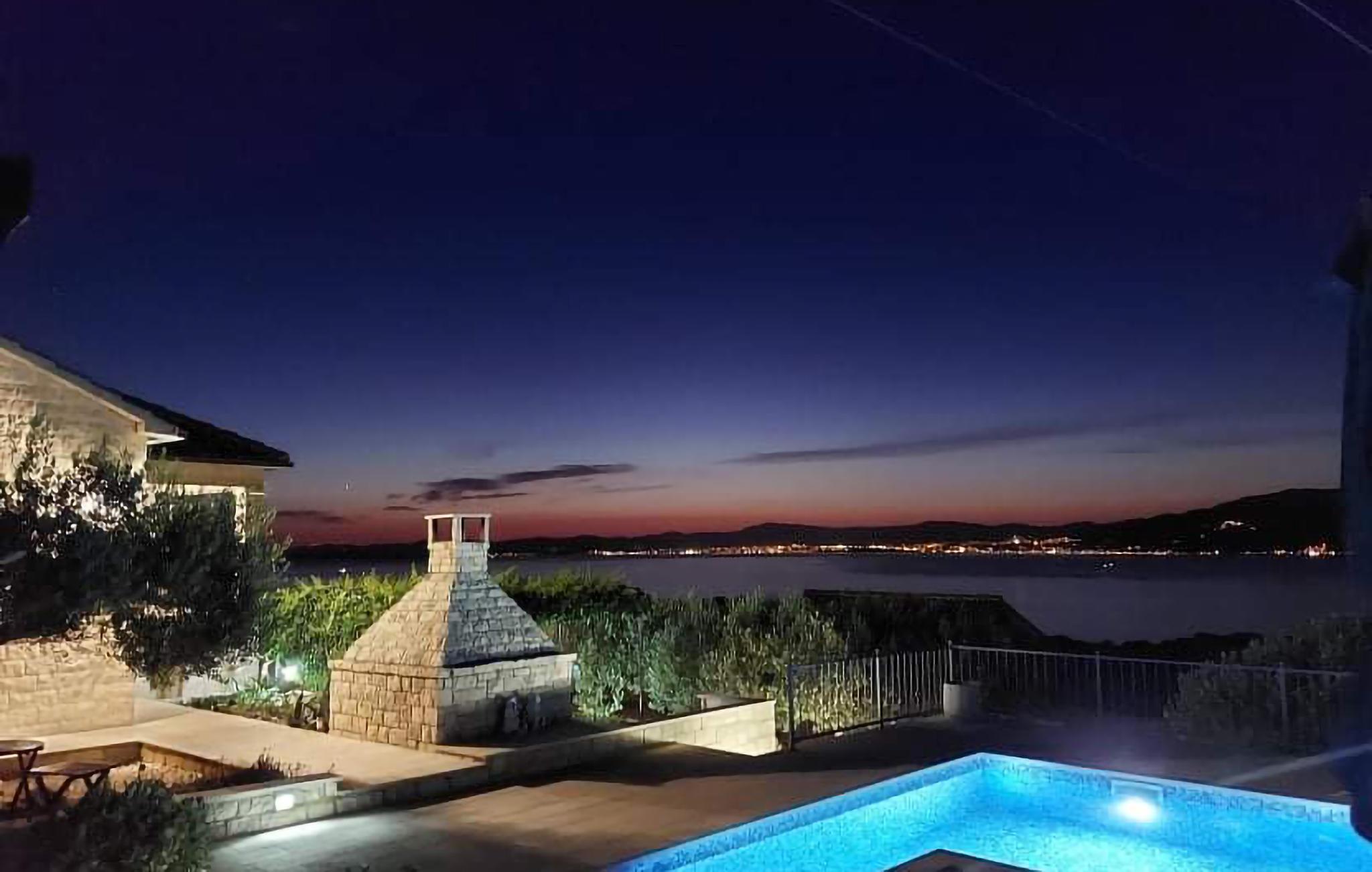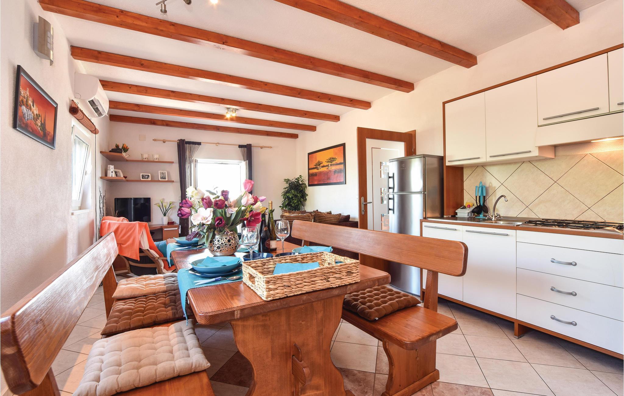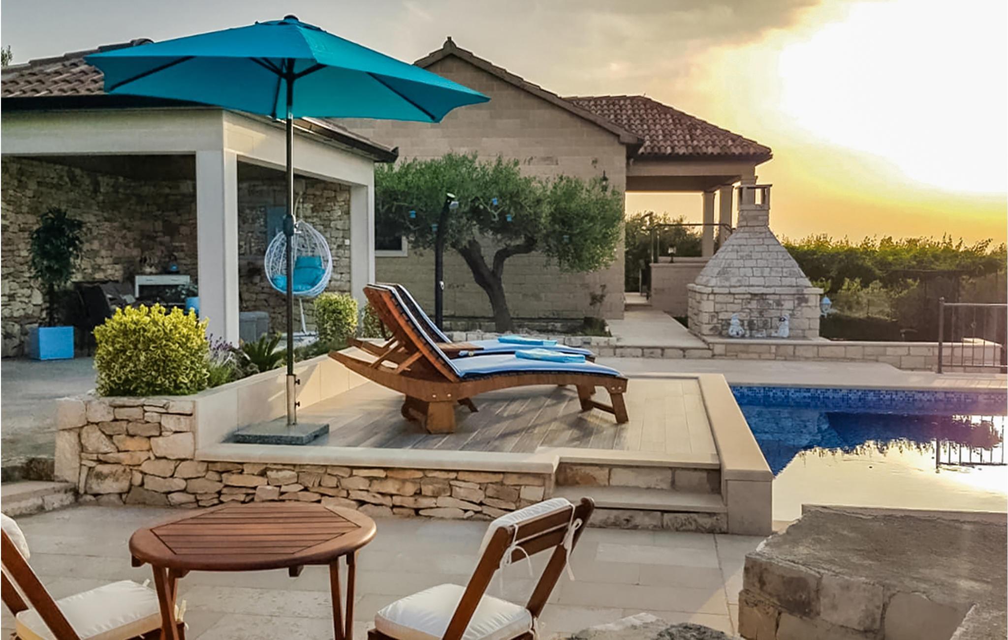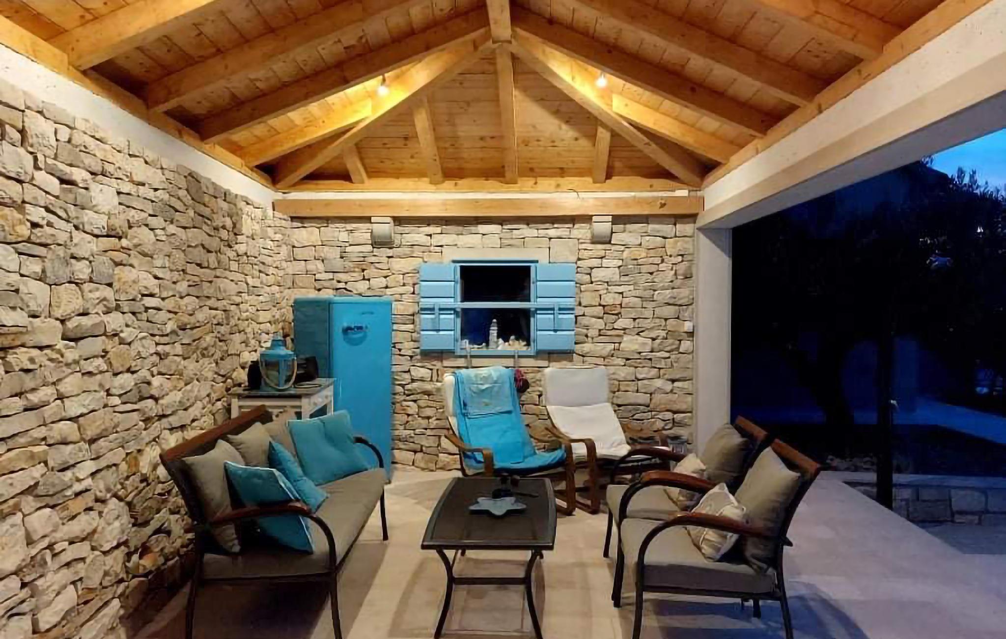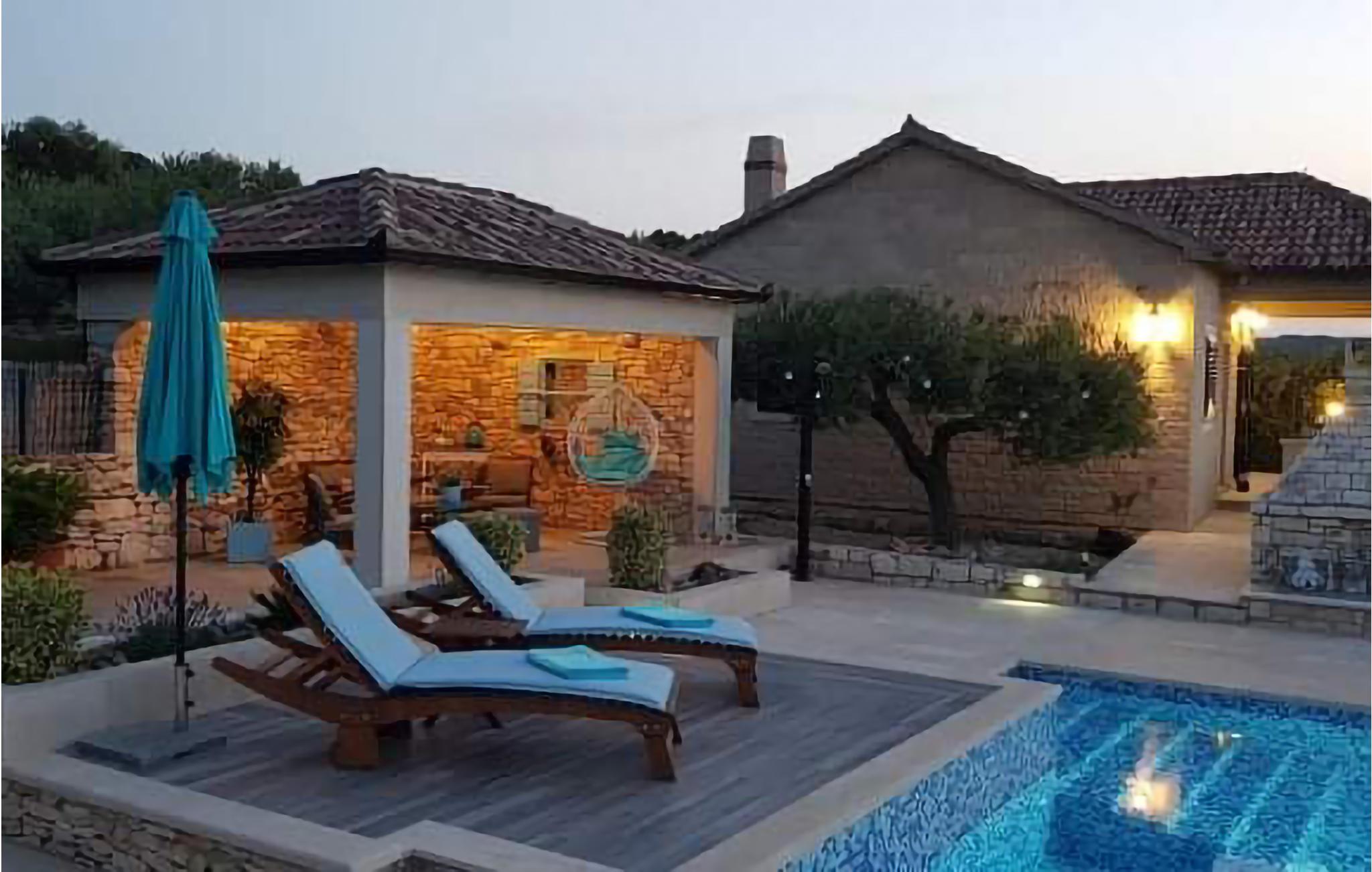 Dieses schöne Ferienhaus strahlt eine besondere Mittelmeer-Atmosphäre aus. Es liegt idyllisch, und durch die Kombination aus Holz und Stein sorgt es für ein barrierefreies Wohnen zwischen Olivenhainen. Die großzügige Terrasse mit Kamin ist ein ausgezeichneter Ort zum Entspannen und Zubereiten von Grillspezialitäten. Erfrischen Sie sich im Pool und genießen Sie den Panoramablick auf das Wasser vor Brac von dieser abgeschiedenen Position des Ferienhauses. In wenigen Minuten Autofahrt erreichen Sie das Zentrum von Postira, wo es viele Freizeitaktivitäten während des Sommers sowie herrliche Kiesstrände gibt. Etwa 200 m entfernt ist eine Fischfabrik.