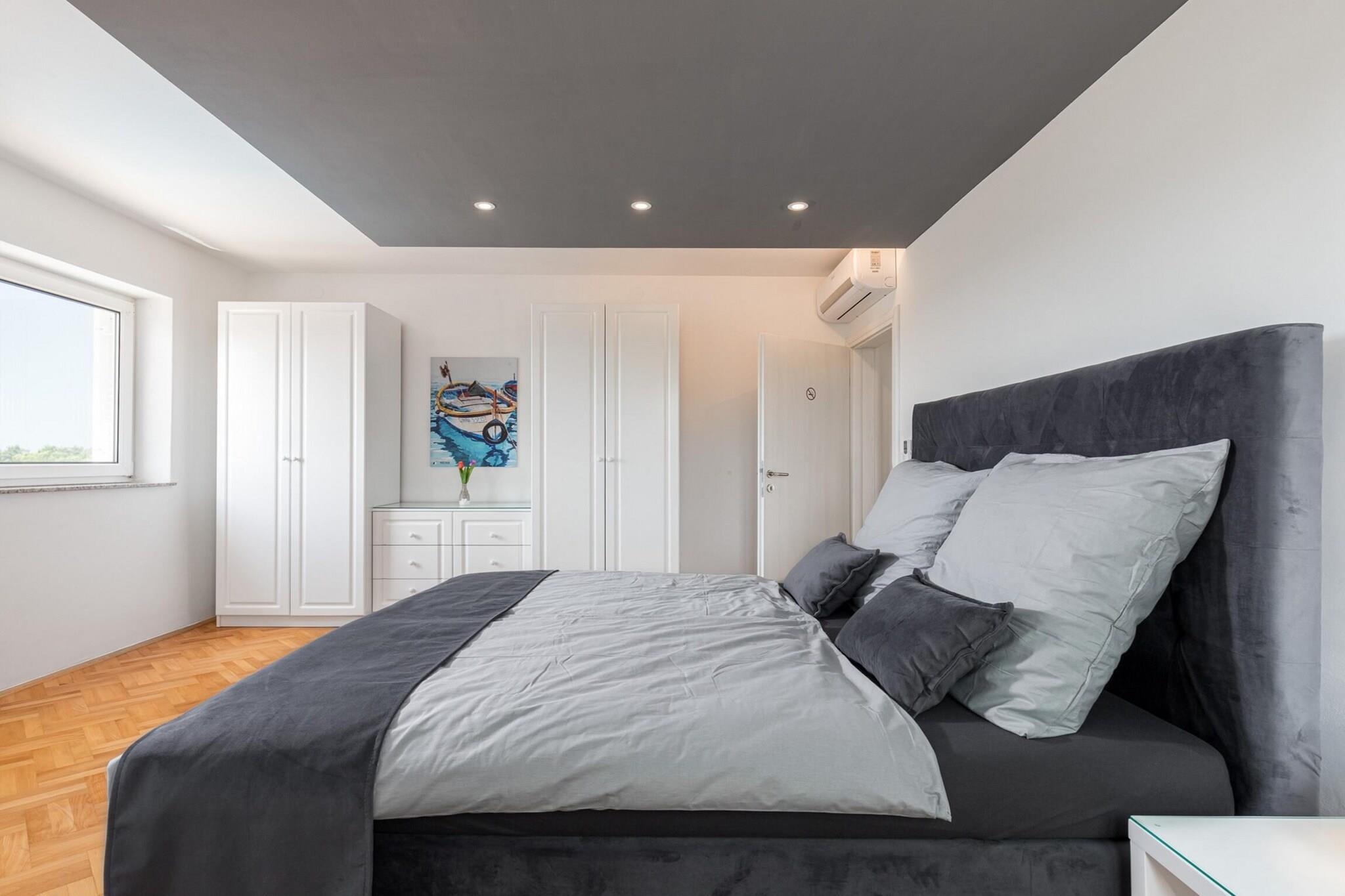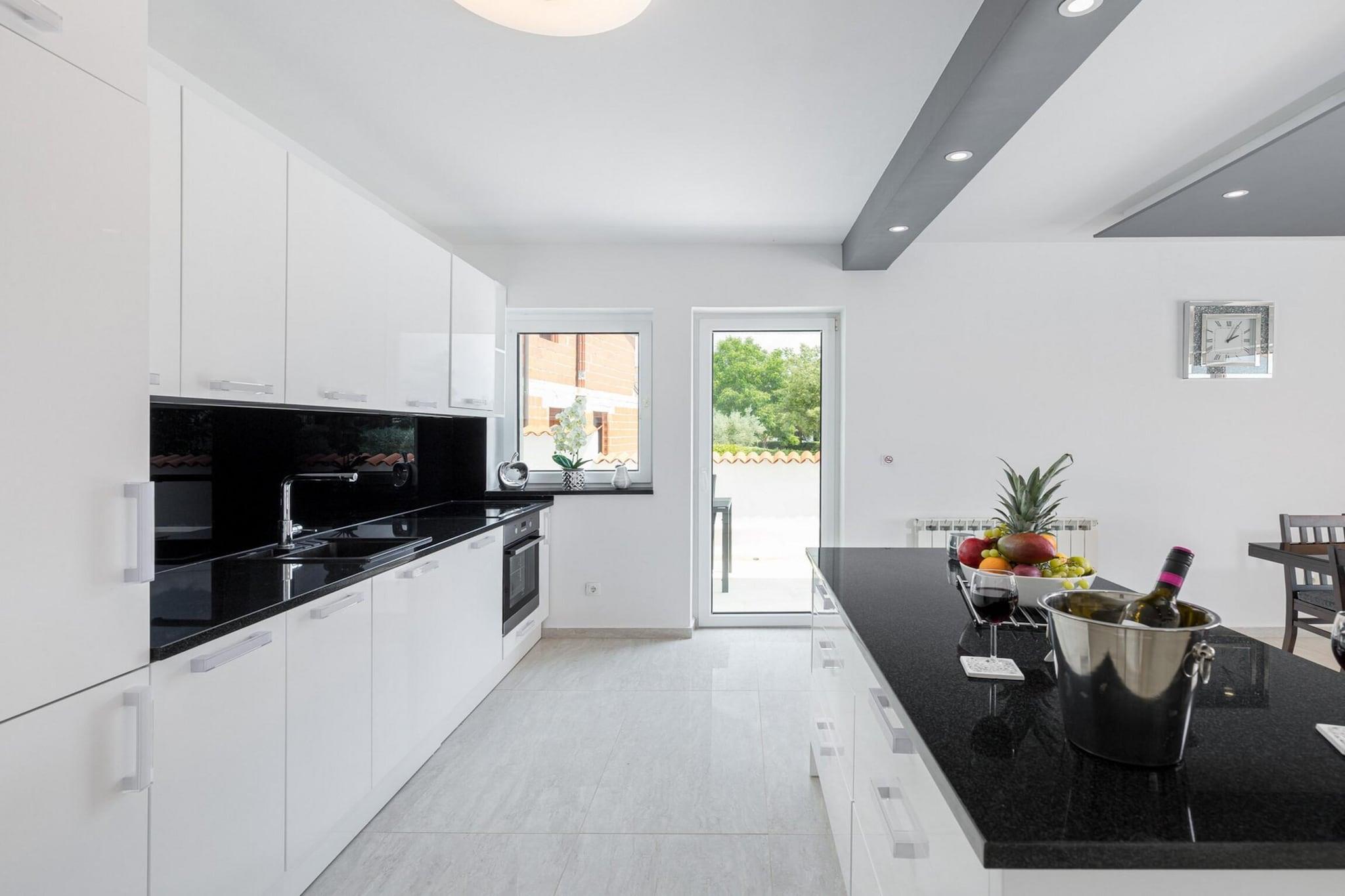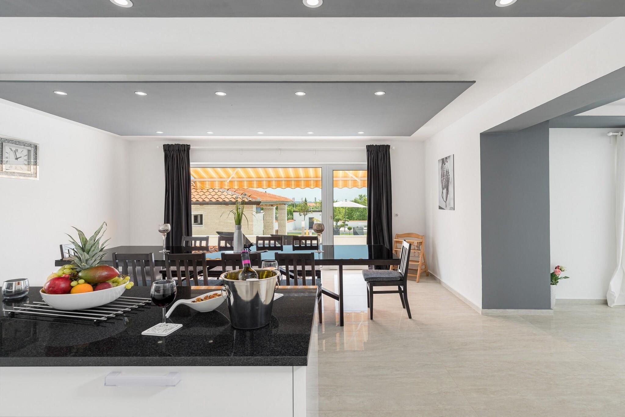 Diese geräumige Villa ist wunderschön eingerichtet und für große Gruppen oder Familien konzipiert. Sie verfügt über sechs Schlafzimmer und eine Gesamtkapazität von 12 Gästen. Das Anwesen bietet eine Vielzahl von Außenanlagen, darunter einen privaten Swimmingpool, einen Garten und eine Terrasse mit Gartenmöbeln, ideal zum Entspannen oder Essen im Freien. Die Villa ist komplett mit modernen Annehmlichkeiten wie WLAN, Klimaanlage, Zentralheizung und 8 Satellitenfernsehern mit Kanälen in mehreren Sprachen ausgestattet. Zu den weiteren Annehmlichkeiten gehören ein Fitnesscenter, eine Sauna, ein Whirlpool und ein Kinderspielplatz, was sie zu einer ausgezeichneten Wahl für Familien macht, die Entspannung und Unterhaltung suchen. Parkplätze im Freien stehen ebenfalls vor Ort zur Verfügung. Die Villa liegt in einer familienfreundlichen Zone in der Nähe des Meeres und bietet einfachen Zugang zu einer Reihe lokaler Sehenswürdigkeiten. Es ist nur 200 Meter vom beliebten Restaurant „Istarska konoba“ entfernt, während der nächste Supermarkt, Žbandaj, nur 3 km entfernt ist. Gäste können die 6 km von der Villa entfernten Sand- und Felsstrände von Pical besuchen oder die ebenfalls 6 km entfernte Stadt Porec erkunden. Wer abenteuerlichere Erlebnisse sucht, findet im nahegelegenen Wasserpark Aquacolors (7 km) familienfreundlichen Spaß. Die Villa ist für Reisende günstig gelegen, da der Flughafen und Bahnhof Pula etwa 60 km und der Flughafen und Bahnhof Triest etwa 85–110 km vom Anwesen entfernt sind. Die separate Küche der Villa ist komplett mit hochwertigen Geräten ausgestattet, darunter ein Induktionskochfeld, Kühlschrank, Mikrowelle, Backofen, Gefrierschrank, Geschirrspüler und alle notwendigen Küchenutensilien. Eine Kaffeemaschine, ein Toaster und ein Wasserkocher sorgen für noch mehr Komfort.