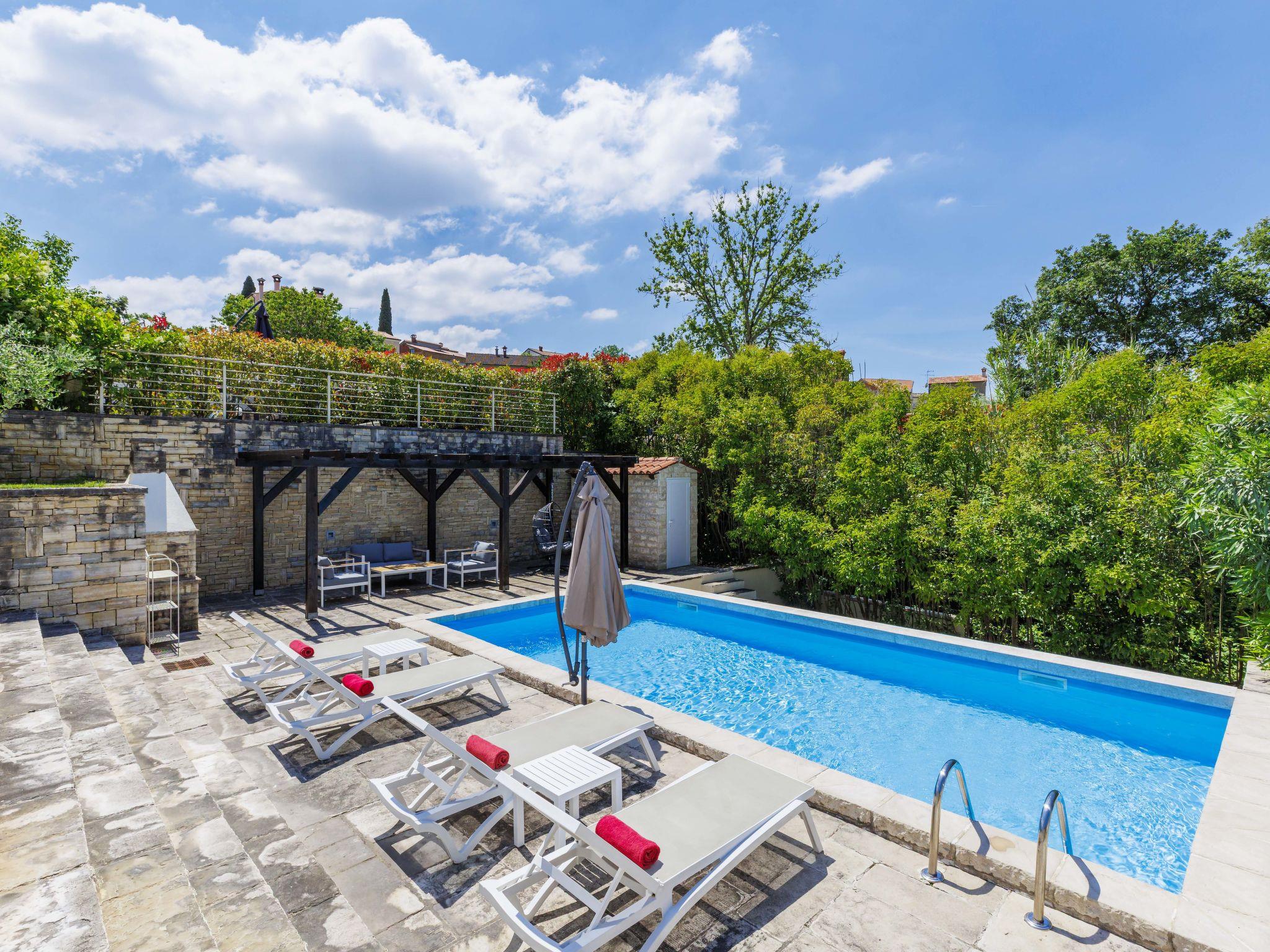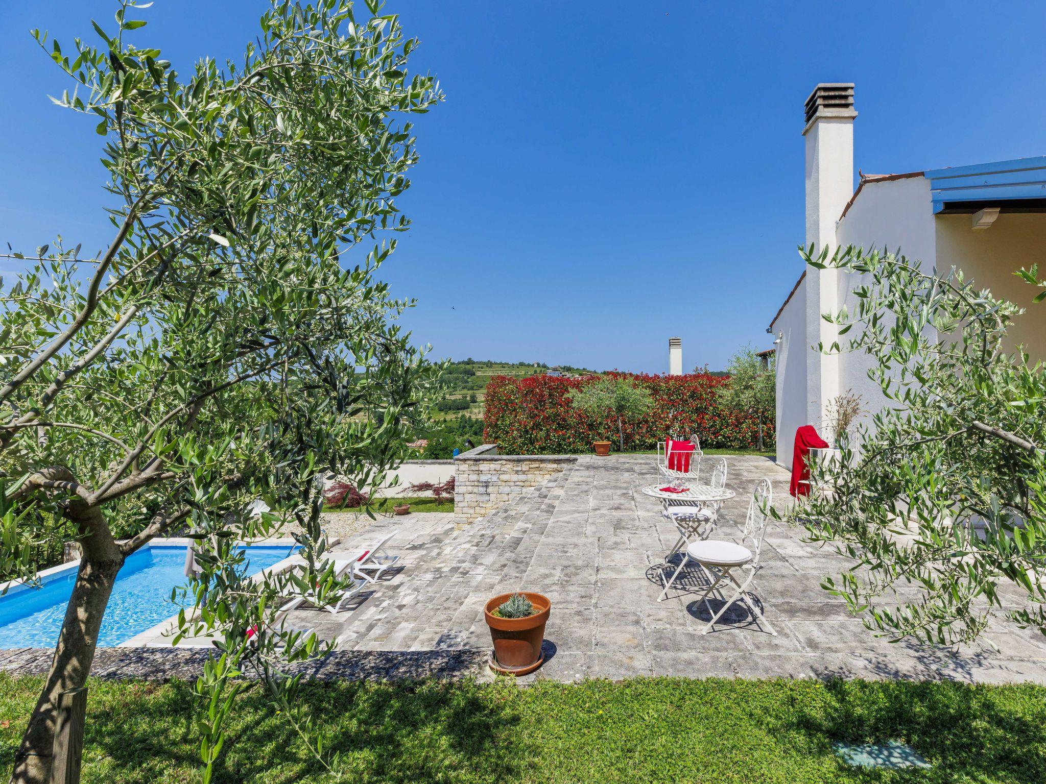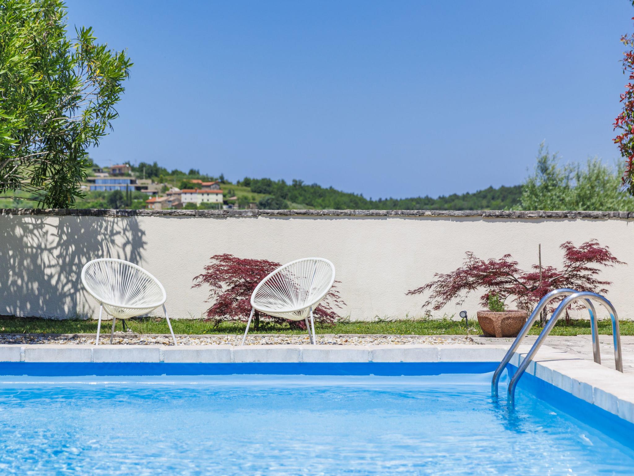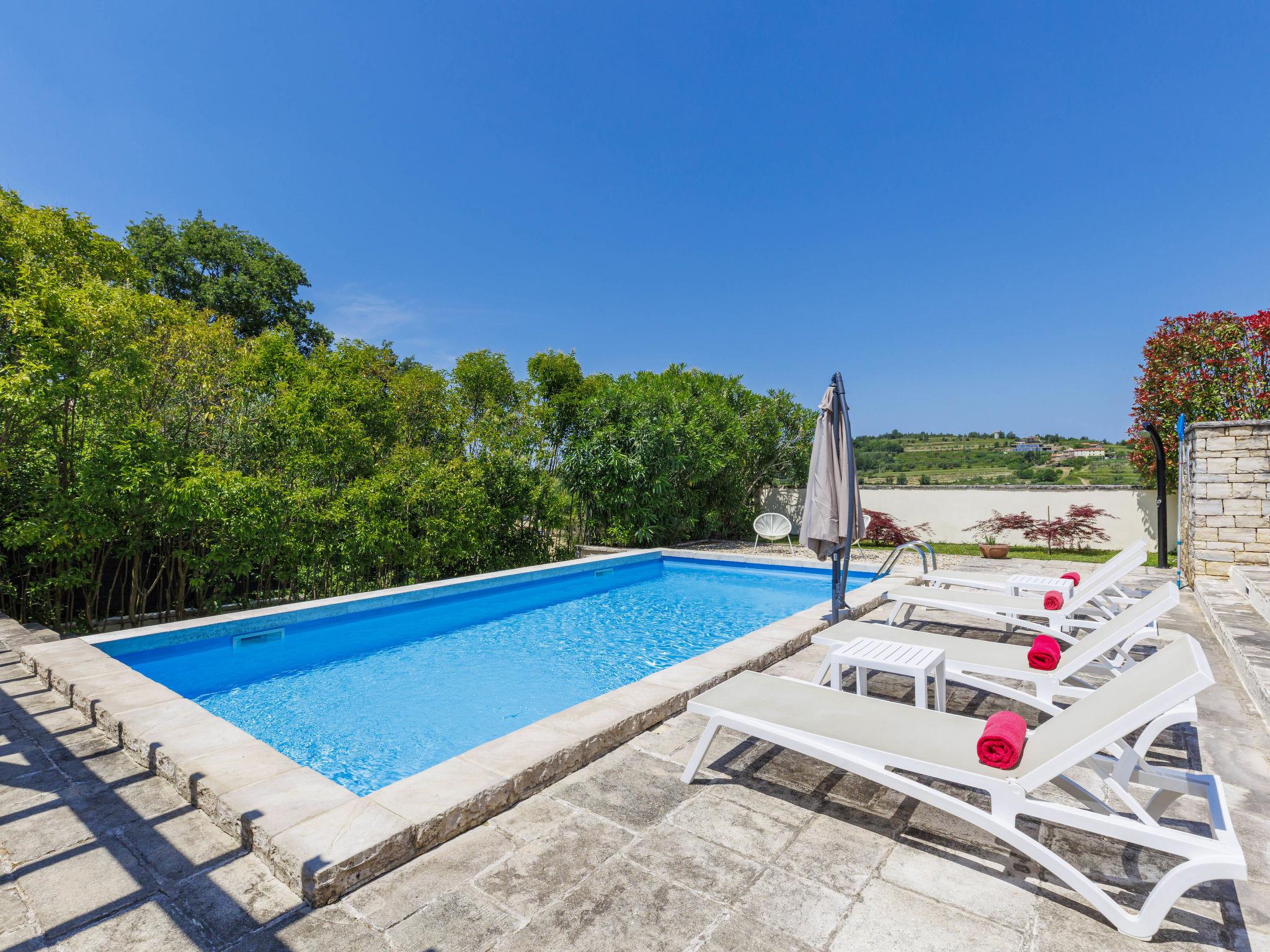 Momjan 5 km von Buje: Einfamilienhaus "Villa Samanta", auf 2 Stockwerken. Sonnige Lage, 17 km vom Meer. Zur Alleinbenutzung: Grundstück 500 m2 mit Rasen, Schwimmbad (8 x 4 m, 130 cm tief, saisonale Verfügbarkeit: 01.Mai. - 30.Sep.) mit Salzelektrolyse-Reinigungssystem. Aussendusche, Pergola (30 m2), Gartenmöbel, Grill. Im Hause: Internetzugang, Waschmaschine. Parkplatz (für 2 Autos) beim Haus auf dem Grundstück. Einkaufsgeschäft 200 m, Restaurant 150 m, Bushaltestelle 13.1 km, Kieselstrand 20 km, betonierter Strand 20 km. Wanderwege ab Haus 200 m, Radweg 250 m. Nahe gelegene Sehenswürdigkeiten: aquapark 16 km. Der Besitzer akzeptiert keine Jugendgruppen.