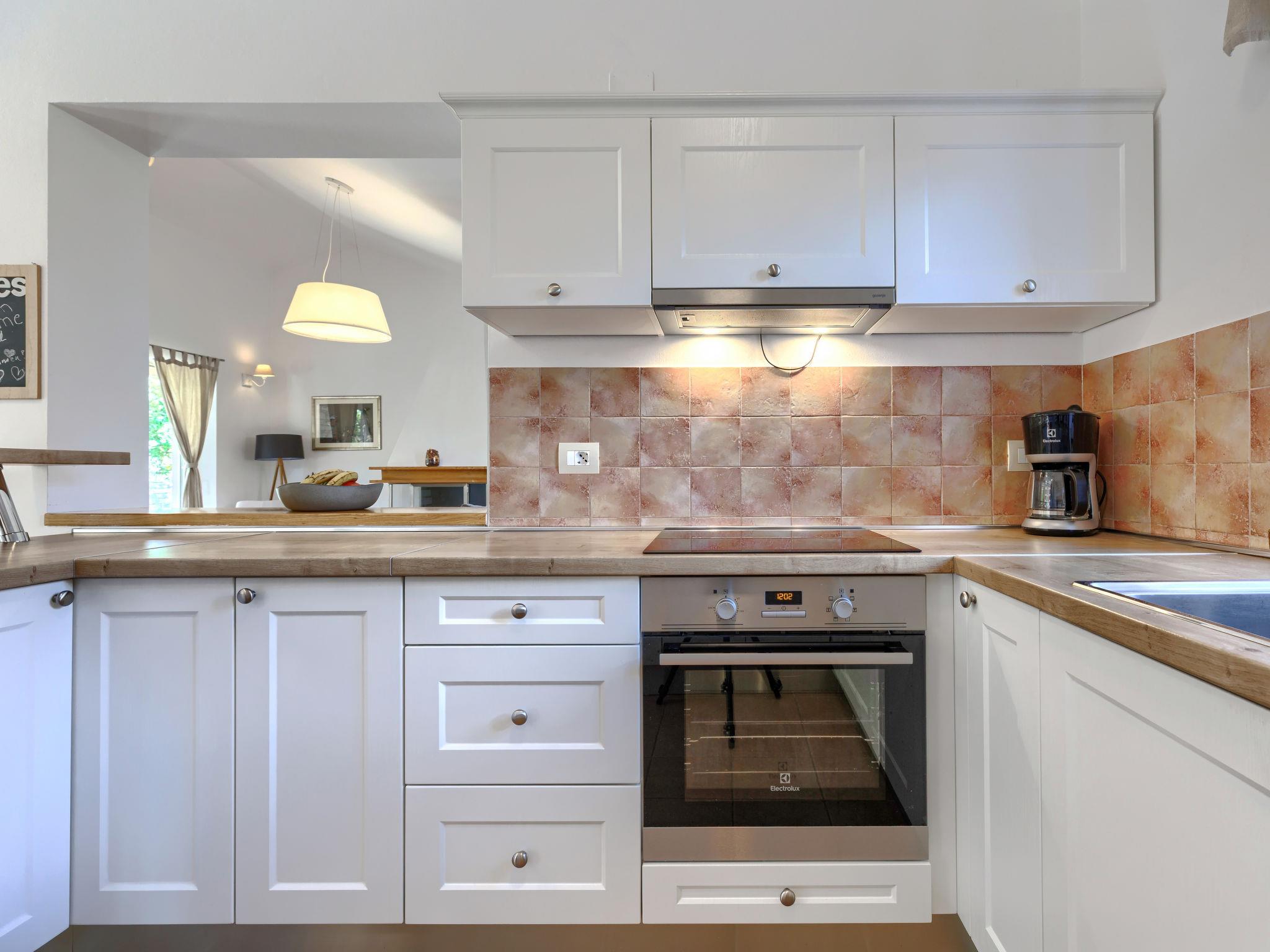 3-Zimmer-Haus 120 m2 auf 2 Stockwerken. Schön eingerichtet: Wohn-/Esszimmer mit 1 Diwanbett (120 cm, Länge 200 cm), Sat-TV (Flachbildschirm), Klimaanlage. Ausgang zur Terrasse. Offene Küche (Backofen, Geschirrspüler, 4 Glaskeramikplatten, Toaster, Wasserkocher, Mikrowelle, Tiefkühler, elektrische Kaffeemaschine). Dusche/Bidet/WC. Obergeschoss: 1 Zimmer mit 1 franz. Bett (160 cm, Länge 200 cm), Klimaanlage. 1 Zimmer mit 1 franz. Bett (160 cm, Länge 200 cm), Klimaanlage. Ausgang zum Balkon. Bad/Bidet/WC. Warmluftheizung. Kleiner Balkon 5 m2, Terrasse 30 m2. Terrassenmöbel, Liegestühle. Zur Verfügung: Bügeleisen, Haartrockner. Internet (Wireless LAN, gratis).