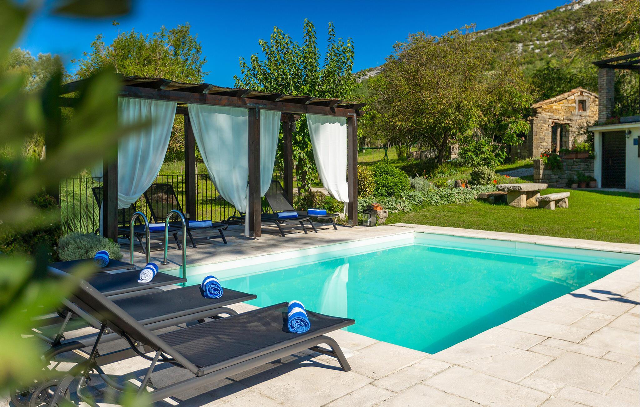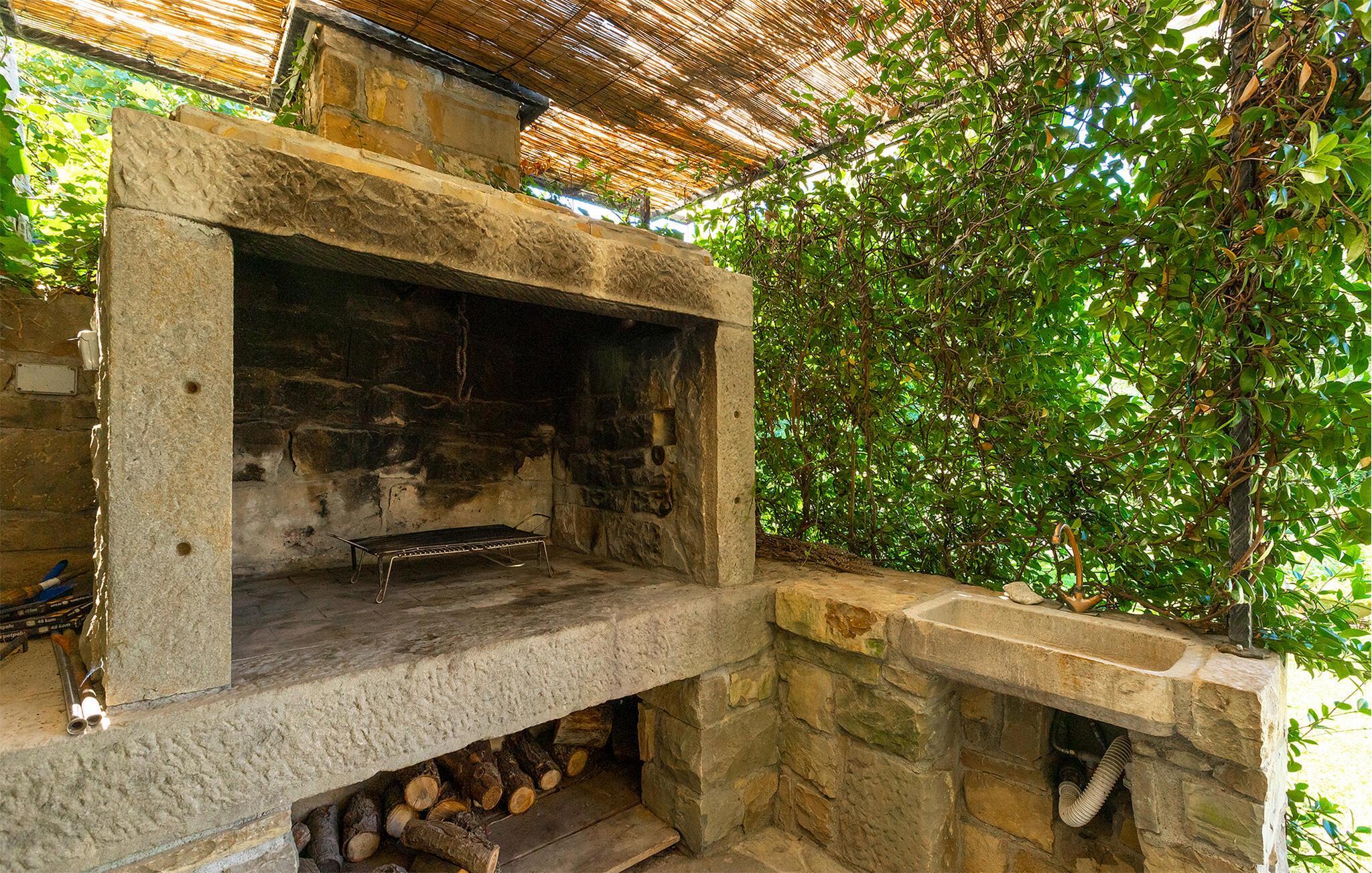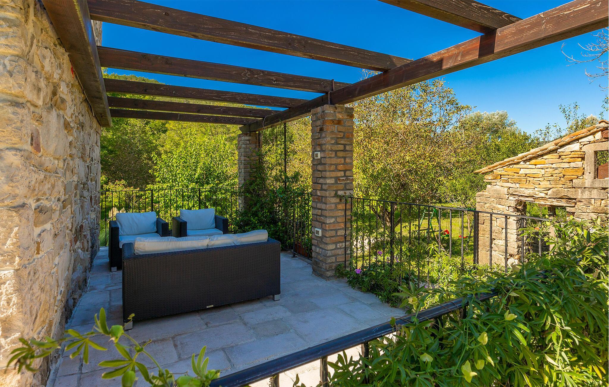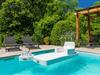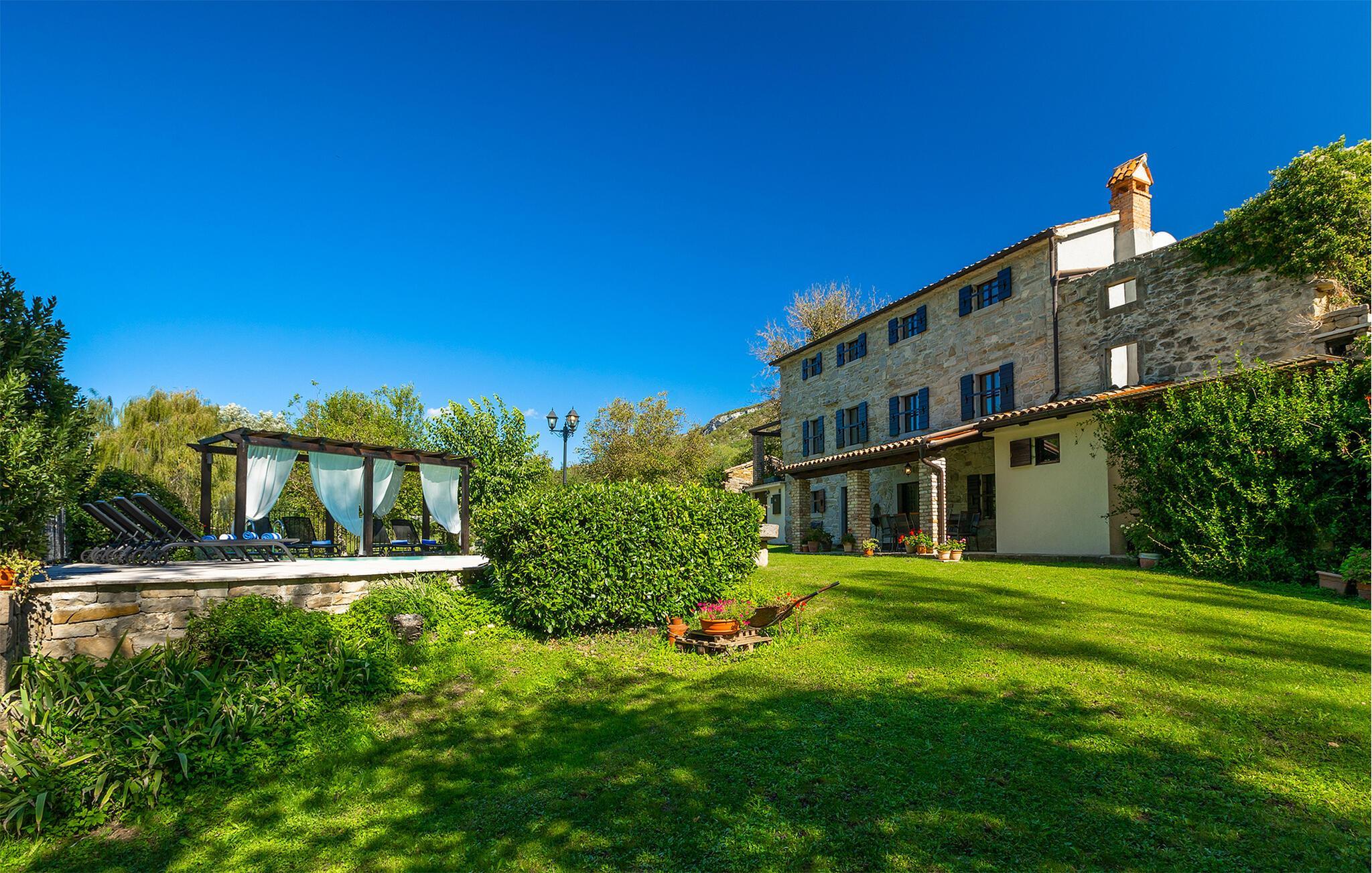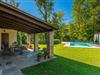 Vor der Villa können Sie sich im Pool abkühlen oder auf Liegestühlen Ihr Lieblingsgetränk trinken. In der ruhigen Atmosphäre der istrischen Umgebung werden Sie sich durch den Geräusch des Baches, der durch das Grundstück fließt, besonders entspannen. Auf der überdachten Terrasse vor der Villa genießen Sie Gerichte, die auf einem Steingrill im Garten zubereitet werden.