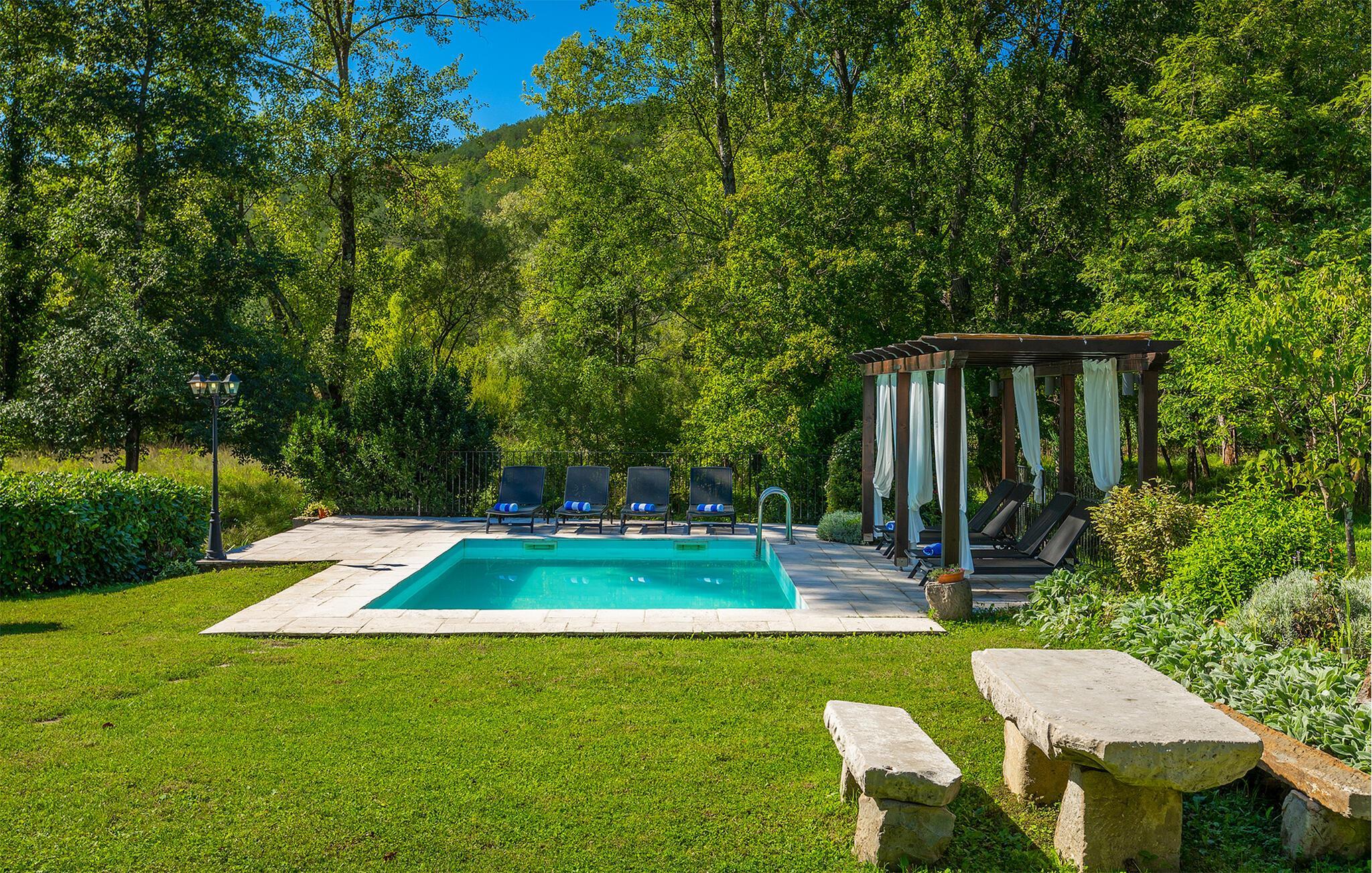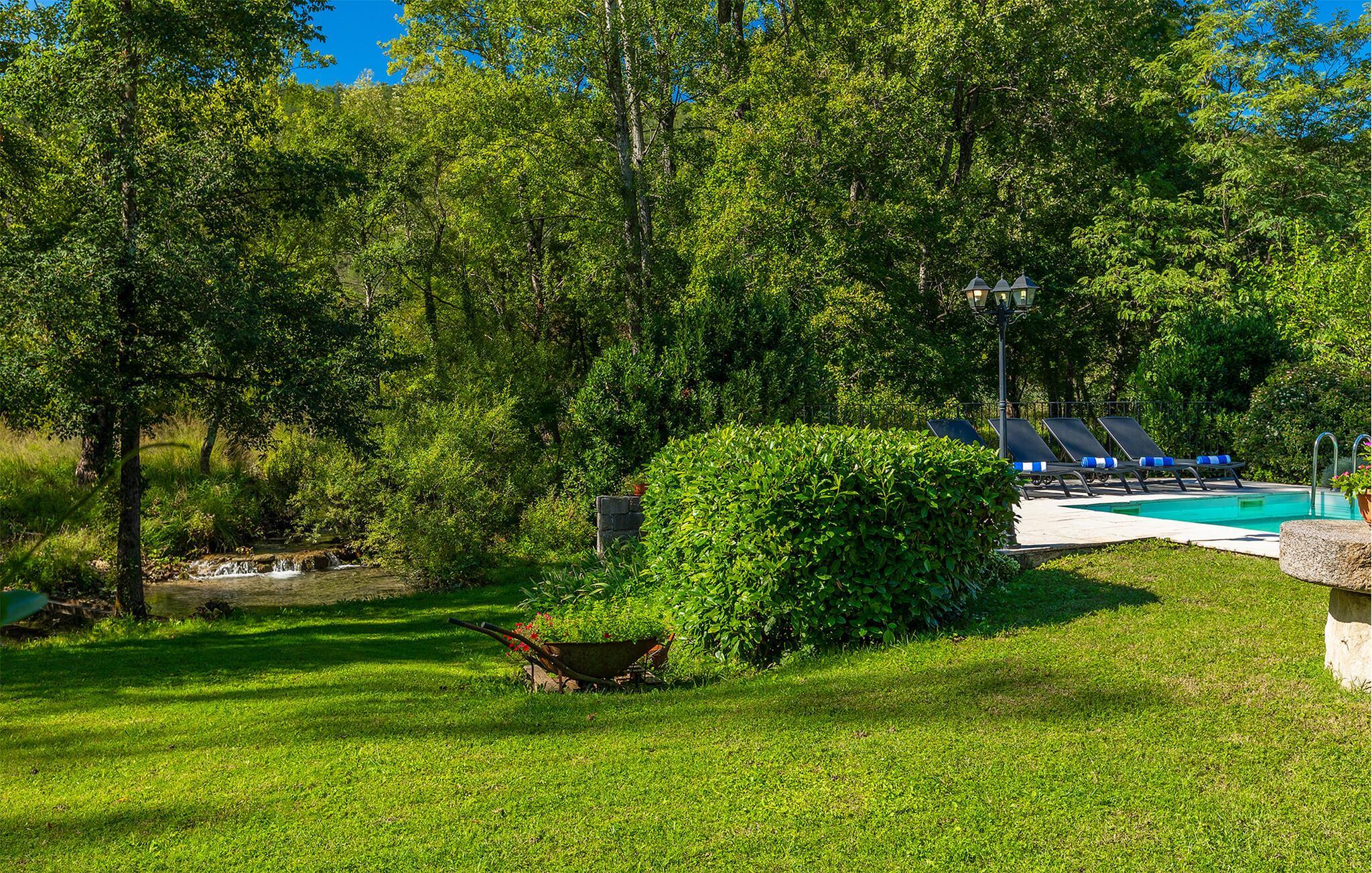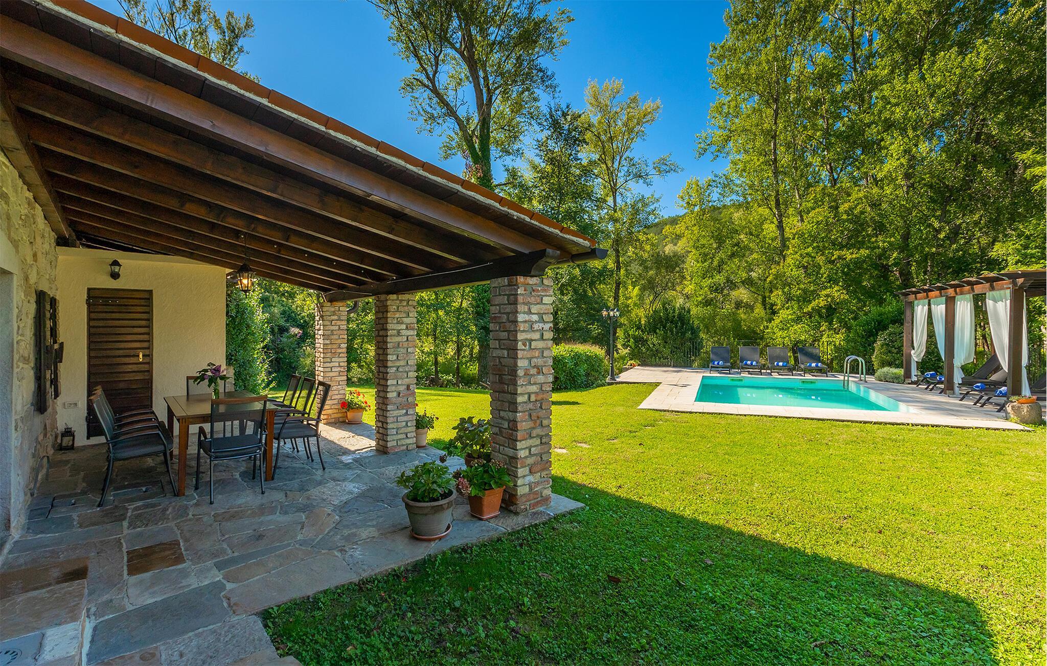Vor der Villa können Sie sich im Pool abkühlen oder auf Liegestühlen Ihr Lieblingsgetränk trinken. In der ruhigen Atmosphäre der istrischen Umgebung werden Sie sich durch den Geräusch des Baches, der durch das Grundstück fließt, besonders entspannen. Auf der überdachten Terrasse vor der Villa genießen Sie Gerichte, die auf einem Steingrill im Garten zubereitet werden.