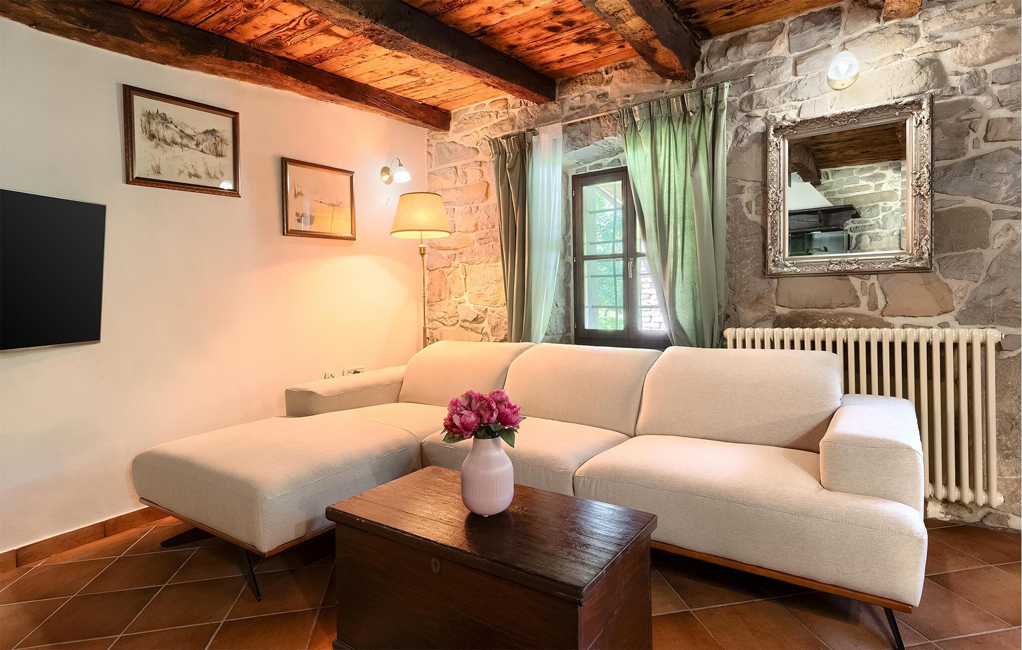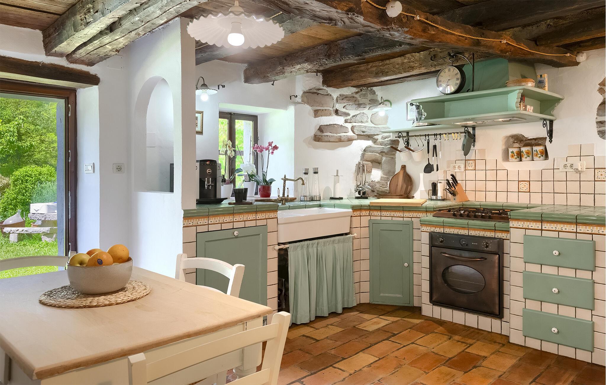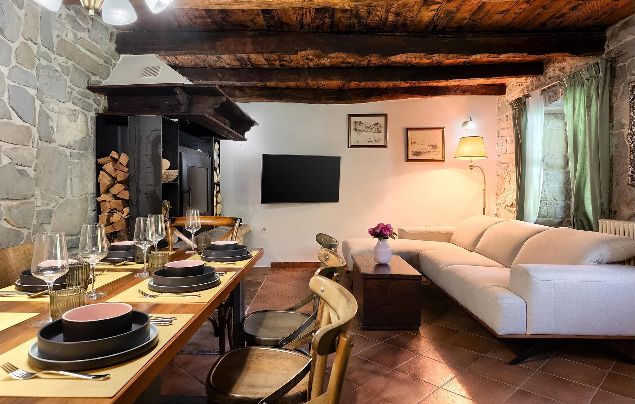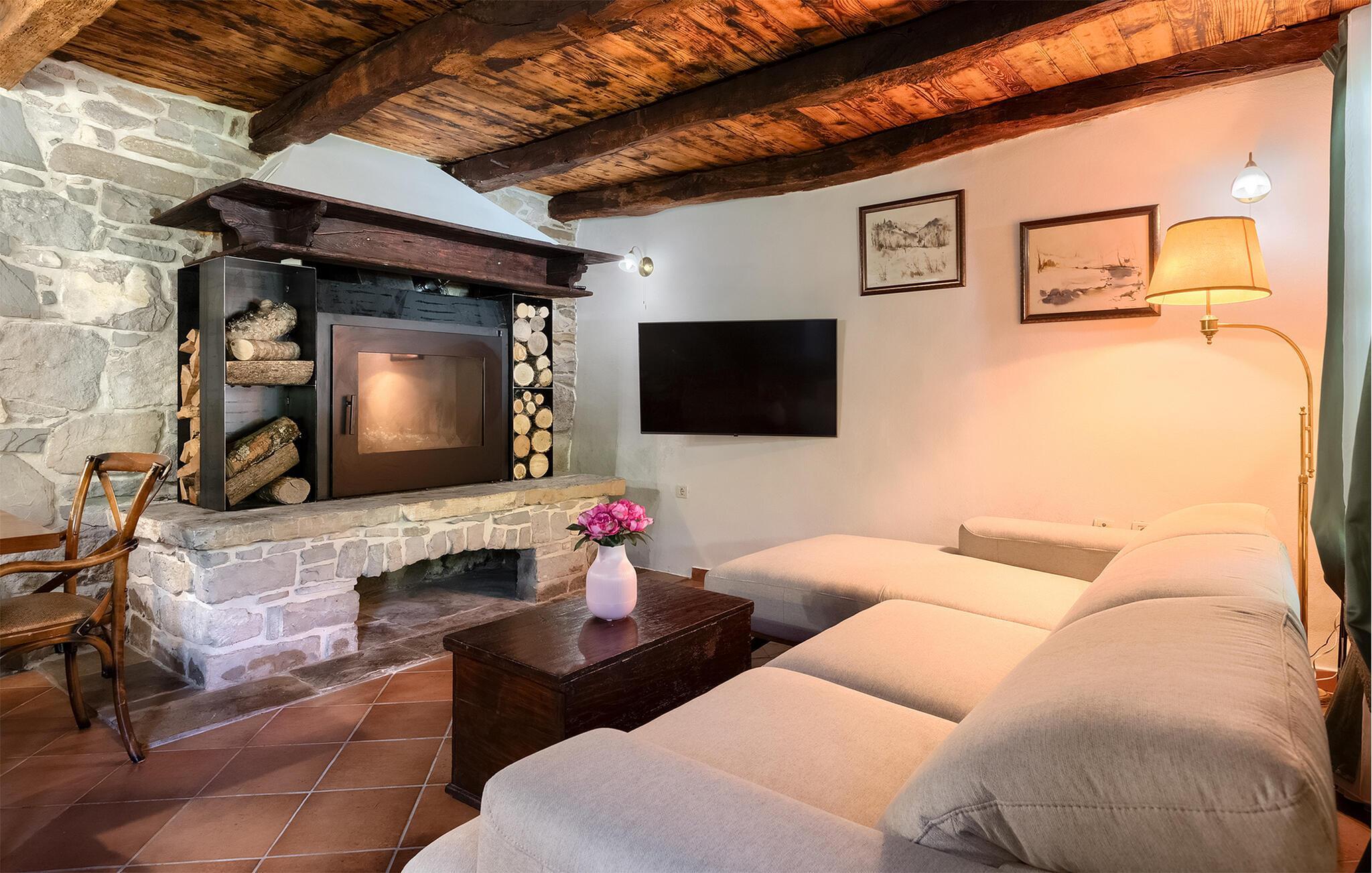 Im Inneren der Villa wurde das Aussehen authentischer istrischer Häuser mit Steinmauern und Holzdecken bewahrt, und dementsprechend ist auch das Wohnzimmer mit dem Kamin eingerichtet. Das Wohnzimmer bietet auch einen Zugang zur Terrasse. Vom Wohnzimmer aus erstreckt sich ein Esszimmer, durch das Sie eine charmante Küche betreten. Diese charmante, mit pastellgrünen Tönen in Kombination mit Holz und Stein dekorierte Küche wird Sie besonders begeistern.