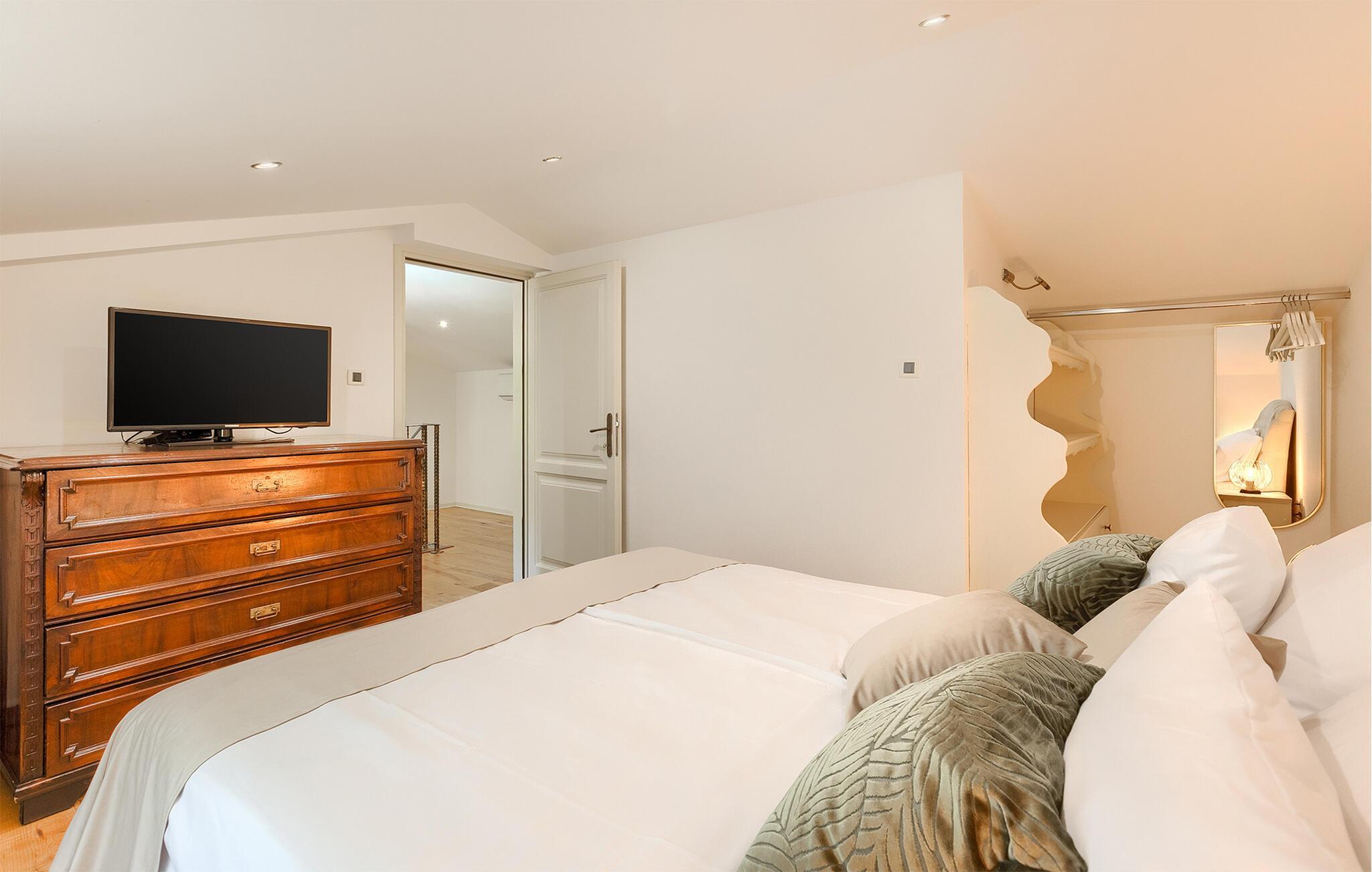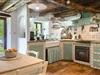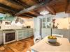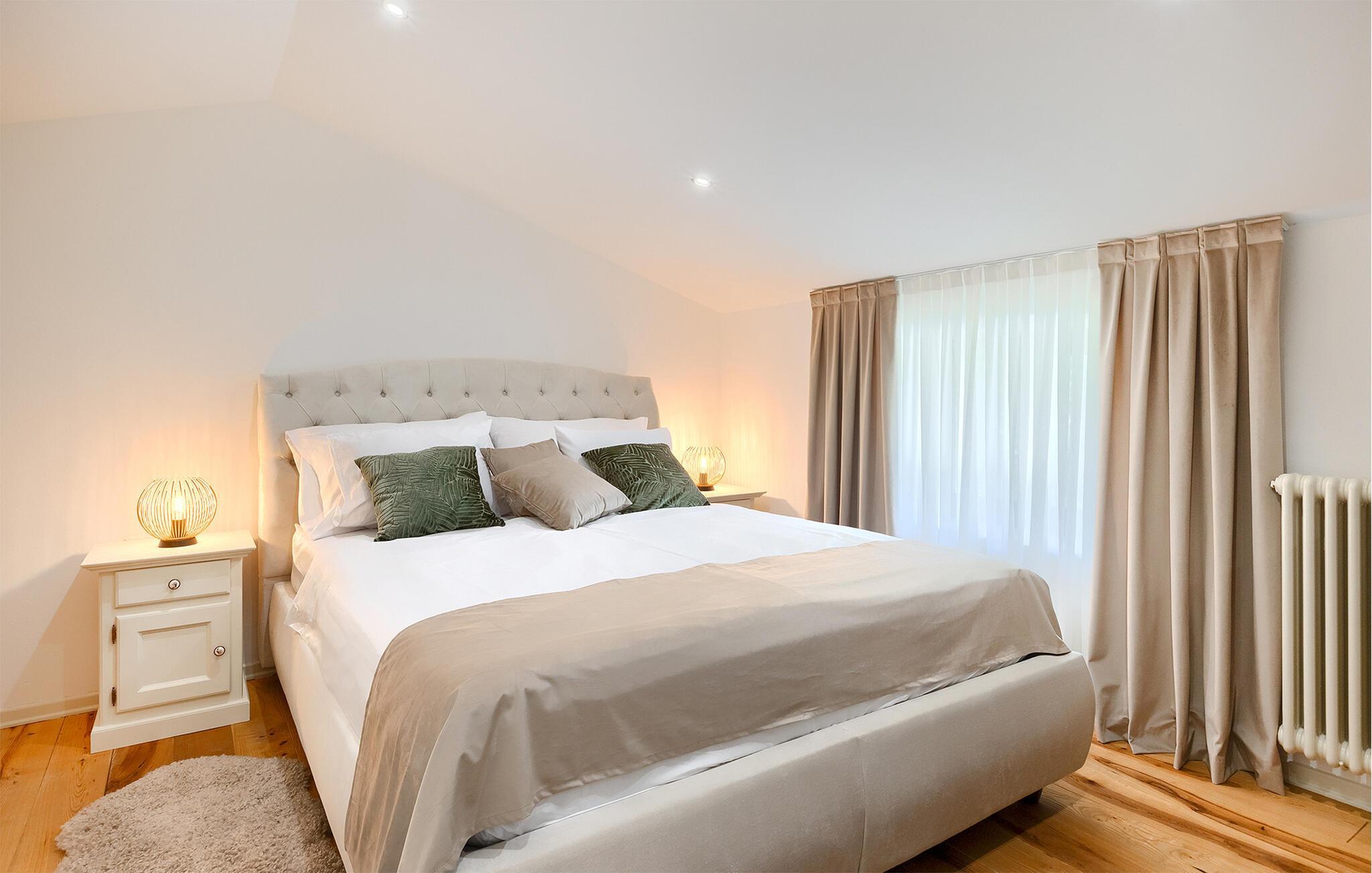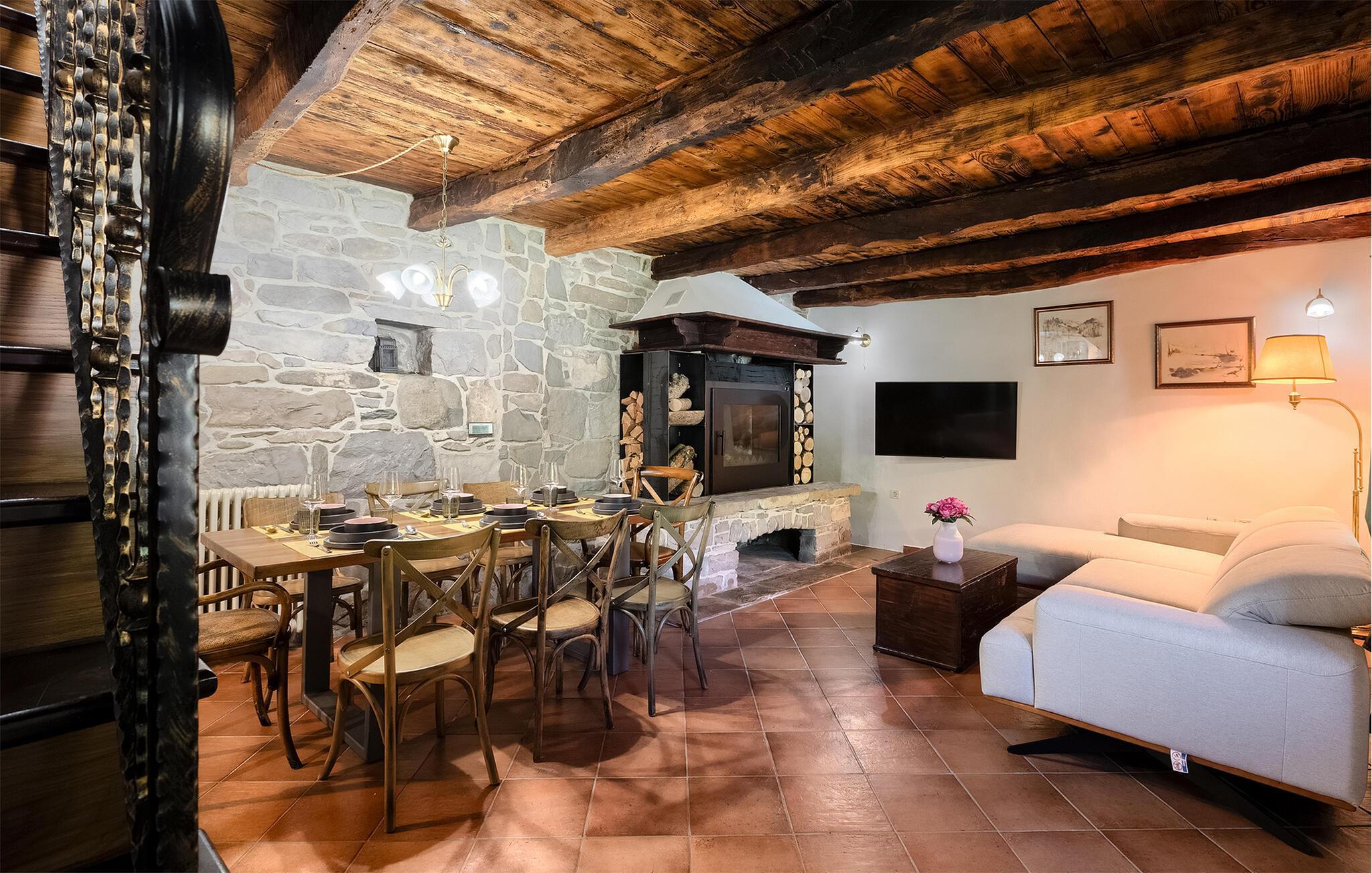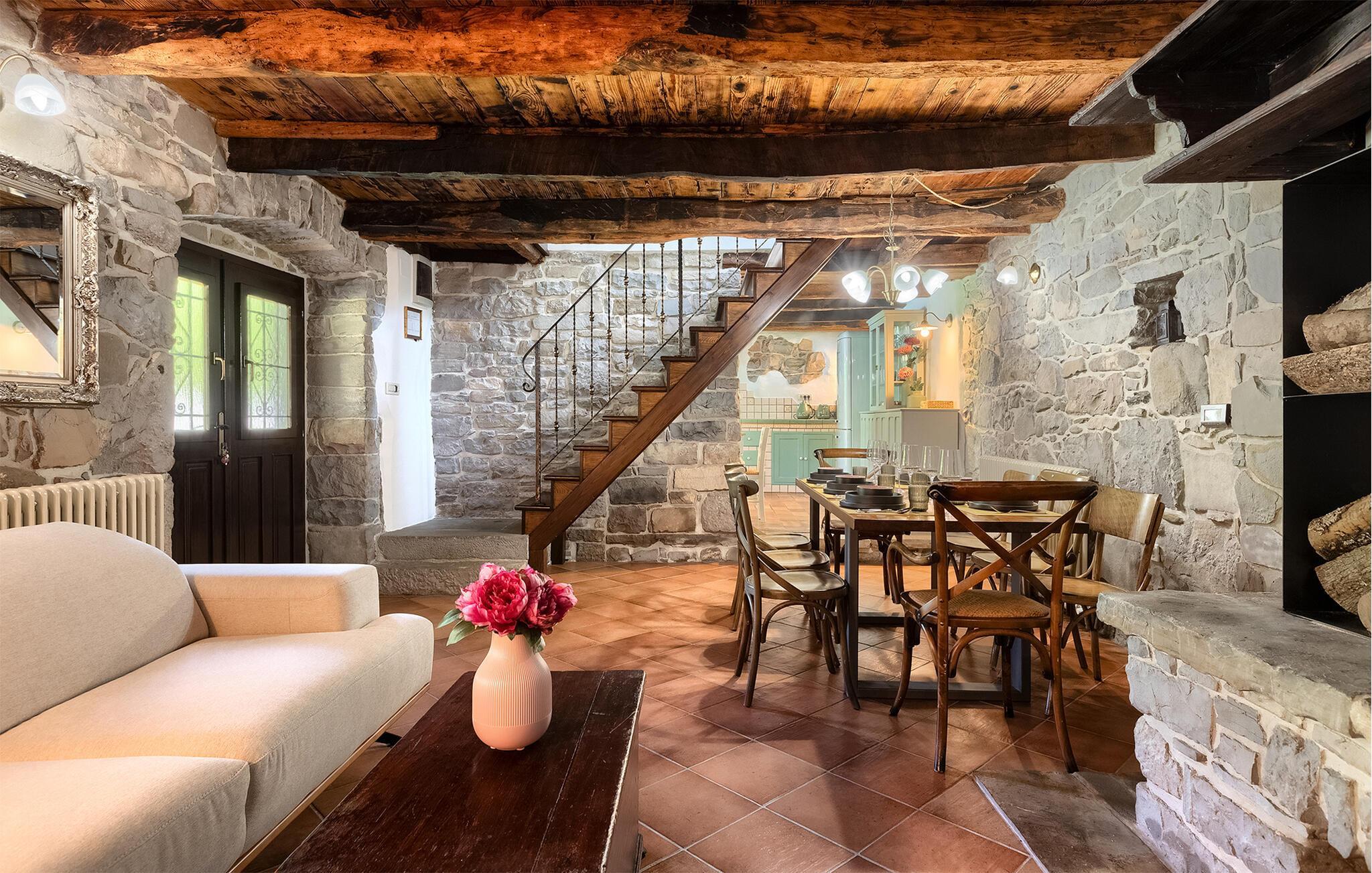 Im Inneren der Villa wurde das Aussehen authentischer istrischer Häuser mit Steinmauern und Holzdecken bewahrt, und dementsprechend ist auch das Wohnzimmer mit dem Kamin eingerichtet. Das Wohnzimmer bietet auch einen Zugang zur Terrasse. Vom Wohnzimmer aus erstreckt sich ein Esszimmer, durch das Sie eine charmante Küche betreten. Diese charmante, mit pastellgrünen Tönen in Kombination mit Holz und Stein dekorierte Küche wird Sie besonders begeistern.