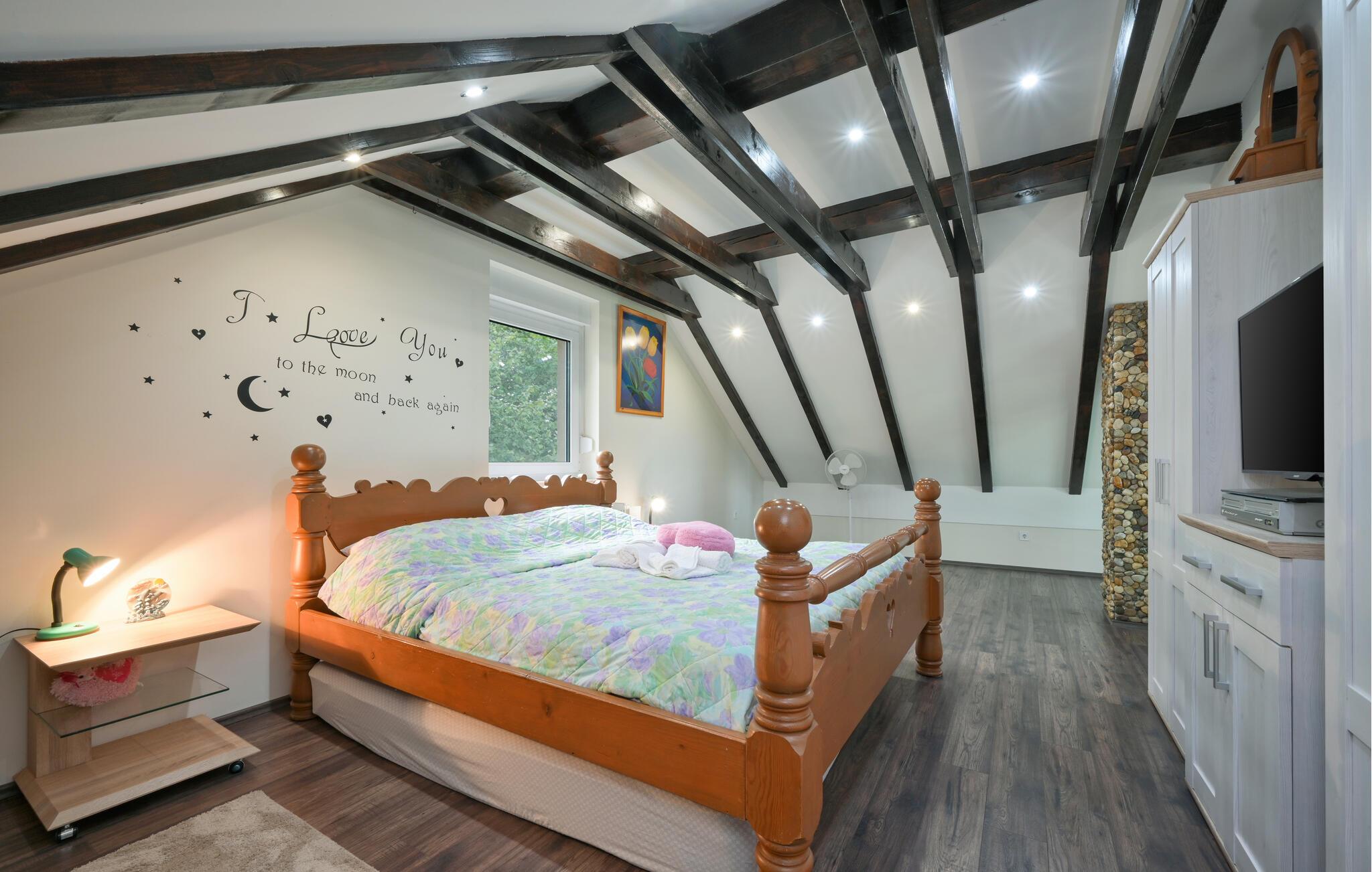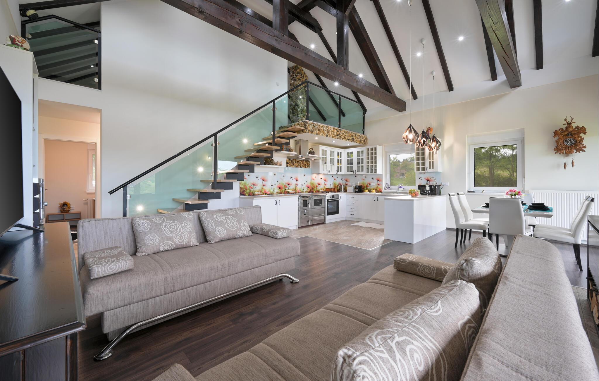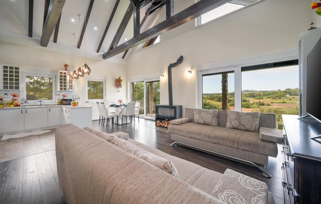 Genießen Sie hier eine harmonische Kombination aus hellen Räumen und dunklen Deckenbalken, die für Entspannung sorgt. Erfreuen Sie sich an der schönen Aussicht und genießen Sie bei den gemeinsamen Mahlzeiten den Blick ins Freie. Machen Sie es sich nach einem spannenden Tag auf dem Sofa bequem und sorgen Sie mit einem Feuer im Kaminofen für eine gemütliche Stimmung.