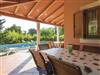 Das Haus ist ein Fertighaus und hat ein Erdgeschoss und einen ersten Stock. Im Sommer ist es ein komfortabler und erfrischender Aufenthaltsort, der durch die Klimaanlage auf beiden Etagen zusätzlich gekühlt werden kann. Das Haus im Erdgeschoss verfügt über eine überdachte Terrasse von 40 m2 mit Esstisch und Tischtennisplatte für die Unterhaltung, direkt neben der Küche, mit Blick auf den Pool.