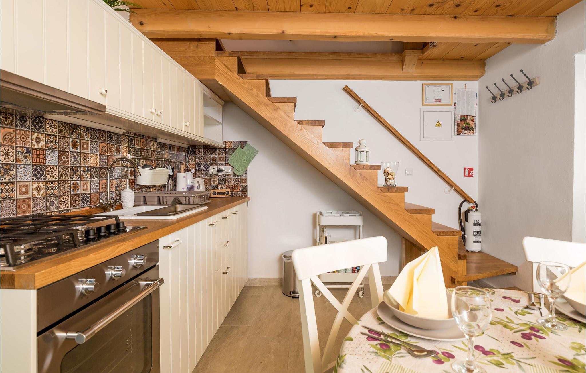 Schon beim Betreten des Hauses macht sich Urlaubsstimmung breit. Die gemütliche Einrichtung heißt Sie willkommen und sichtbare Deckenbalken aus Holz runden den urigen Charme dieser Unterkunft ab. Eine offene Treppe verbindet die Etagen und die beiden Schlafzimmer haben keine Türen.