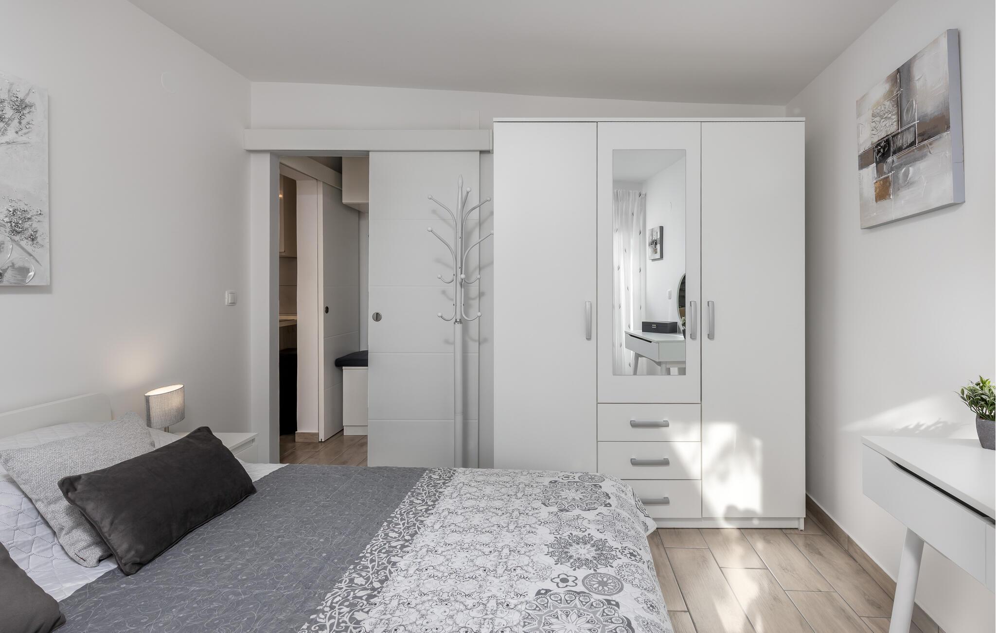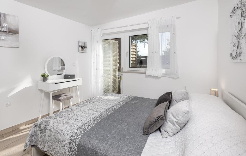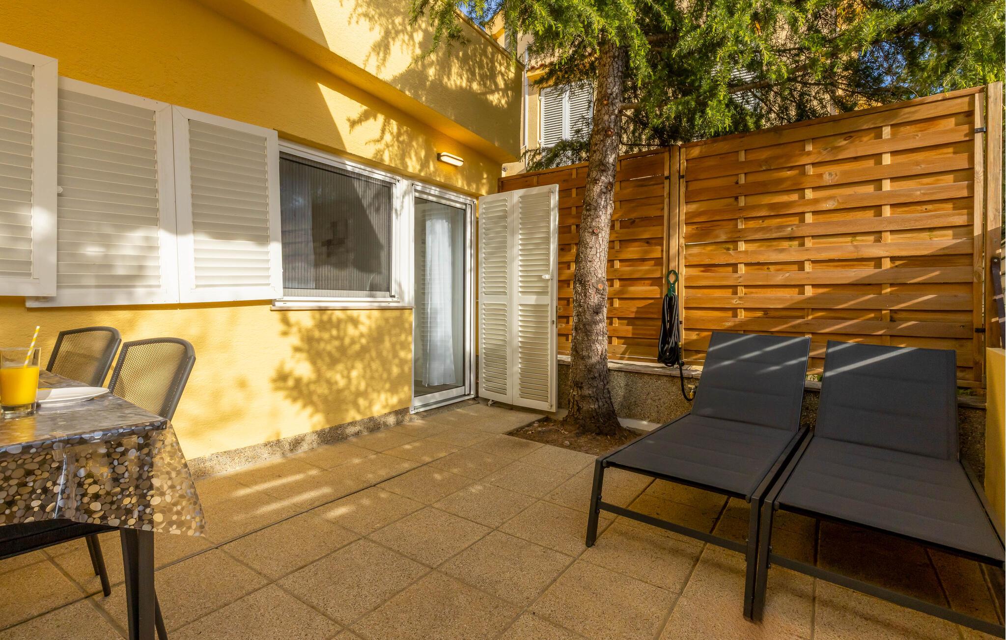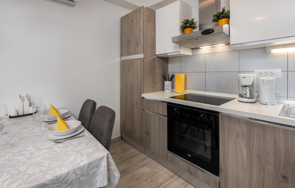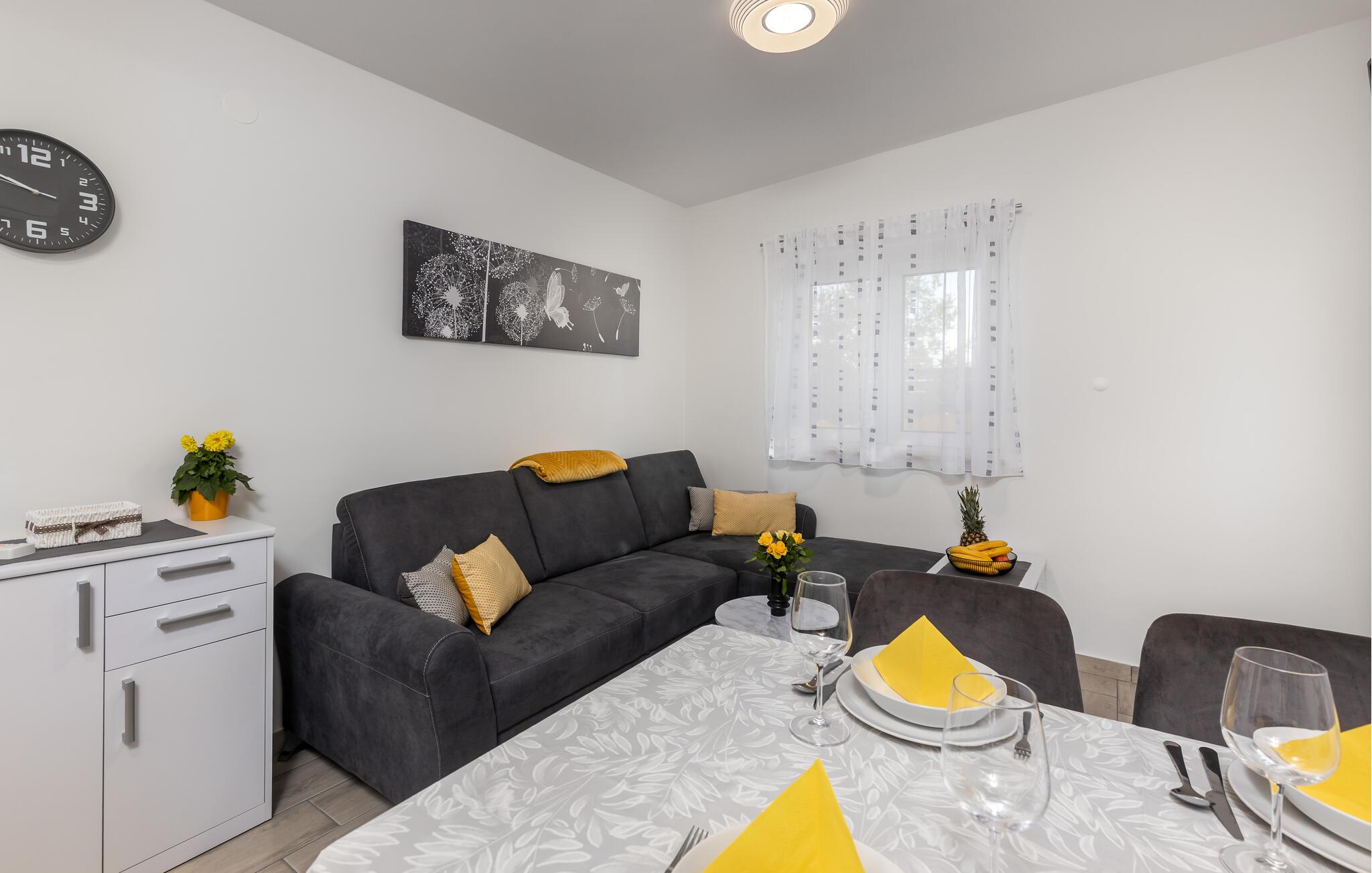 Nur wenige Schritte von einer erfrischenden Badegelegenheit entfernt, bietet Ihnen diese moderne und gepflegte Ferienwohnung ein behagliches Refugium für einen sonnigen Urlaub an der Adria. Bereiten Sie in der offenen Küche kulinarische Köstlichkeiten zu und genießen Sie diese am einladenden Esstisch. Entspannen Sie nach einem langen Tag auf dem gemütlichen Sofa und widmen Sie sich einem guten Buch oder einem spannenden Gesellschaftsspiel.