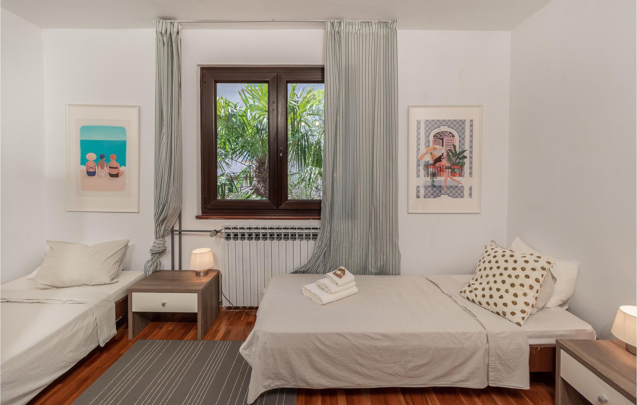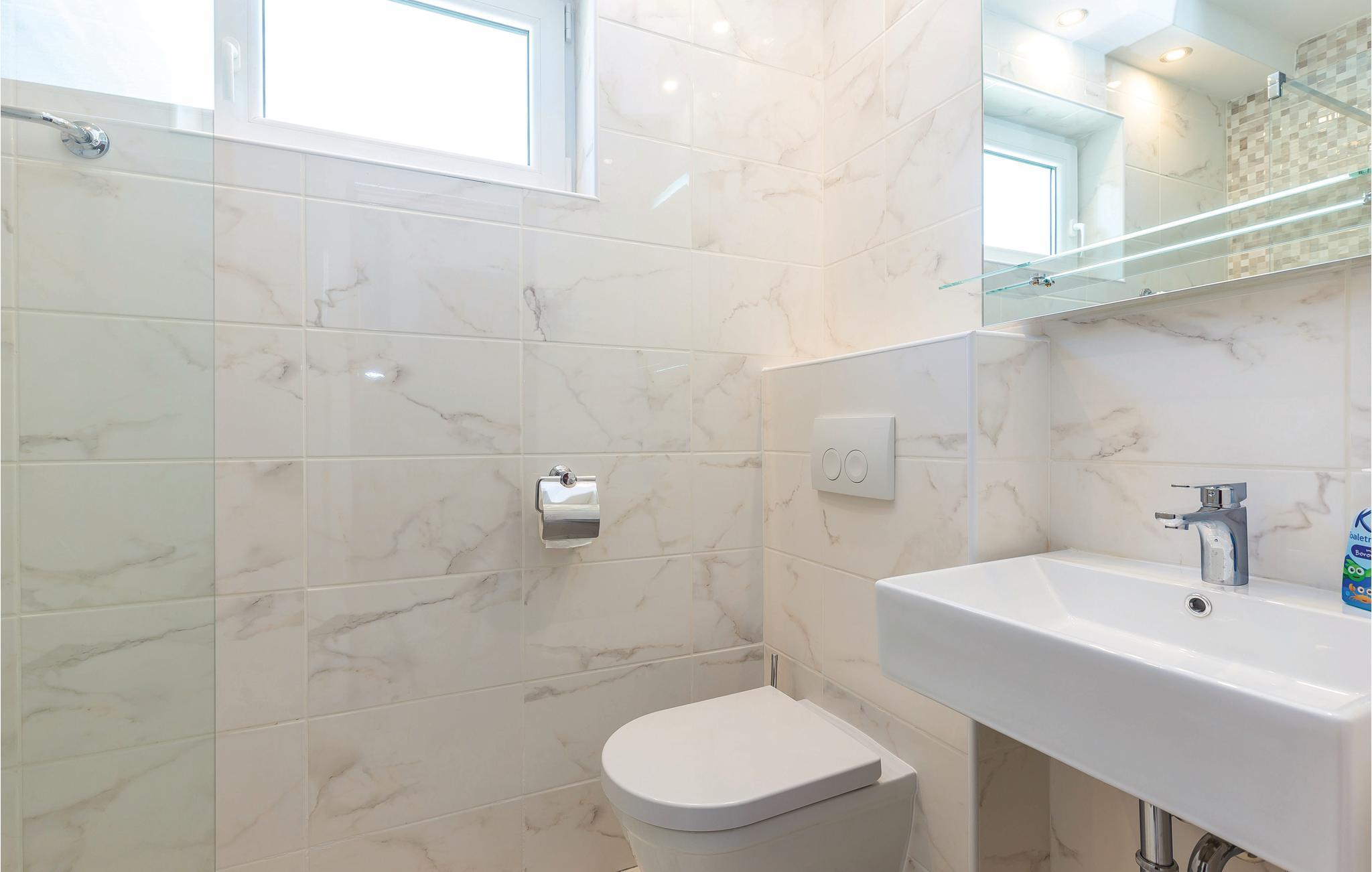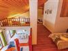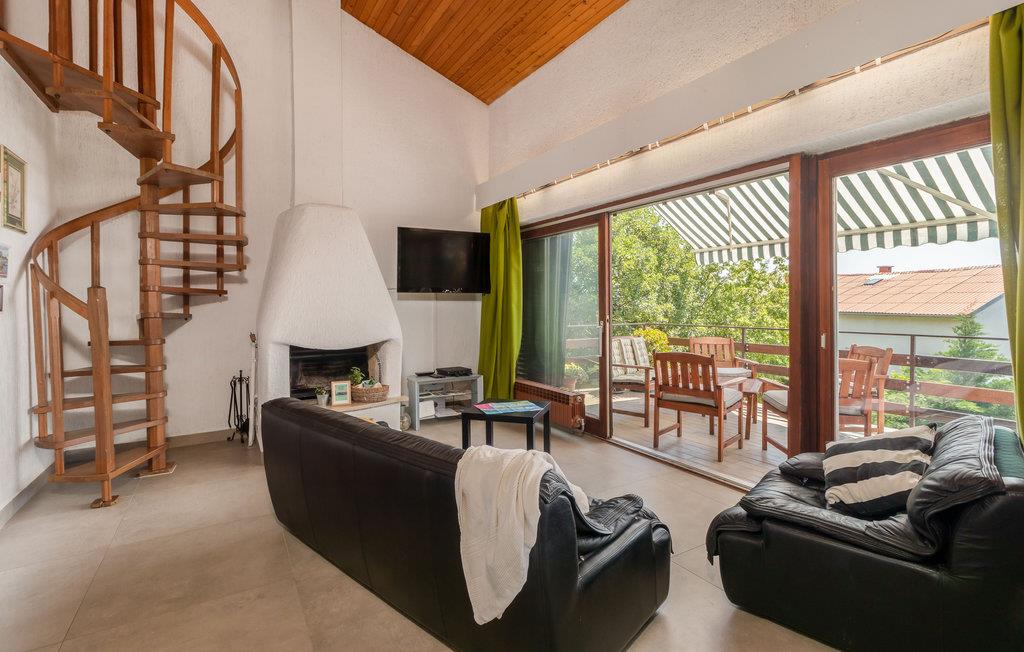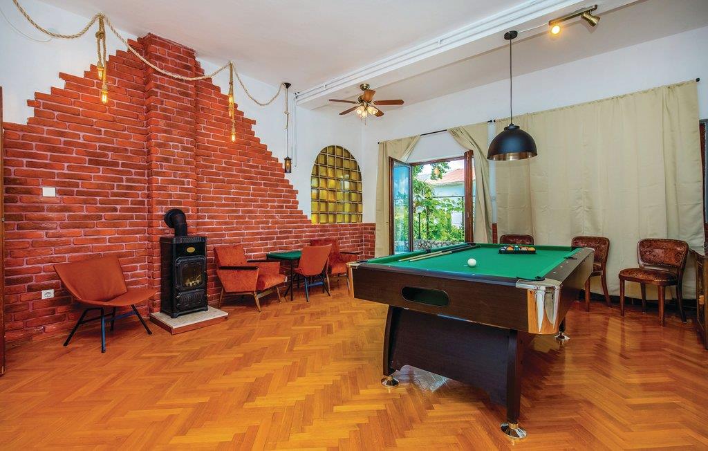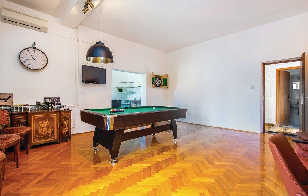 Dieses Ferienhaus im ruhigen Ort Dramlj ist gut für eine Gruppe von Freunden oder mehr Familien geeignet. Es ist einfach eingerichtet und vom geräumigen Wohnbereich kommt man auf die Terrasse. Zwei Schlafzimmer befinden sich im Erdgeschoss während noch zwei im Zwischengeschoss sind. Gleichzeitig befinden sich noch vier Schlafmöglichkeiten auf der Galerie, die über dem Wohnbereich ist und zu der eine steile Wendeltreppe führt. Dort beträgt die minimale Deckenhöhe ca. 120 cm. Ab 2018 gibt es ein Badebassin im Freien.