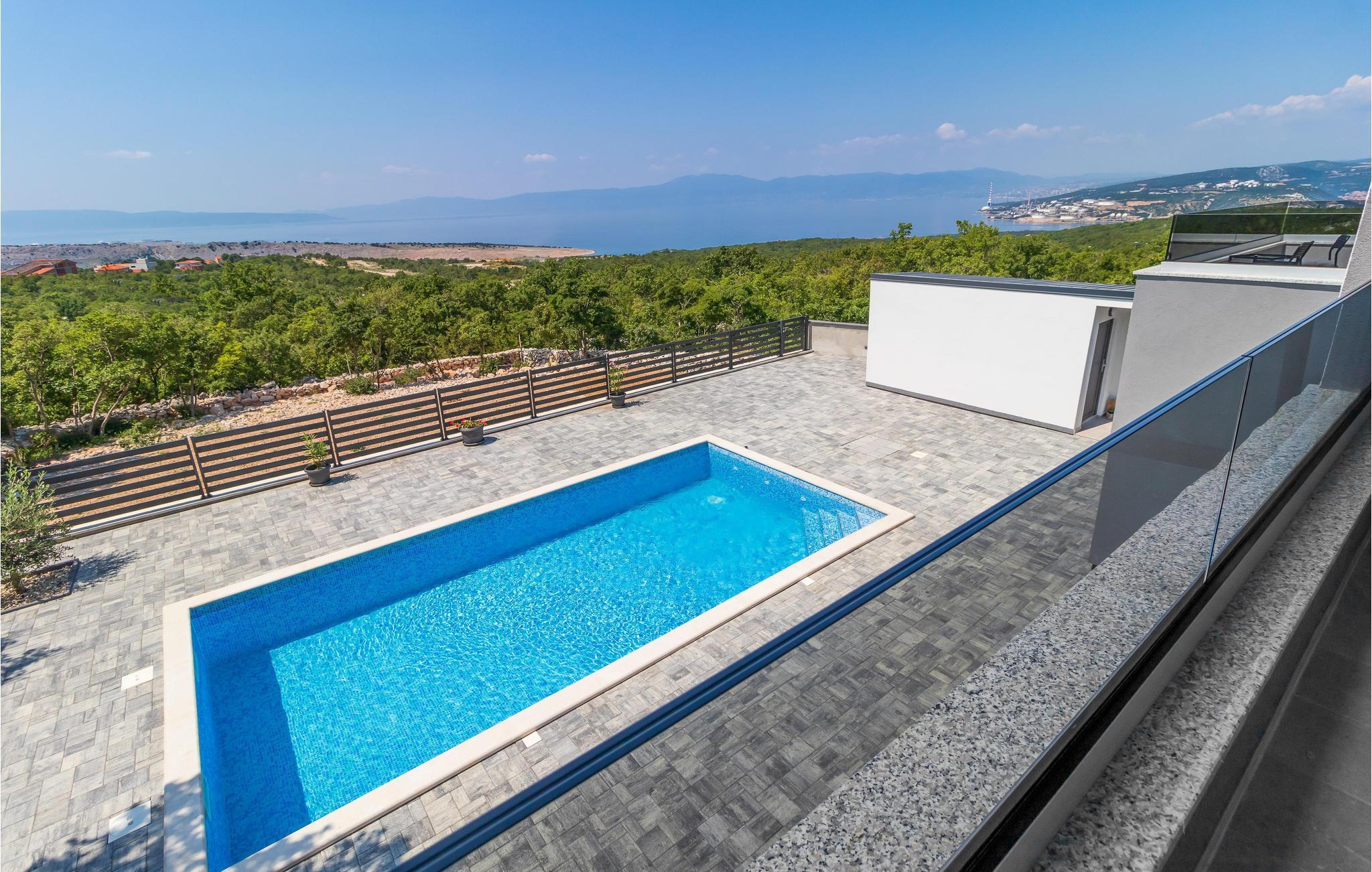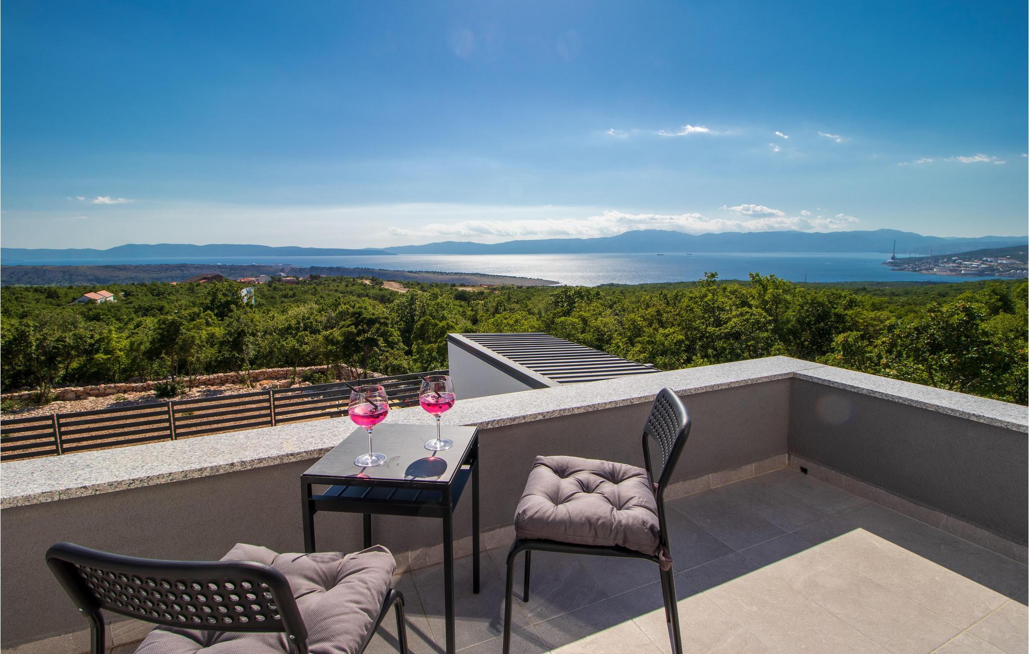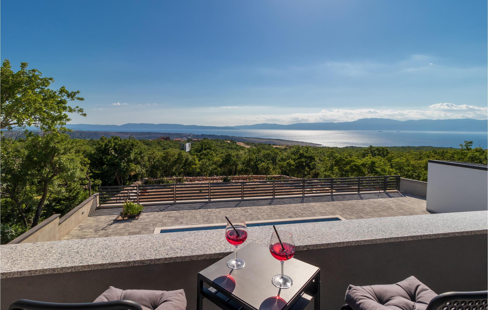 Draußen lädt die große Terrasse mit Pool zum Entspannen in der Sonne ein. Von einem der Balkone bietet sich Ihnen ein spektakulärer Blick auf die Insel Krk und die Kvarner-Bucht - ideal, um den Alltag hinter sich zu lassen.