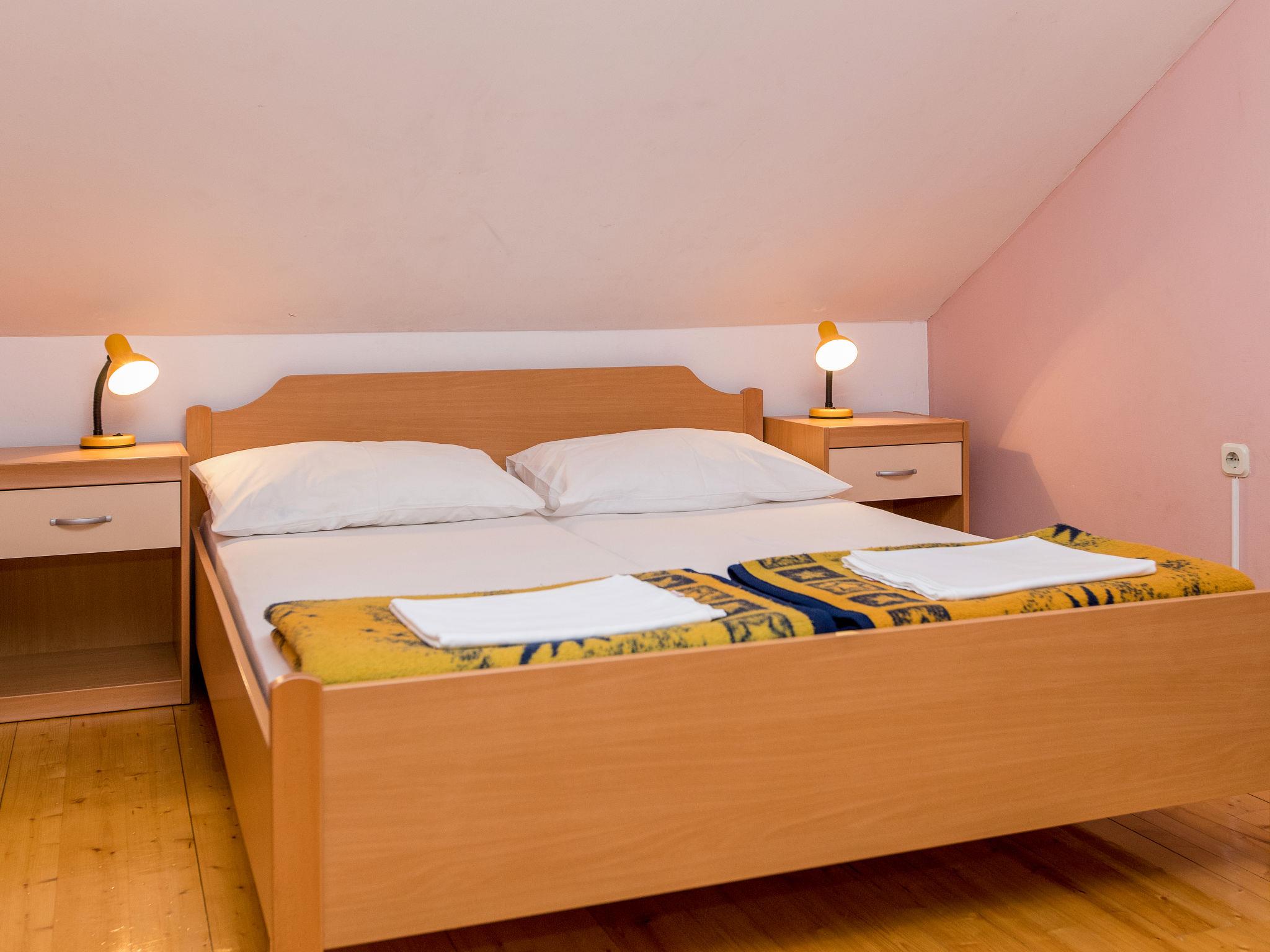 "Villa Anna", 3-Zimmer-Wohnung 60 m2, im Dachgeschoss. Offenes Wohn-/Esszimmer mit Esstisch, Sat-TV und Klimaanlage. Ausgang zum Balkon. 1 Zimmer mit 1 Doppelbett (2 x 80 cm, Länge 200 cm). Abgeschrägte, offene Galerie mit 2 Betten (90 cm, Länge 200 cm), 1 Doppelbett (2 x 80 cm, Länge 200 cm). Offene Küche (4 Kochplatten, Geschirrspüler, Toaster, Wasserkocher, Mikrowelle, elektrische Kaffeemaschine). Dusche/WC, sep. WC. Heizung (extra), Klimaanlage (extra). Balkon 9 m2. Balkonmöbel. Zur Verfügung: Internet (Wireless LAN, gratis). Parkplatz. Bitte beachten: Nichtraucher-Unterkunft.