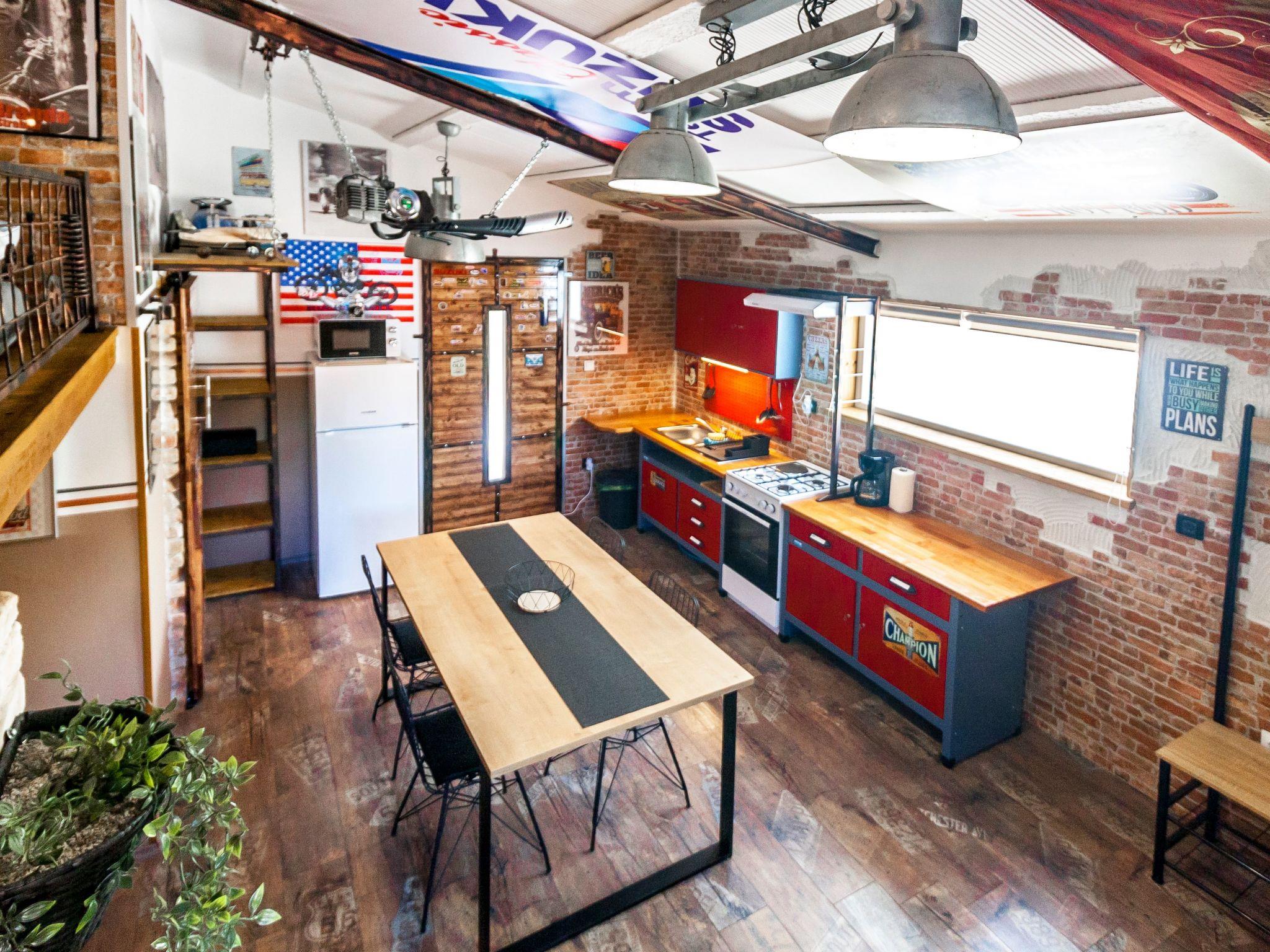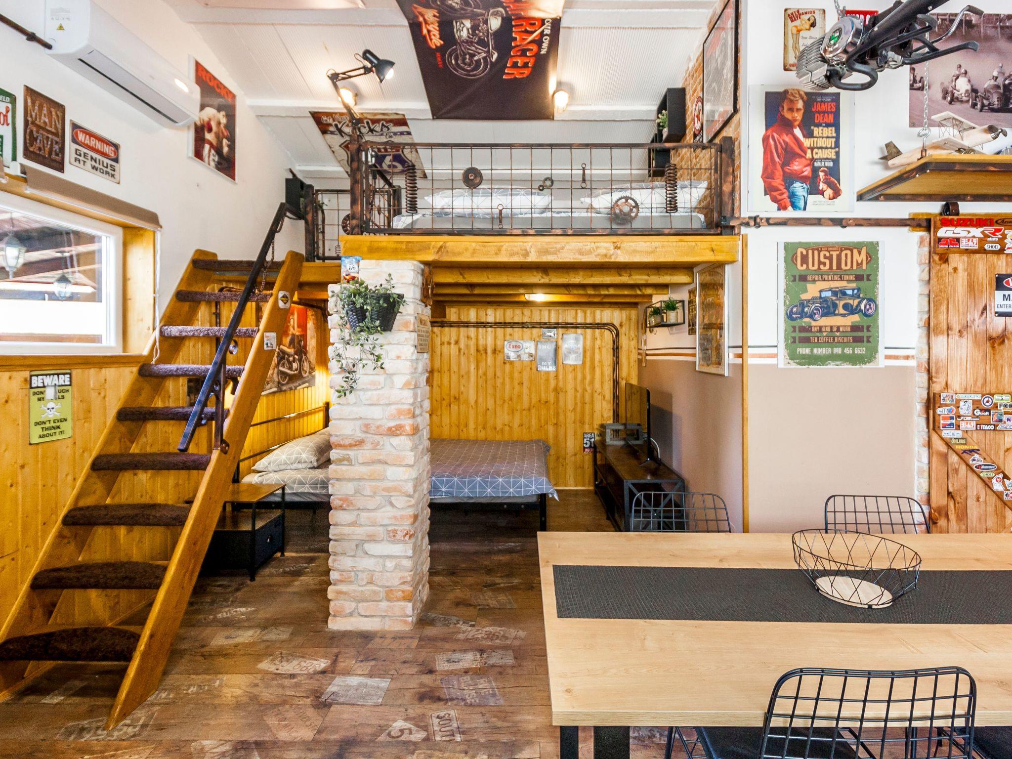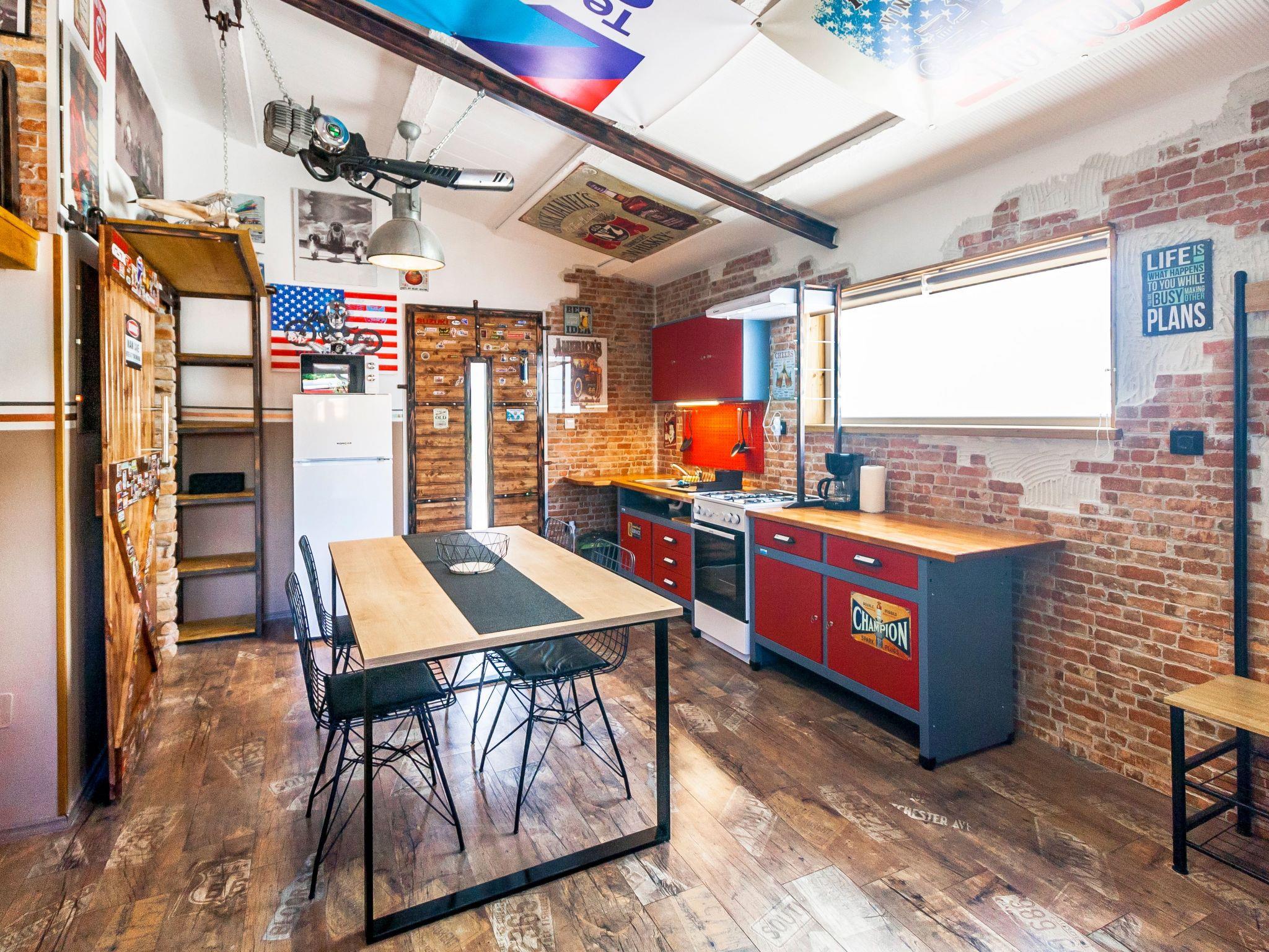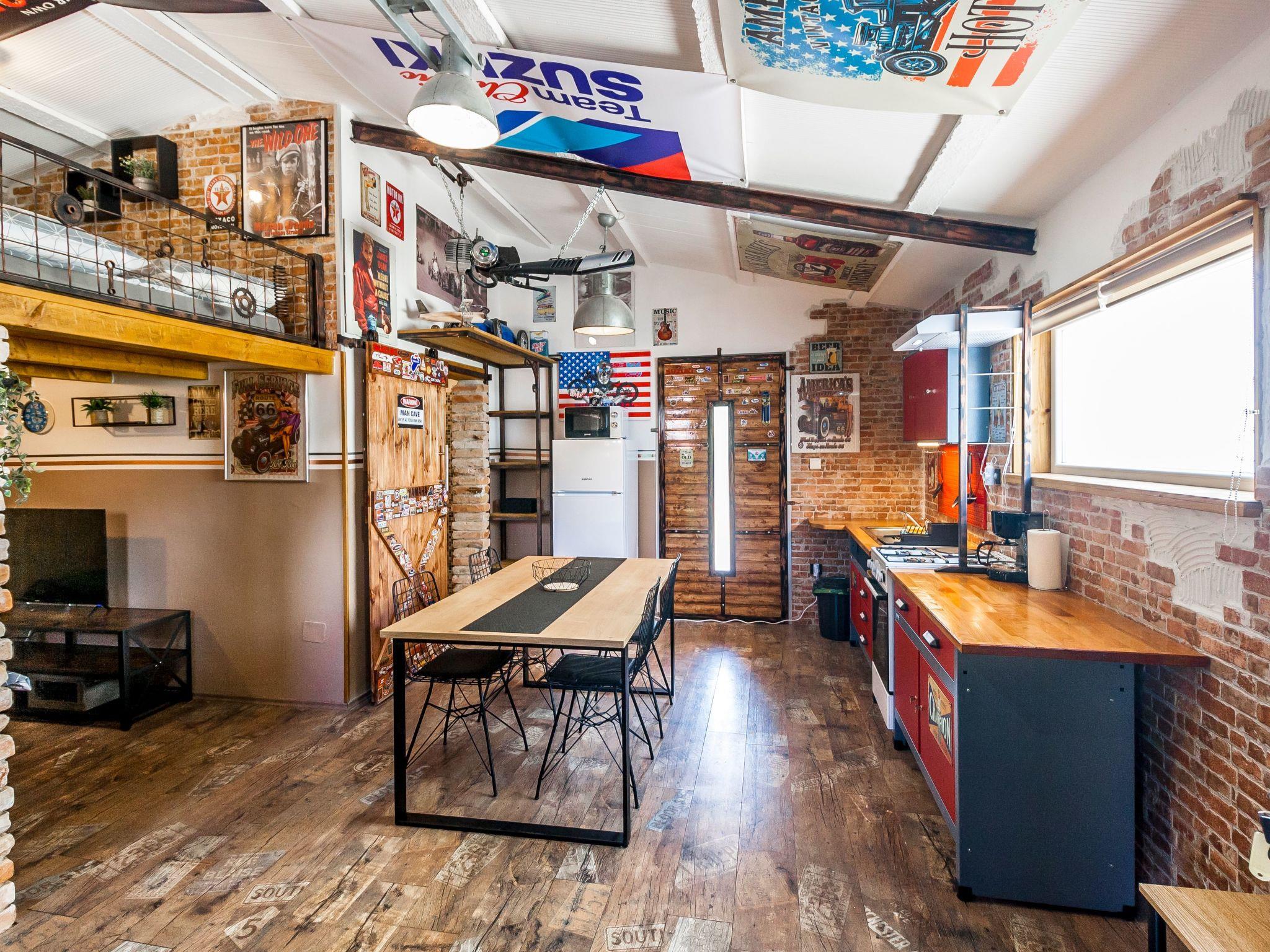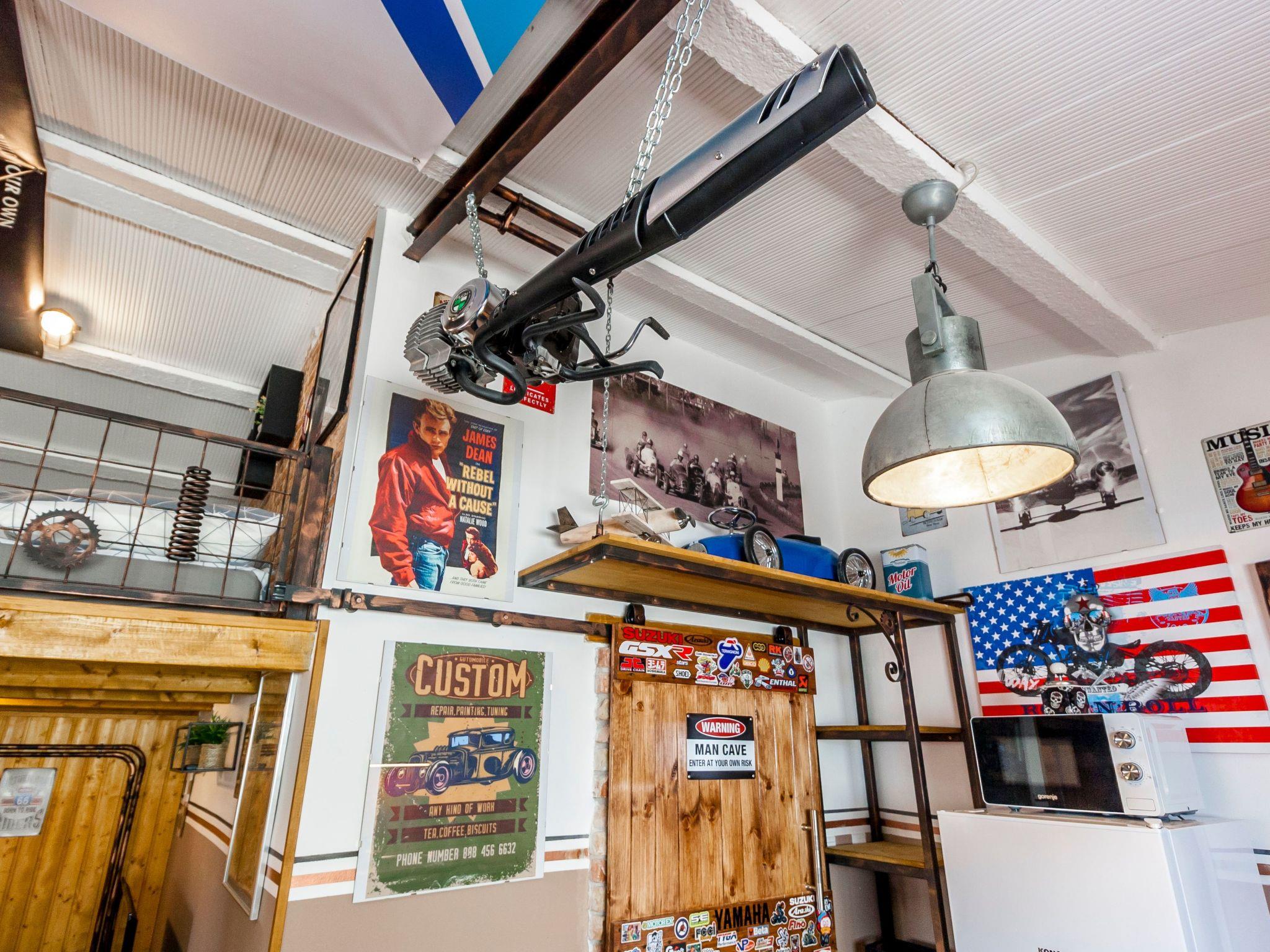 Dieser einzigartige Ort hat einen ganz eigenen Stil. Es wurde im industriellen Stil aus alten Motorradteilen, Aufklebern, Postern, Rahmen, Bannern usw. gebaut. Es besteht aus einem Küchen-, Ess-, Wohn- und Schlafraum mit einem Doppelbett (160x200cm) darunter, und einer Galerie mit einem weiteren Doppelschlafplatz (160x200cm). Der Innenraum ist 38m2, es ist klimatisiert, WiFi abgedeckt, Bad mit Dusche und Waschmaschine.