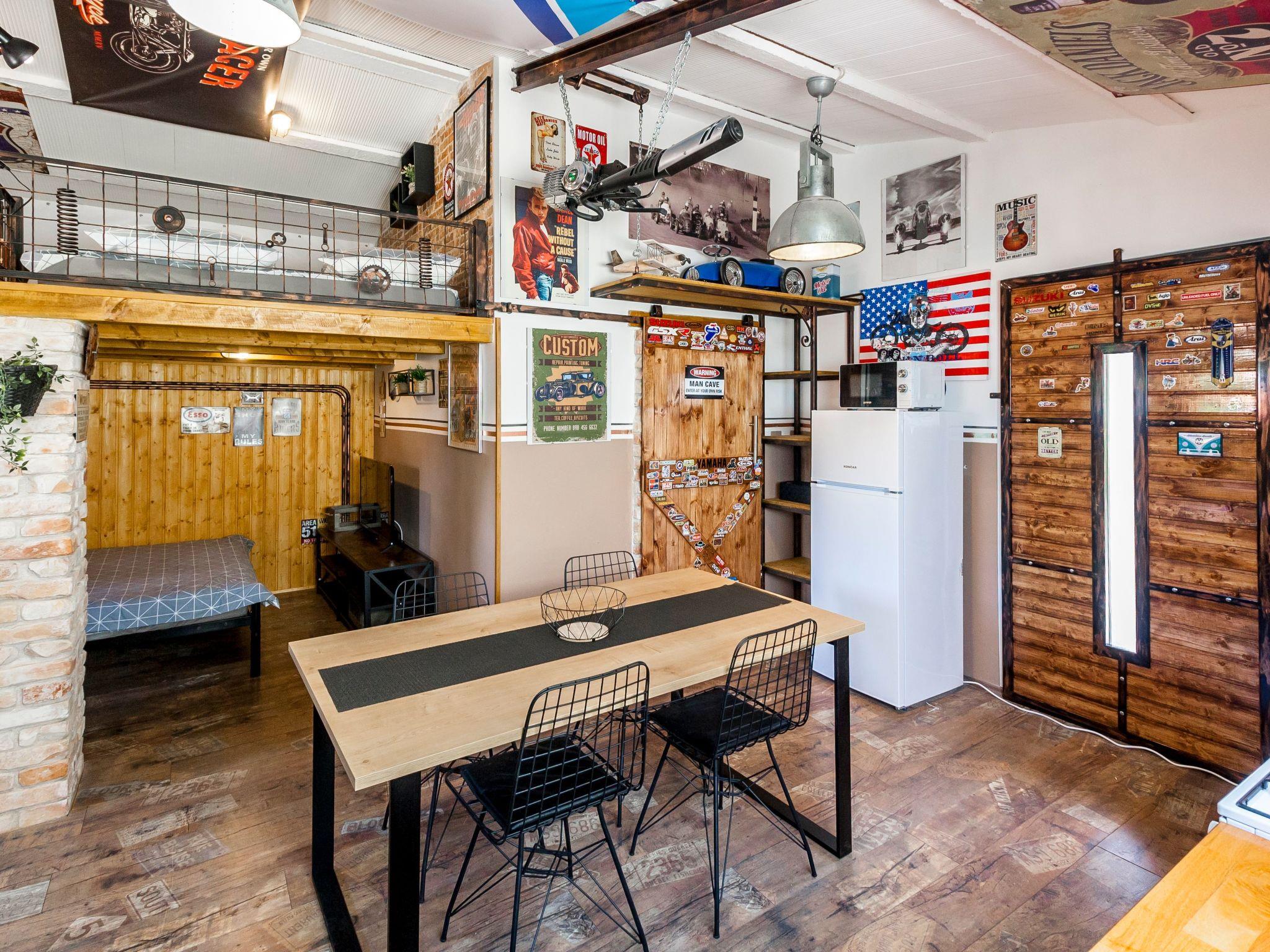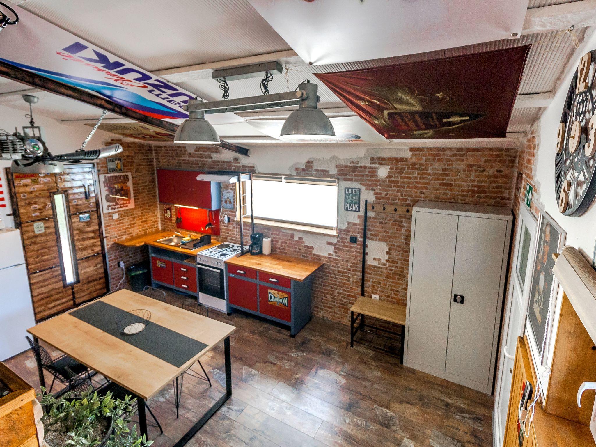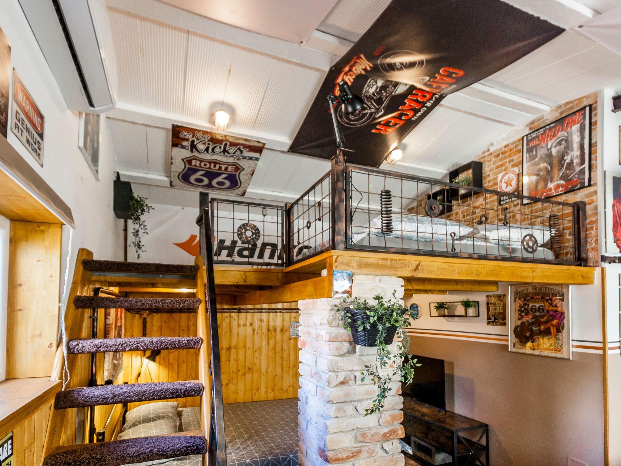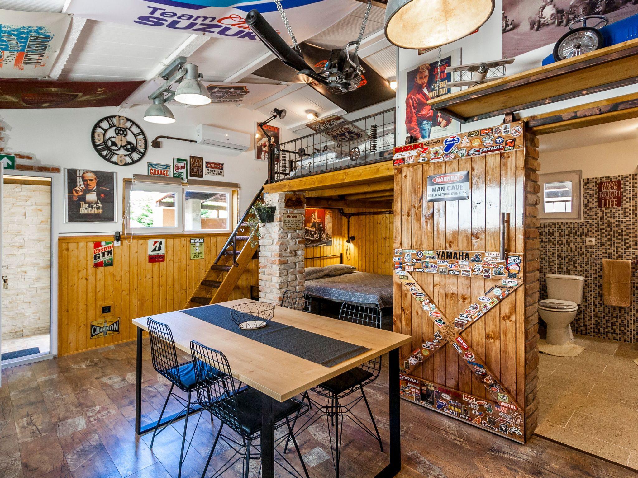 Dieser einzigartige Ort hat einen ganz eigenen Stil. Es wurde im industriellen Stil aus alten Motorradteilen, Aufklebern, Postern, Rahmen, Bannern usw. gebaut. Es besteht aus einem Küchen-, Ess-, Wohn- und Schlafraum mit einem Doppelbett (160x200cm) darunter, und einer Galerie mit einem weiteren Doppelschlafplatz (160x200cm). Der Innenraum ist 38m2, es ist klimatisiert, WiFi abgedeckt, Bad mit Dusche und Waschmaschine.