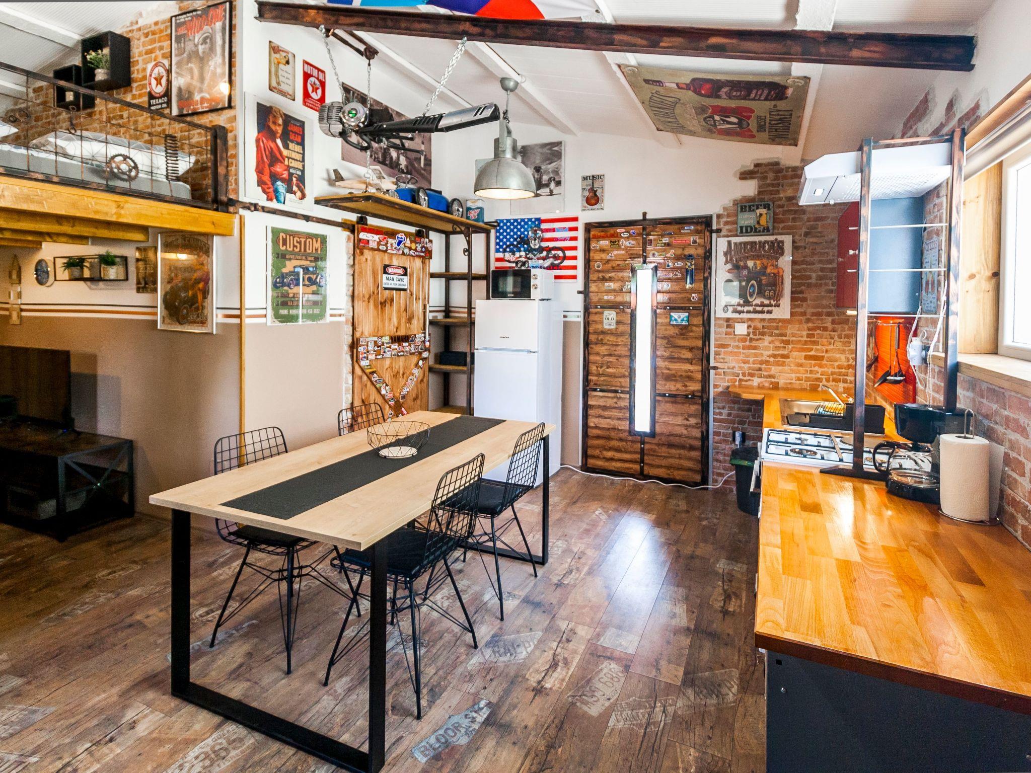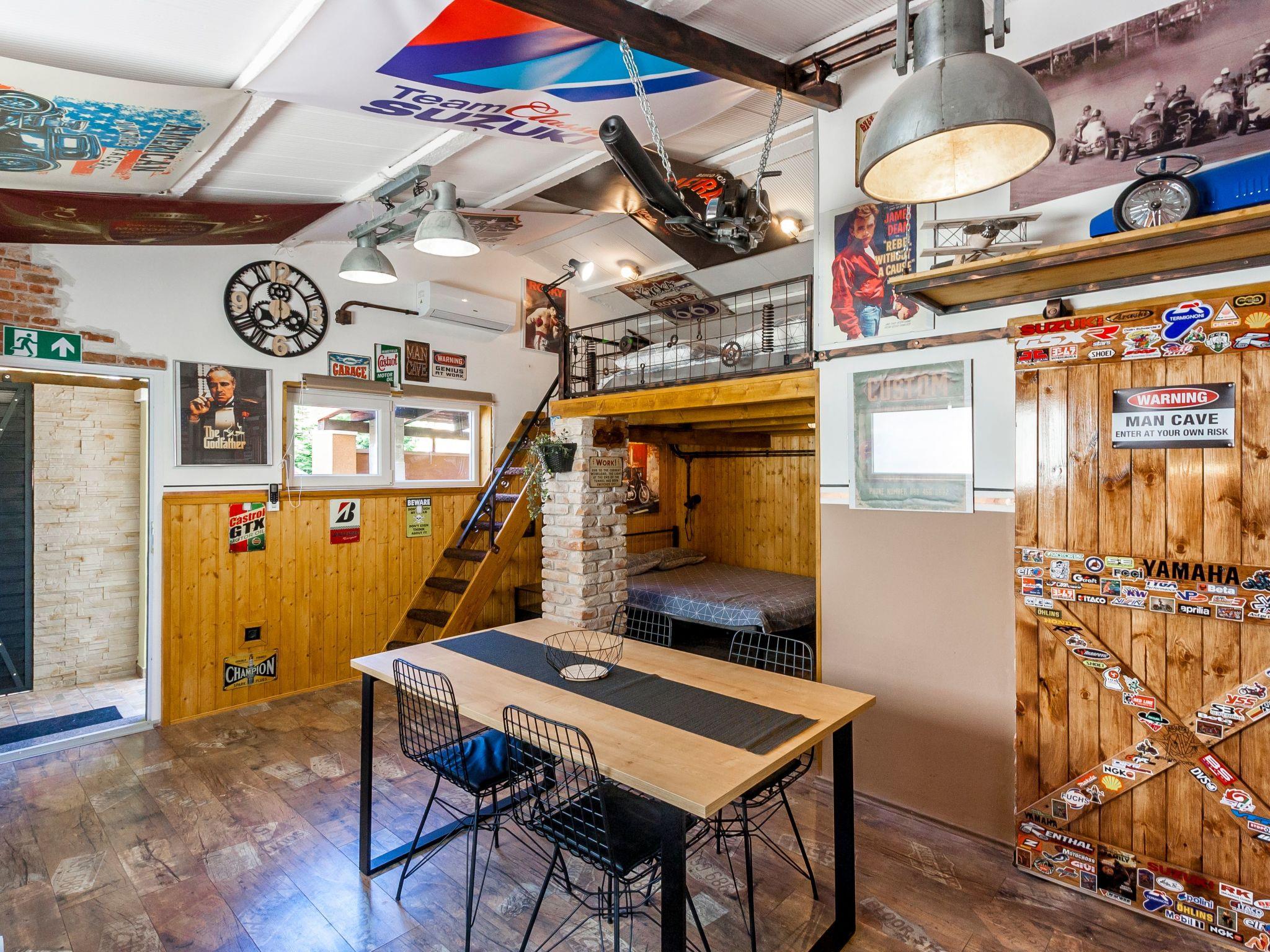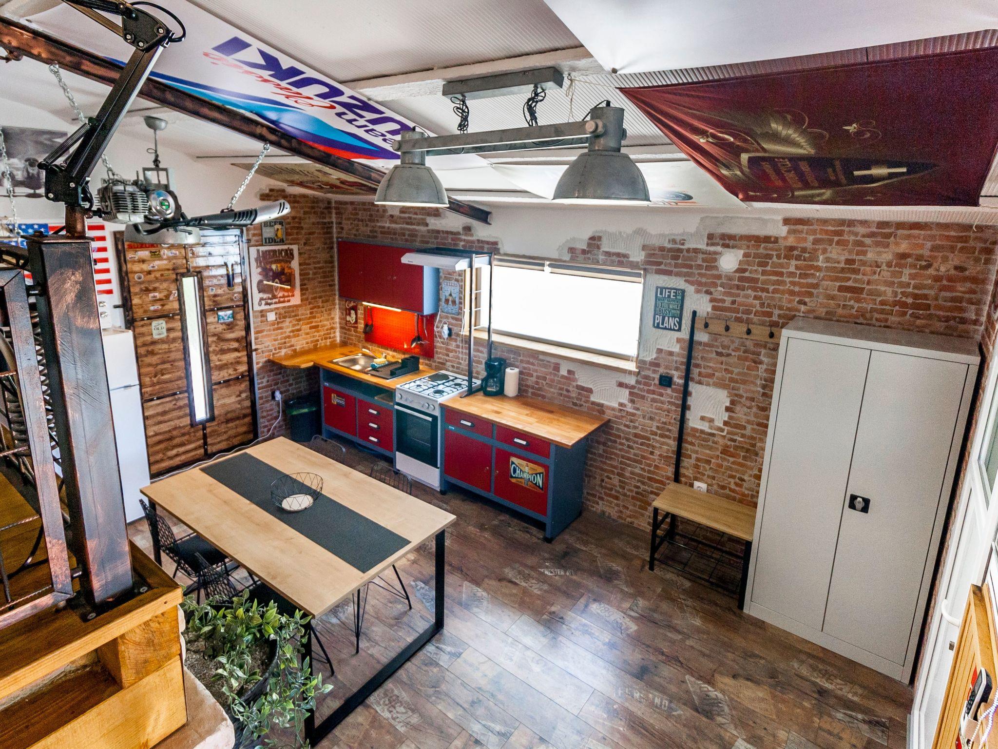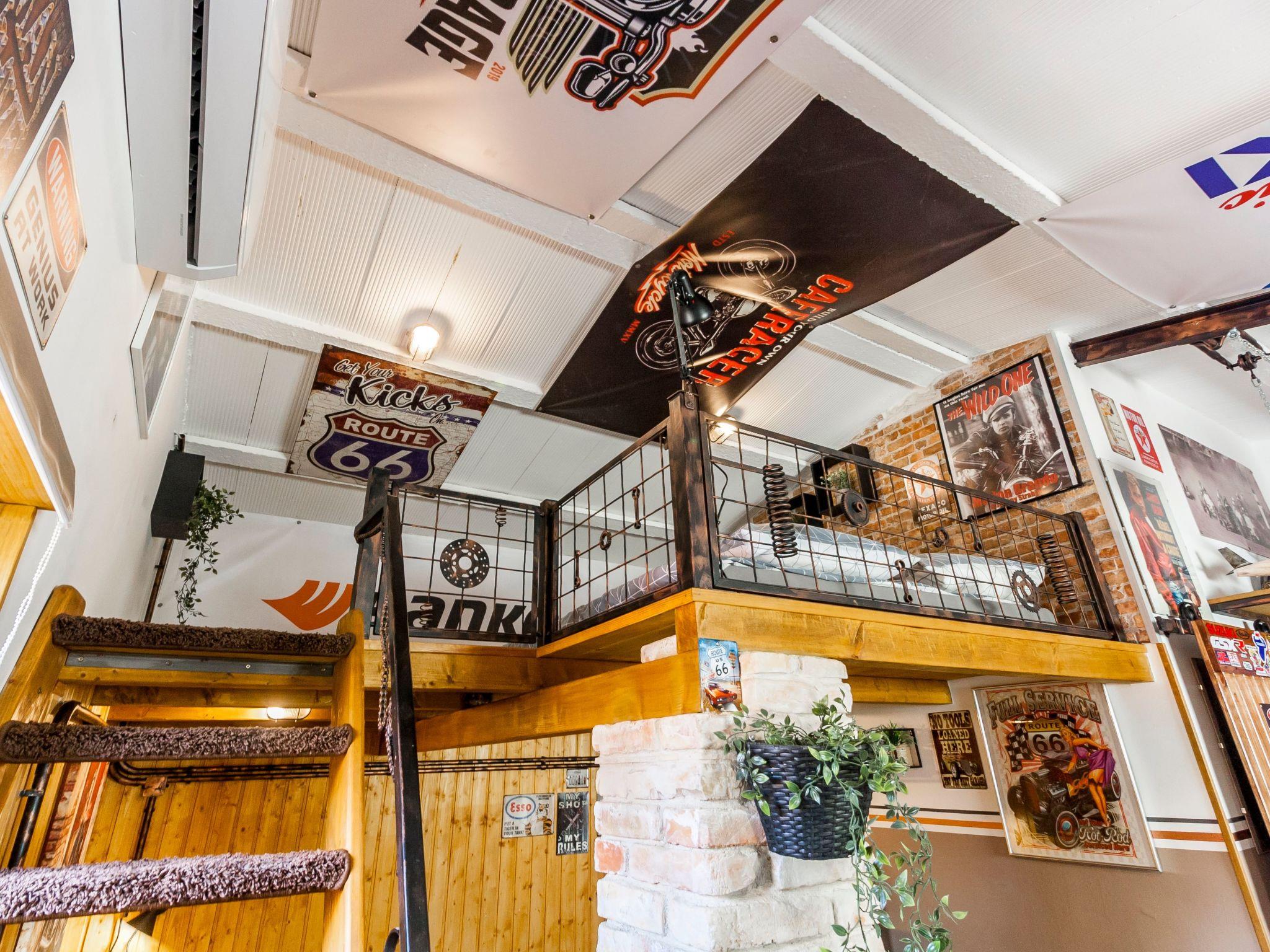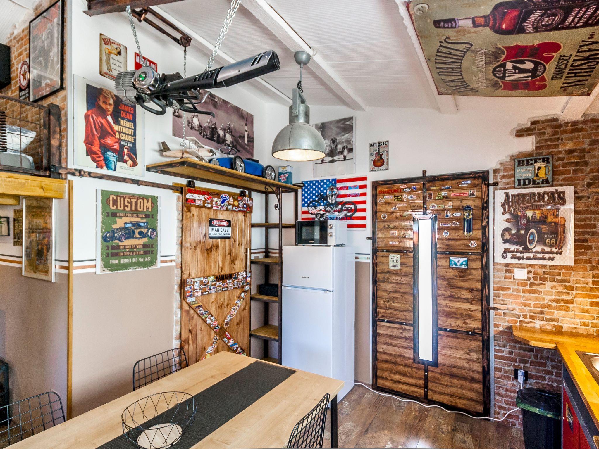 Dieser einzigartige Ort hat einen ganz eigenen Stil. Es wurde im industriellen Stil aus alten Motorradteilen, Aufklebern, Postern, Rahmen, Bannern usw. gebaut. Es besteht aus einem Küchen-, Ess-, Wohn- und Schlafraum mit einem Doppelbett (160x200cm) darunter, und einer Galerie mit einem weiteren Doppelschlafplatz (160x200cm). Der Innenraum ist 38m2, es ist klimatisiert, WiFi abgedeckt, Bad mit Dusche und Waschmaschine.