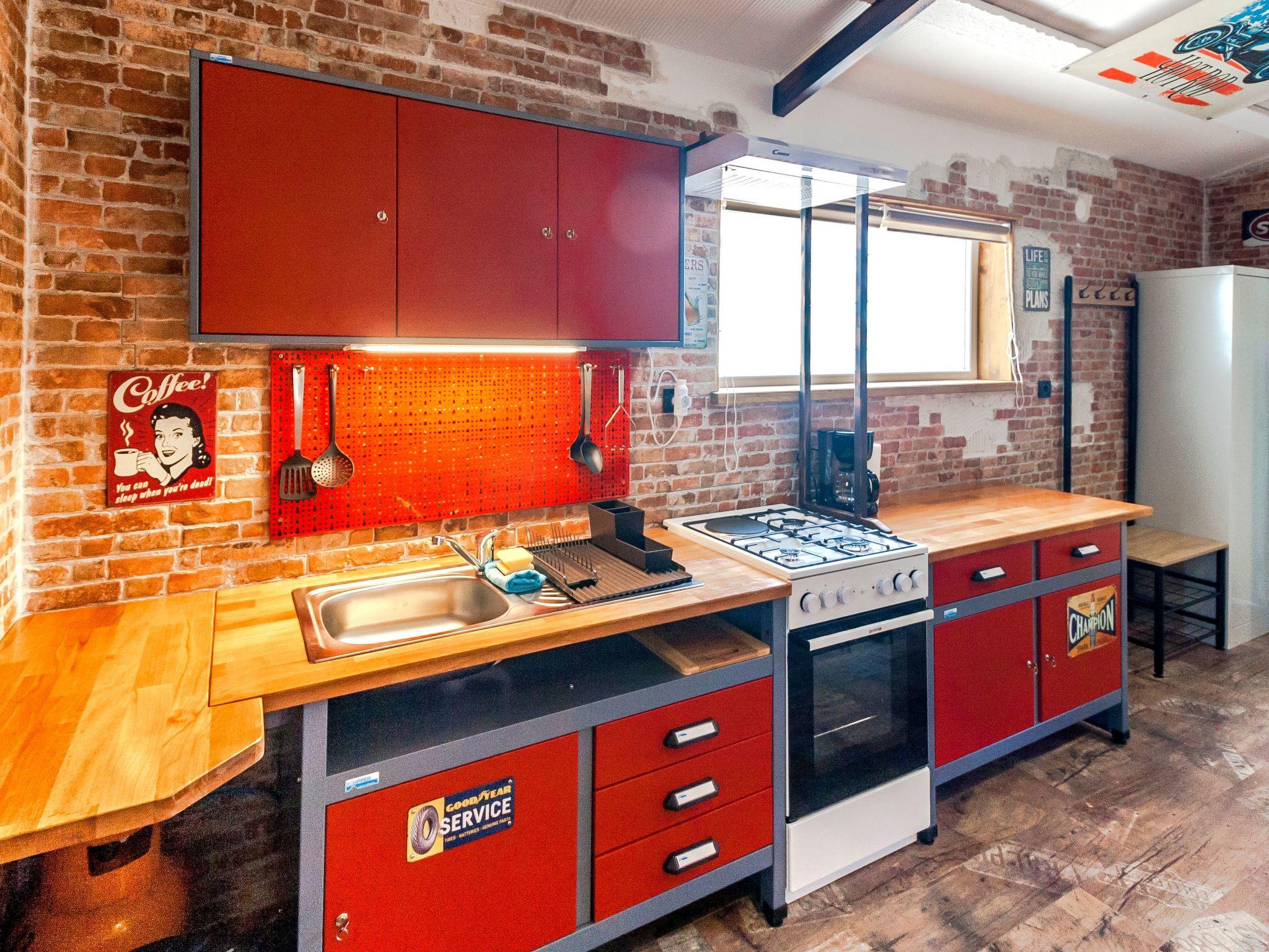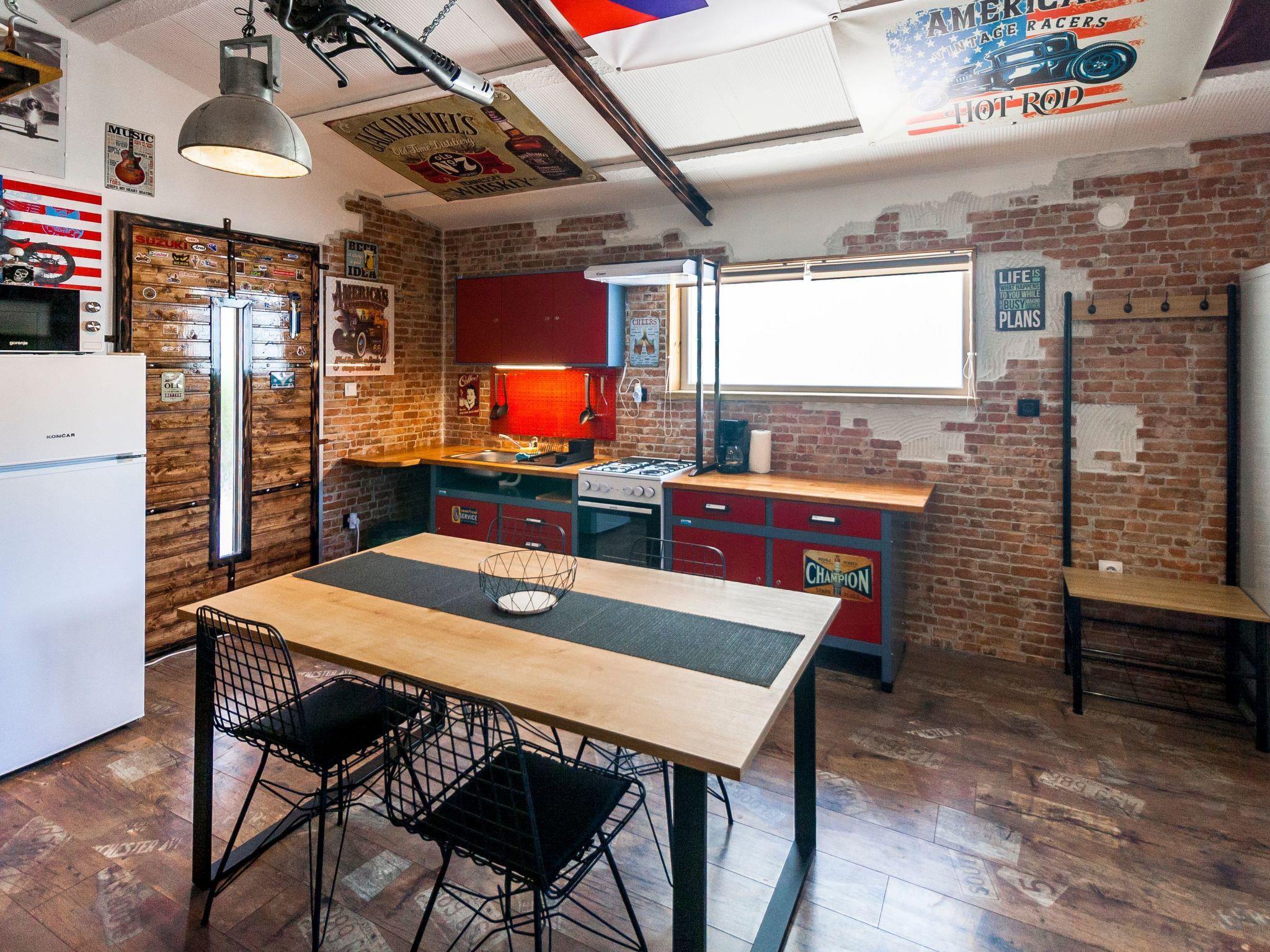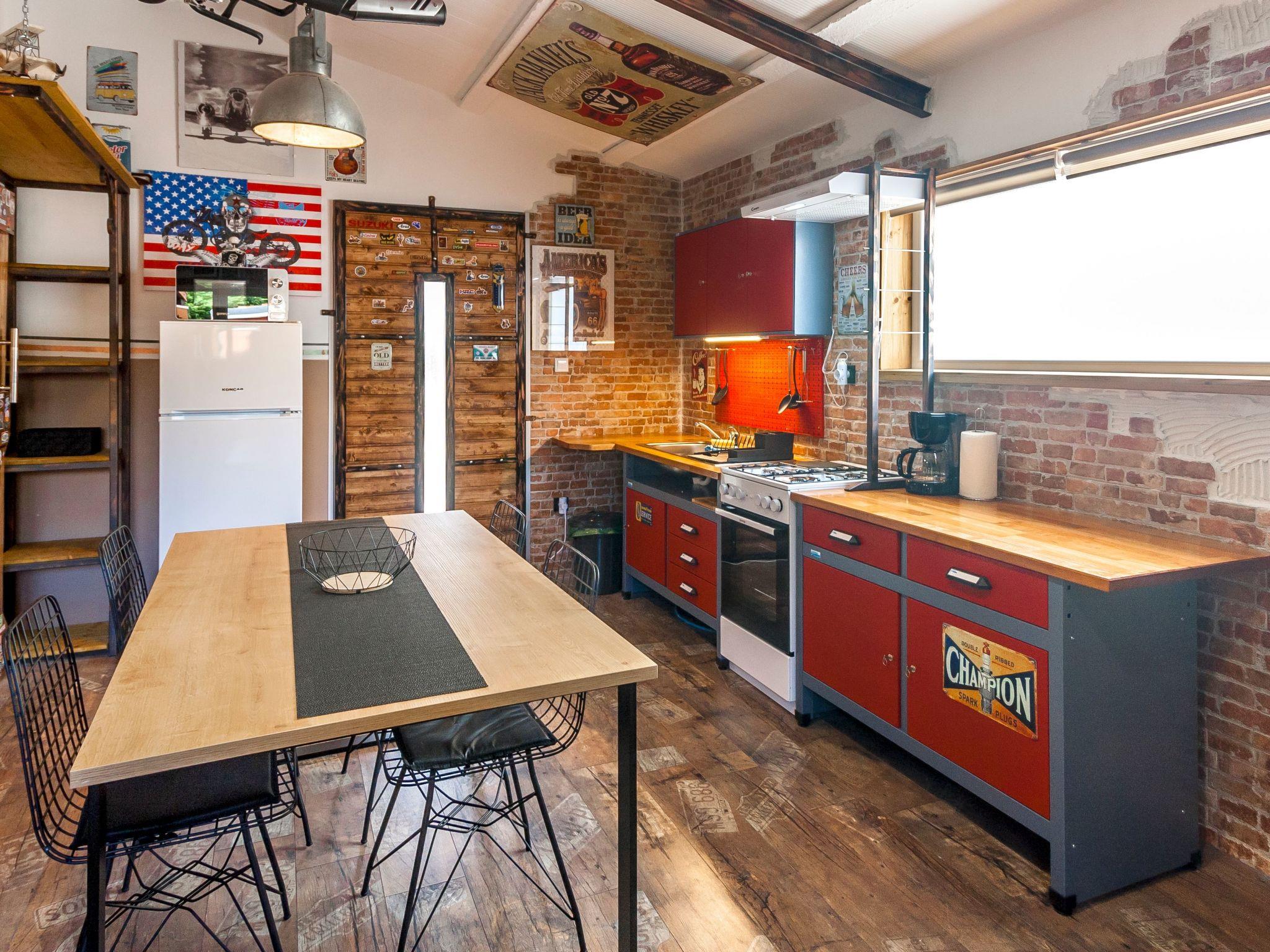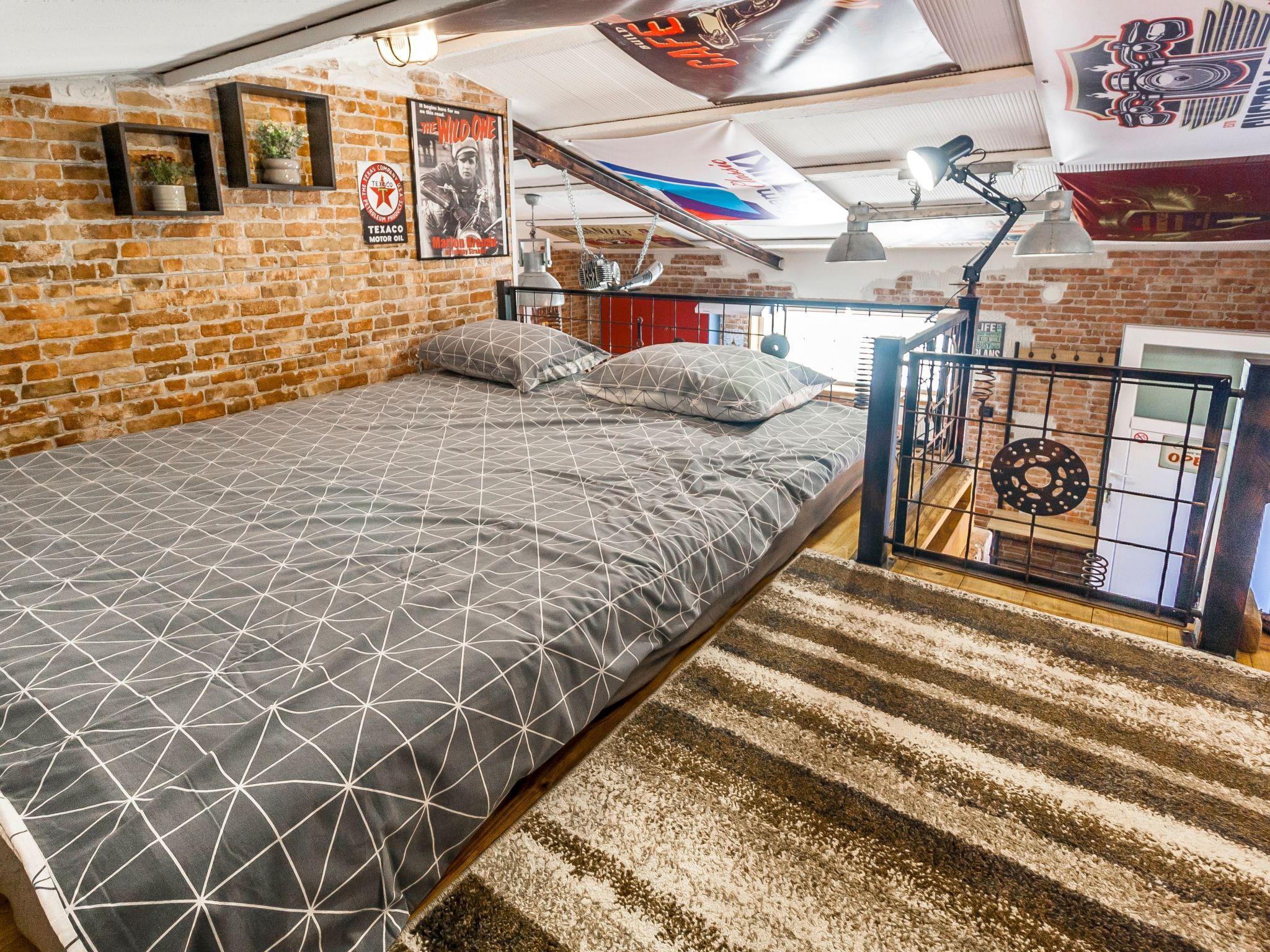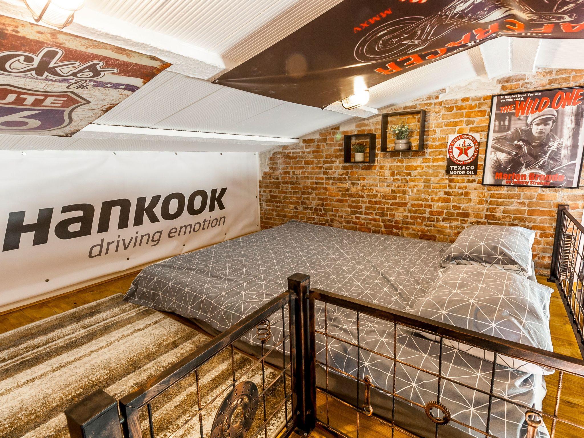 Dieser einzigartige Ort hat einen ganz eigenen Stil. Es wurde im industriellen Stil aus alten Motorradteilen, Aufklebern, Postern, Rahmen, Bannern usw. gebaut. Es besteht aus einem Küchen-, Ess-, Wohn- und Schlafraum mit einem Doppelbett (160x200cm) darunter, und einer Galerie mit einem weiteren Doppelschlafplatz (160x200cm). Der Innenraum ist 38m2, es ist klimatisiert, WiFi abgedeckt, Bad mit Dusche und Waschmaschine.