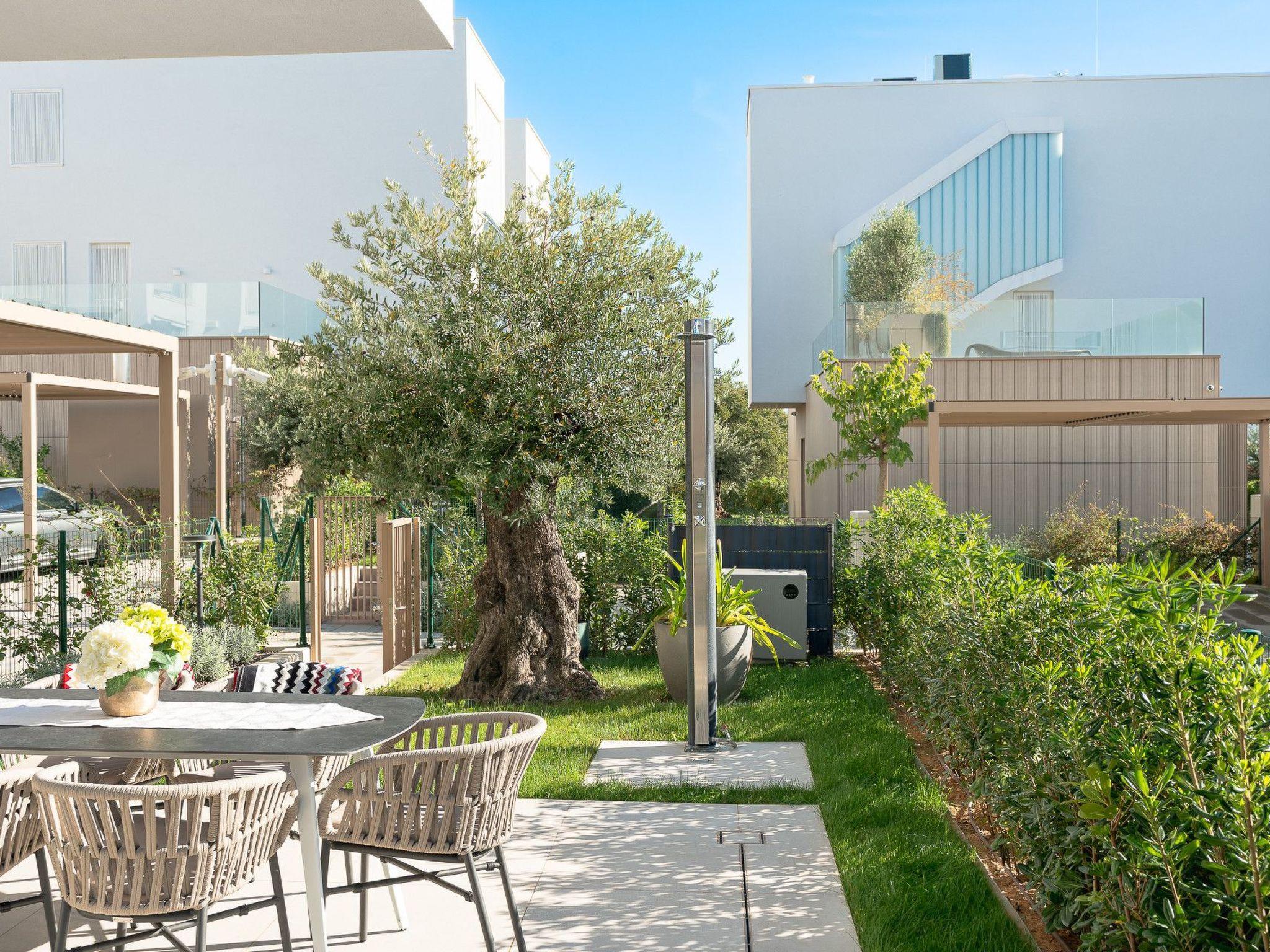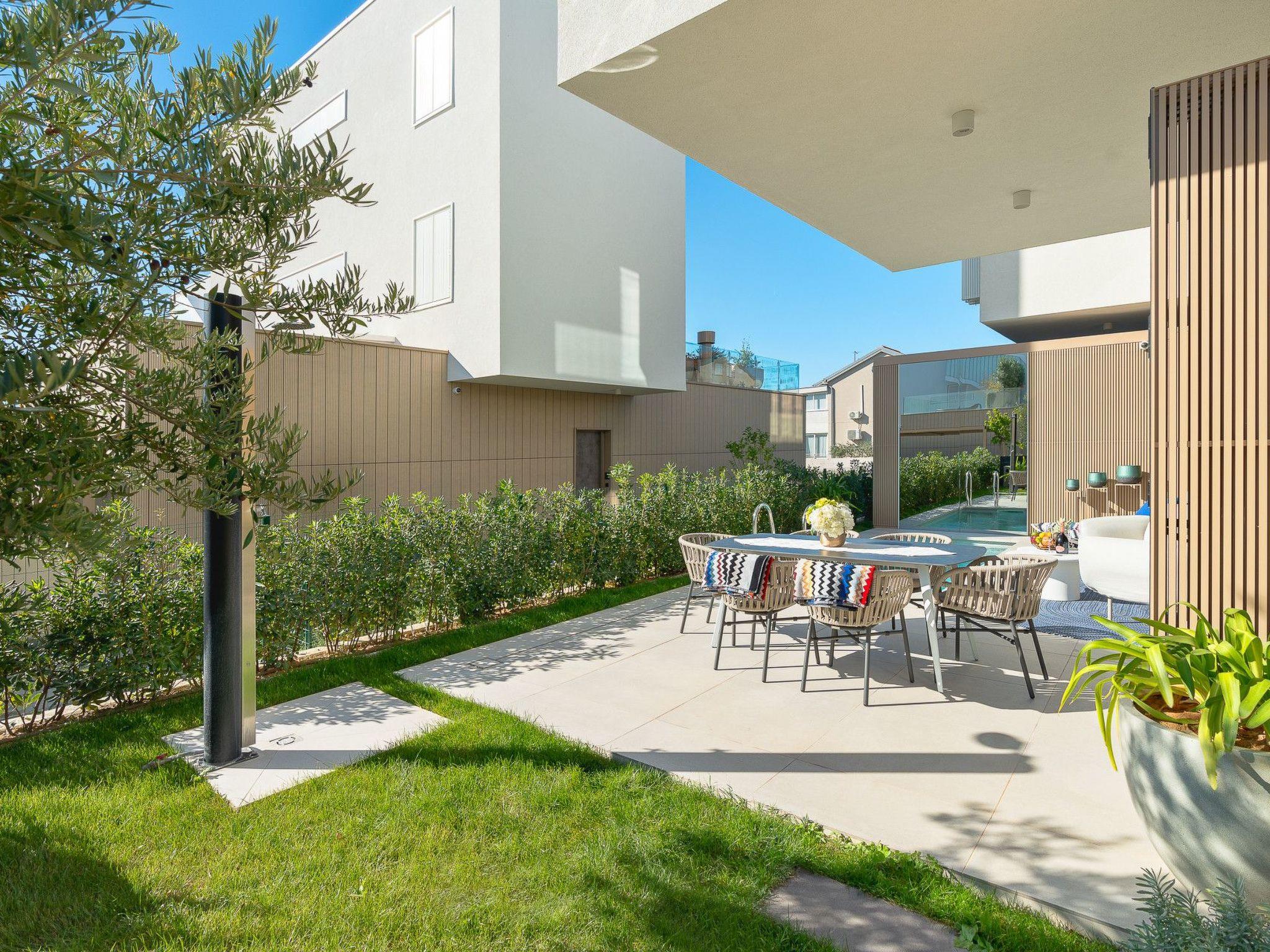 Die Villa erstreckt sich über 4 Etagen. Das Erdgeschoss besteht aus einem Eingang, einer Toilette, einem Wohnzimmer mit Küche und Esszimmer und einem Ausgang zur Terrasse mit beheiztem Pool, neben dem sich Sonnenliegen zum Entspannen, Liegestühle und ein Esstisch befinden. Ein Teil der Außenterrasse ist von einem schönen Garten umgeben, der mit mediterranen Pflanzen und einem über 60 Jahre alten Olivenbaum geschmückt ist.