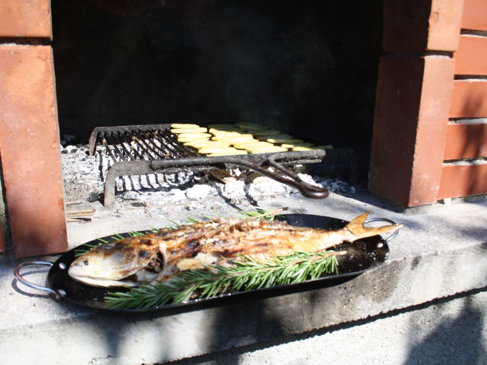 Der große Garten bietet natürlichen Schatten durch die mediterrane Vegetation. Am Essbereich kann man das Grillgut genießen. Zudem ist eine Garage für zwei Autos vorhanden.