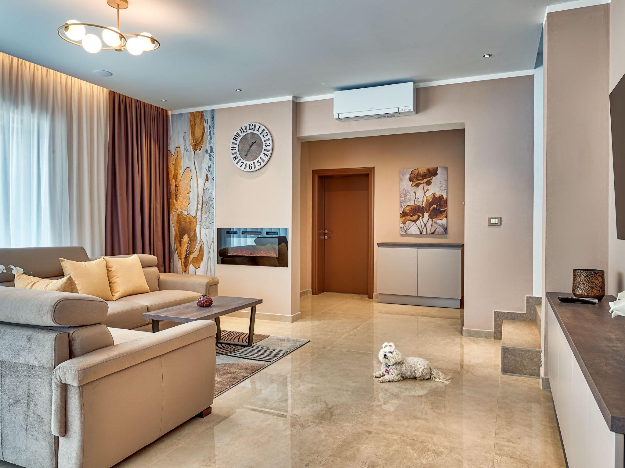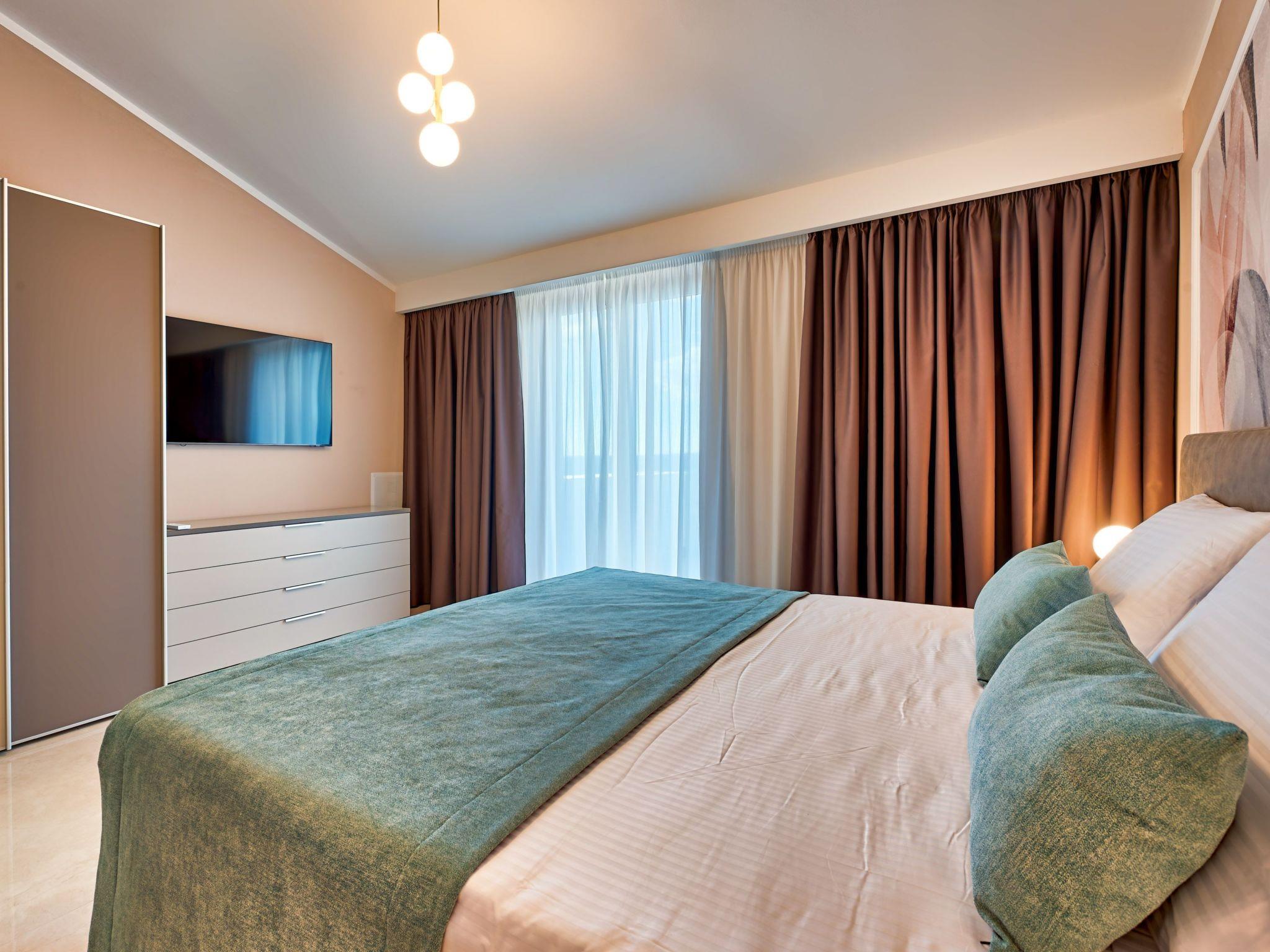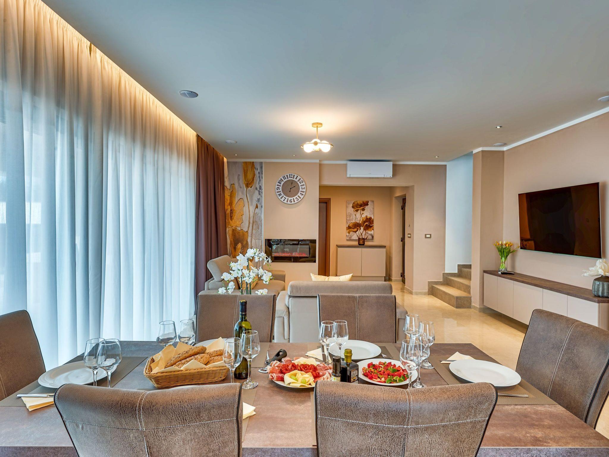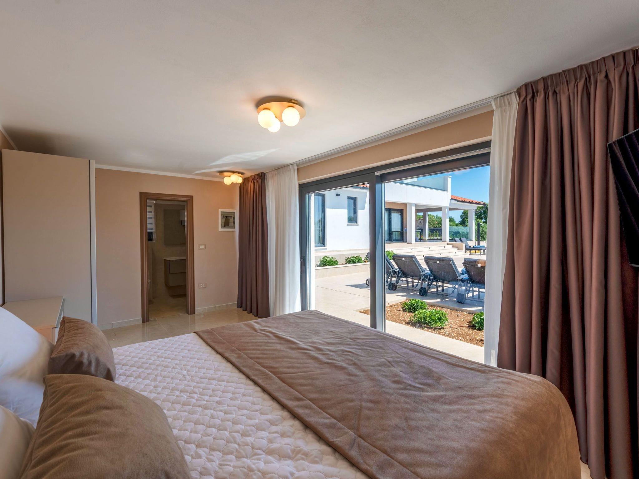 Die Villa Astrid bietet Platz für 11 Personen: 2 Doppelzimmer im ersten Stock, 1 Doppelzimmer im Erdgeschoss, ausklappbare Couch und Sessel im Wohnzimmer und ein zusätzliches Doppelzimmer in einer separaten Einheit. Alle Schlafzimmer sind komfortabel und modern eingerichtet, mit Kingsize-Betten (200 x 210 cm), Klimaanlagen und Großbildfernsehern. Die Zimmer im ersten Stock teilen sich eine gemeinsame geräumige Terrasse, von der aus man einen wunderschönen Blick auf die ganze Landschaft genießen kann.