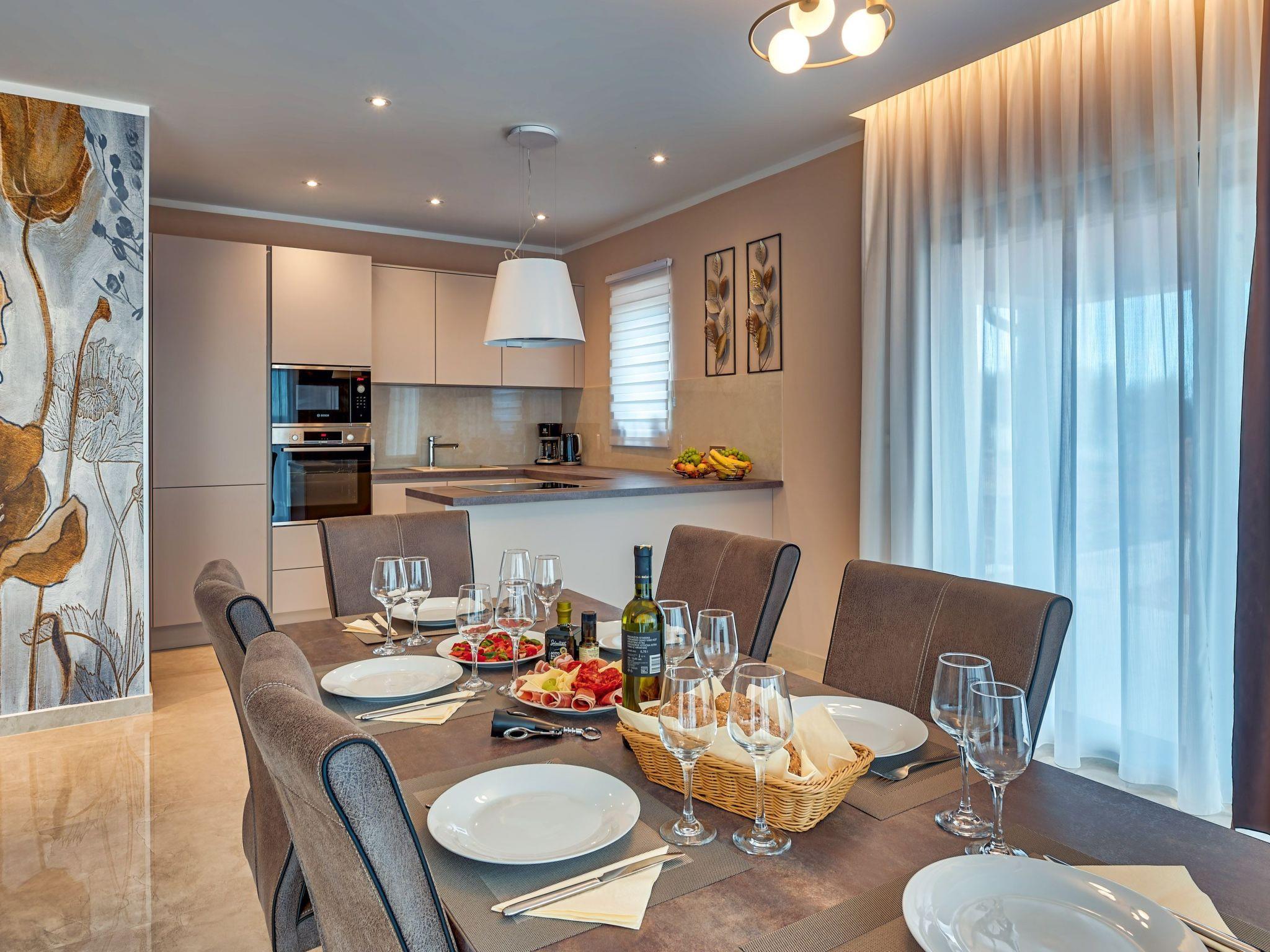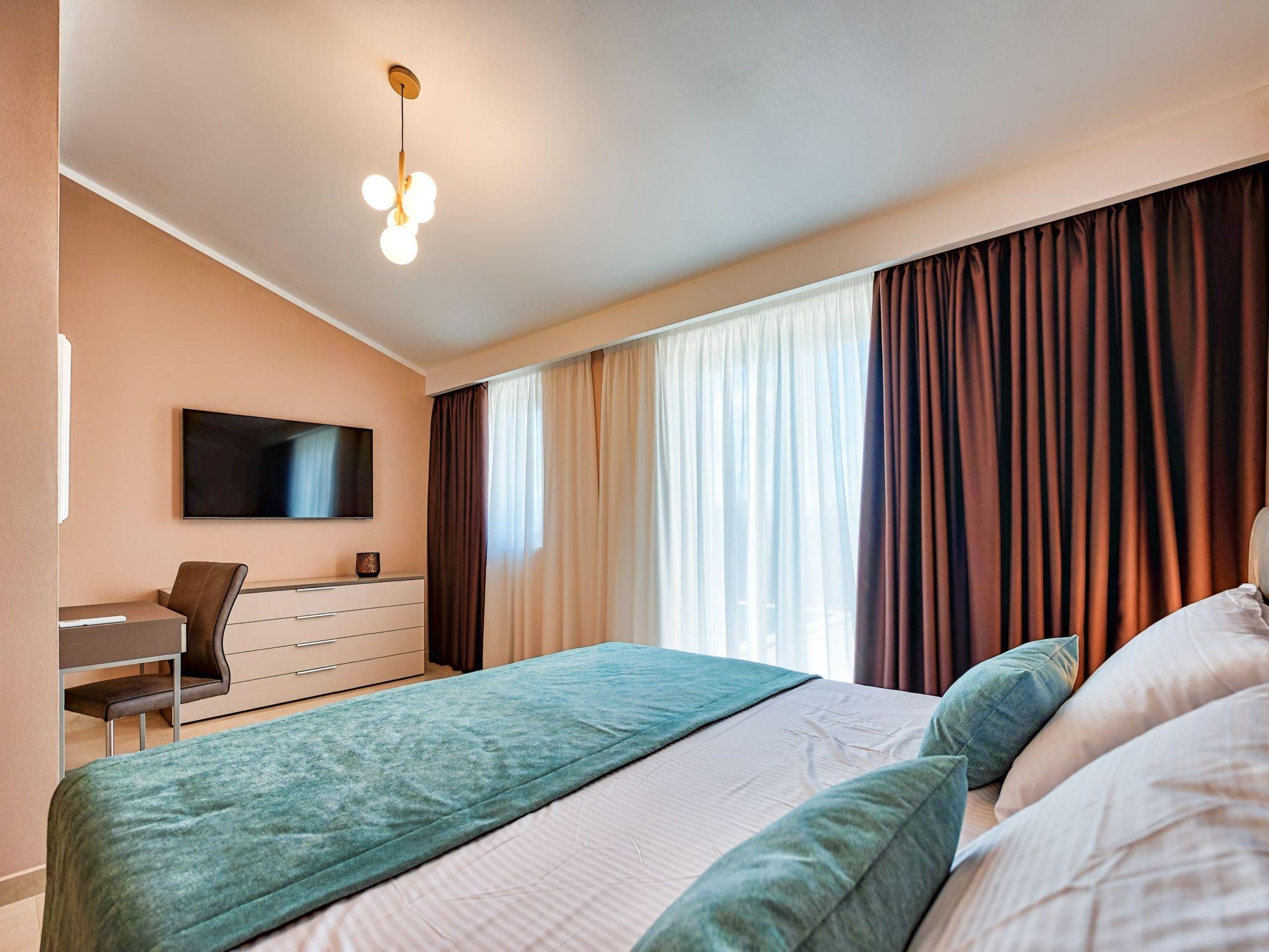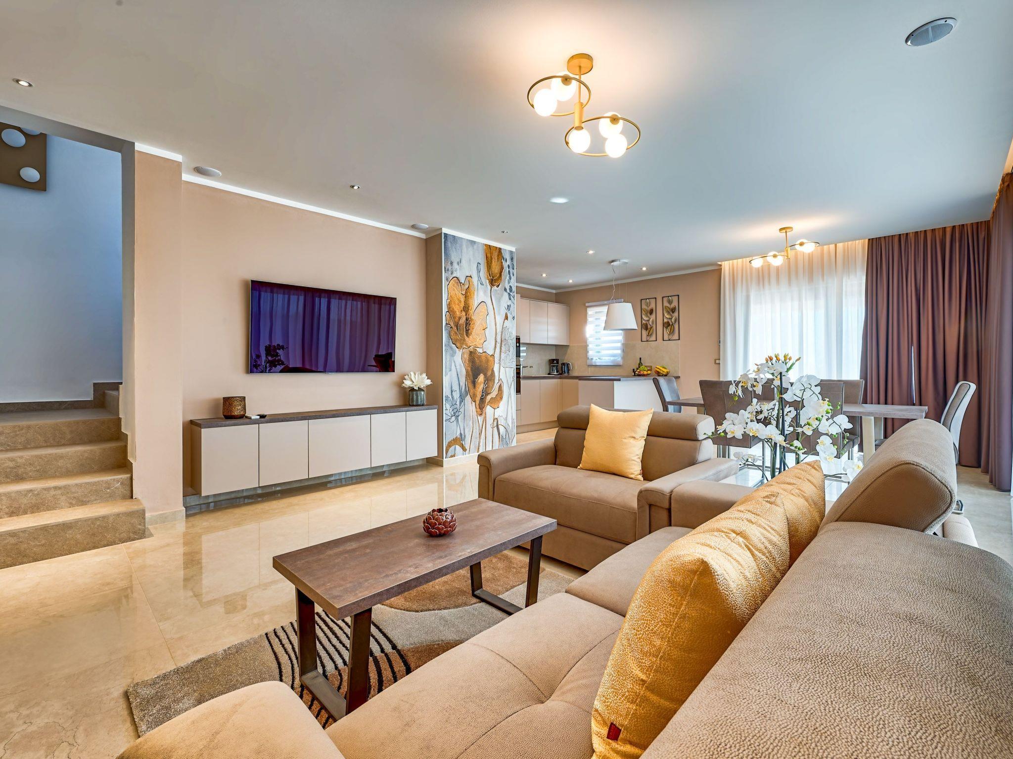Die Villa Astrid bietet Platz für 11 Personen: 2 Doppelzimmer im ersten Stock, 1 Doppelzimmer im Erdgeschoss, ausklappbare Couch und Sessel im Wohnzimmer und ein zusätzliches Doppelzimmer in einer separaten Einheit. Alle Schlafzimmer sind komfortabel und modern eingerichtet, mit Kingsize-Betten (200 x 210 cm), Klimaanlagen und Großbildfernsehern. Die Zimmer im ersten Stock teilen sich eine gemeinsame geräumige Terrasse, von der aus man einen wunderschönen Blick auf die ganze Landschaft genießen kann.