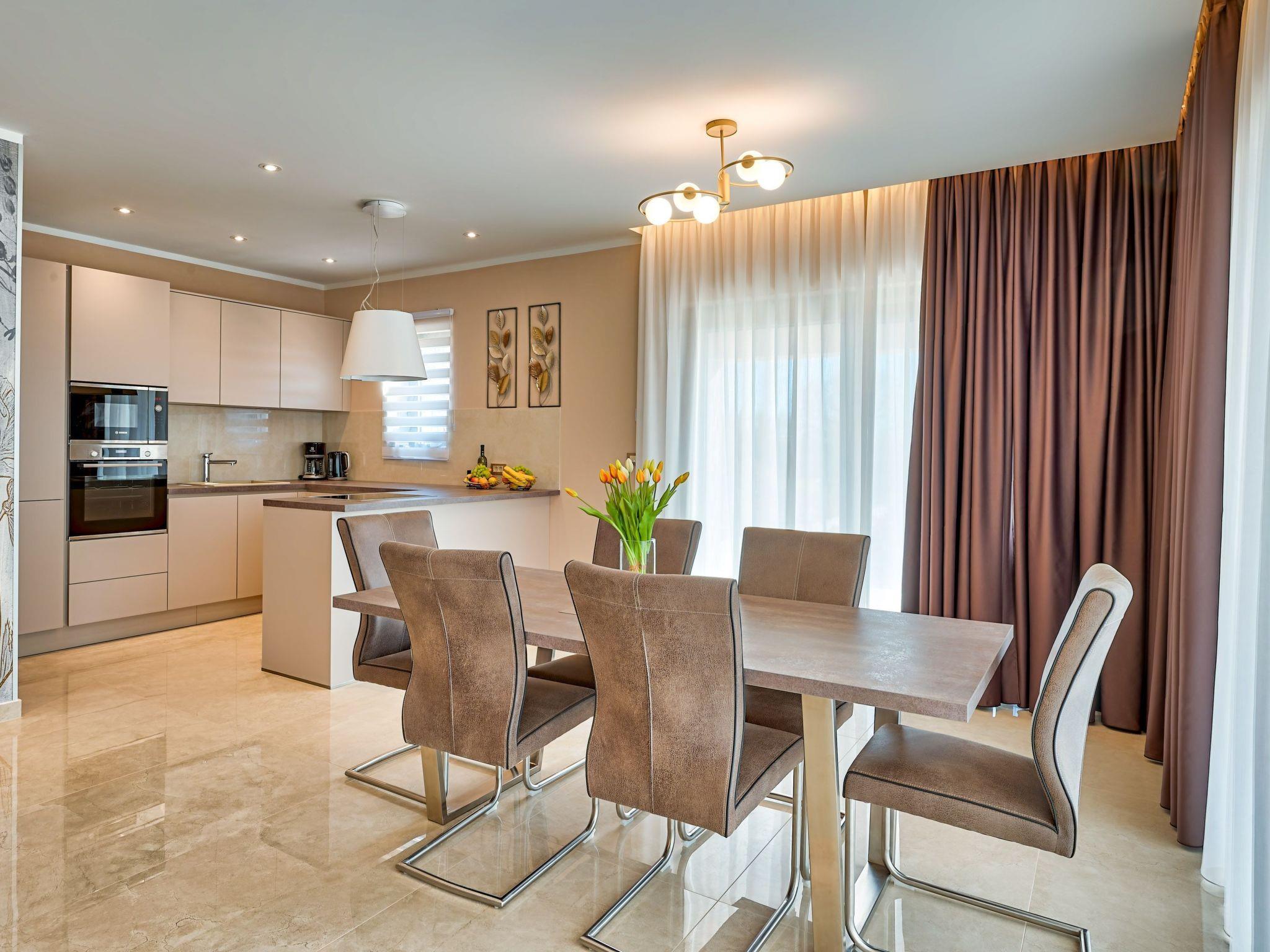 Im Erdgeschoss gibt es ein großes Wohnzimmer mit zusätzlichem TV, ein Esszimmer, eine voll ausgestattete Küche und ein Gäste-WC, alle klimatisiert.