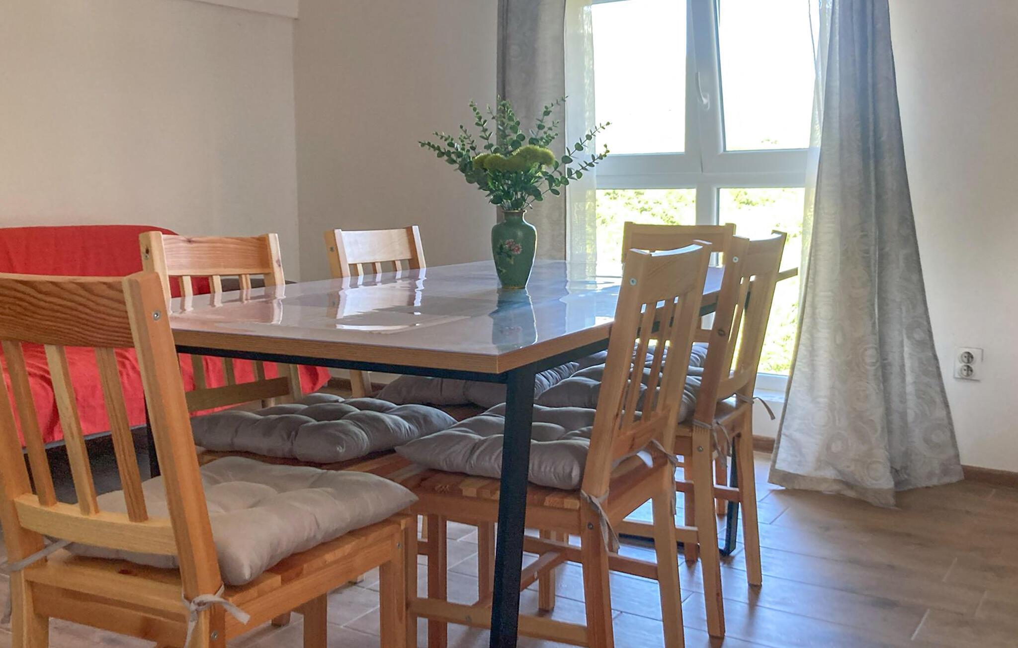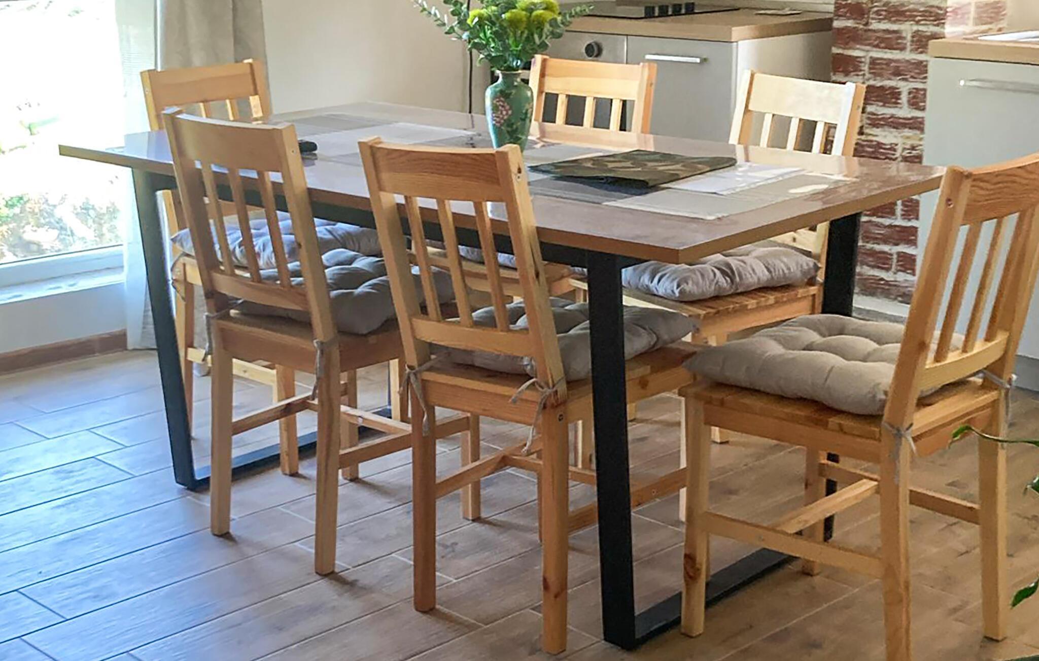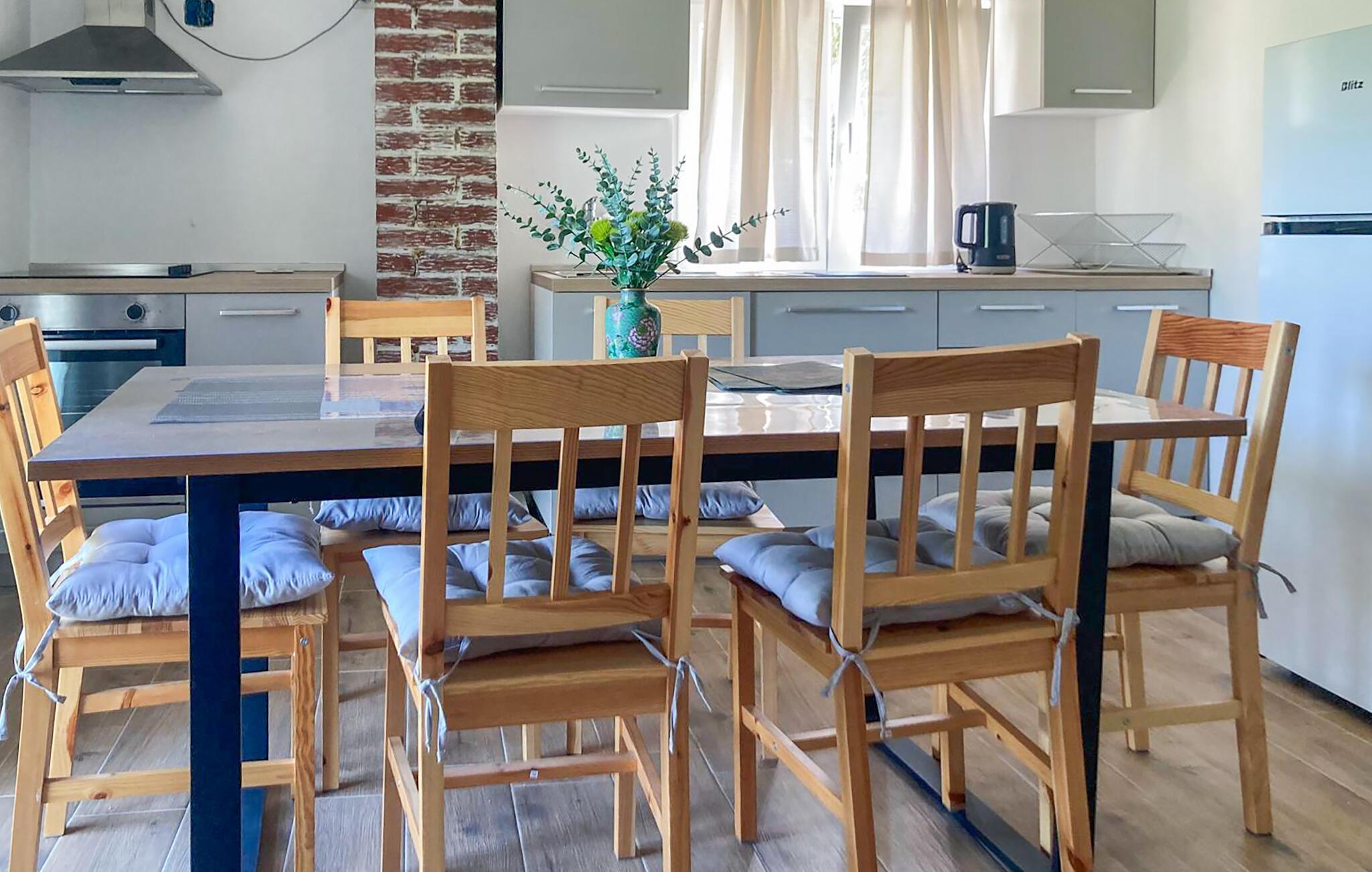 Im Innenbereich erwartet Sie eine helle gemütliche Küche, die eine heimelige Stimmung verströmt. Nehmen Sie Platz am Esstisch und genießen Sie Ihre Mahlzeiten in der gemütlichen Atmosphäre. Hier können Sie im Laufe des Tages auch Karten oder lustige Gesellschaftsspiele spielen.