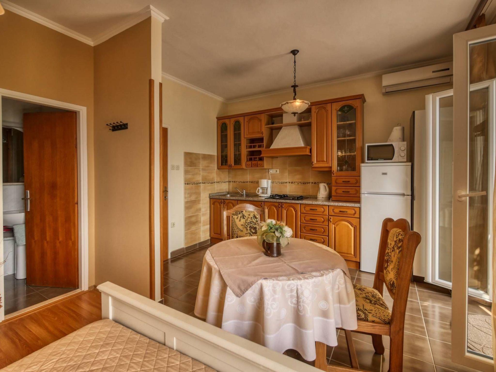 The interior of our studio apartment caters to every comfort of home, blending functionality with cosy elegance. It is fully furnished to accommodate 2 guests, featuring a large, combined bedroom and dining room adorned with a kitchen. For your convenience, the apartment includes a modern bathroom, ensuring your stay is as comfortable and relaxing as possible. Equipped with air conditioning, satellite TV, and Wi-Fi, our studio promises a serene and connected stay, complemented by a private balcony that offers breathtaking sea views.