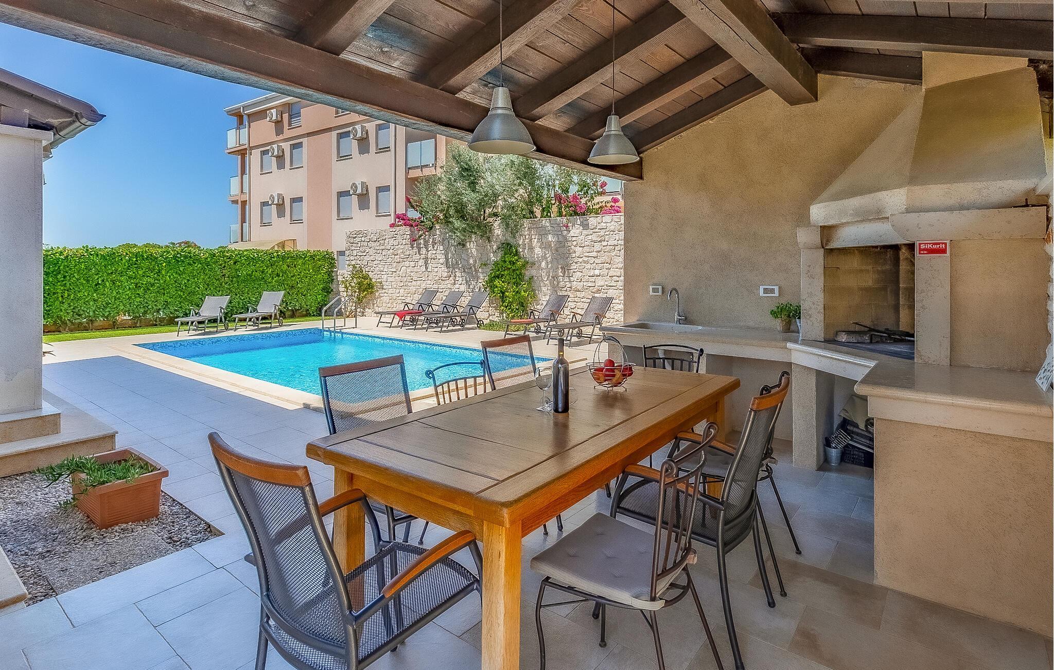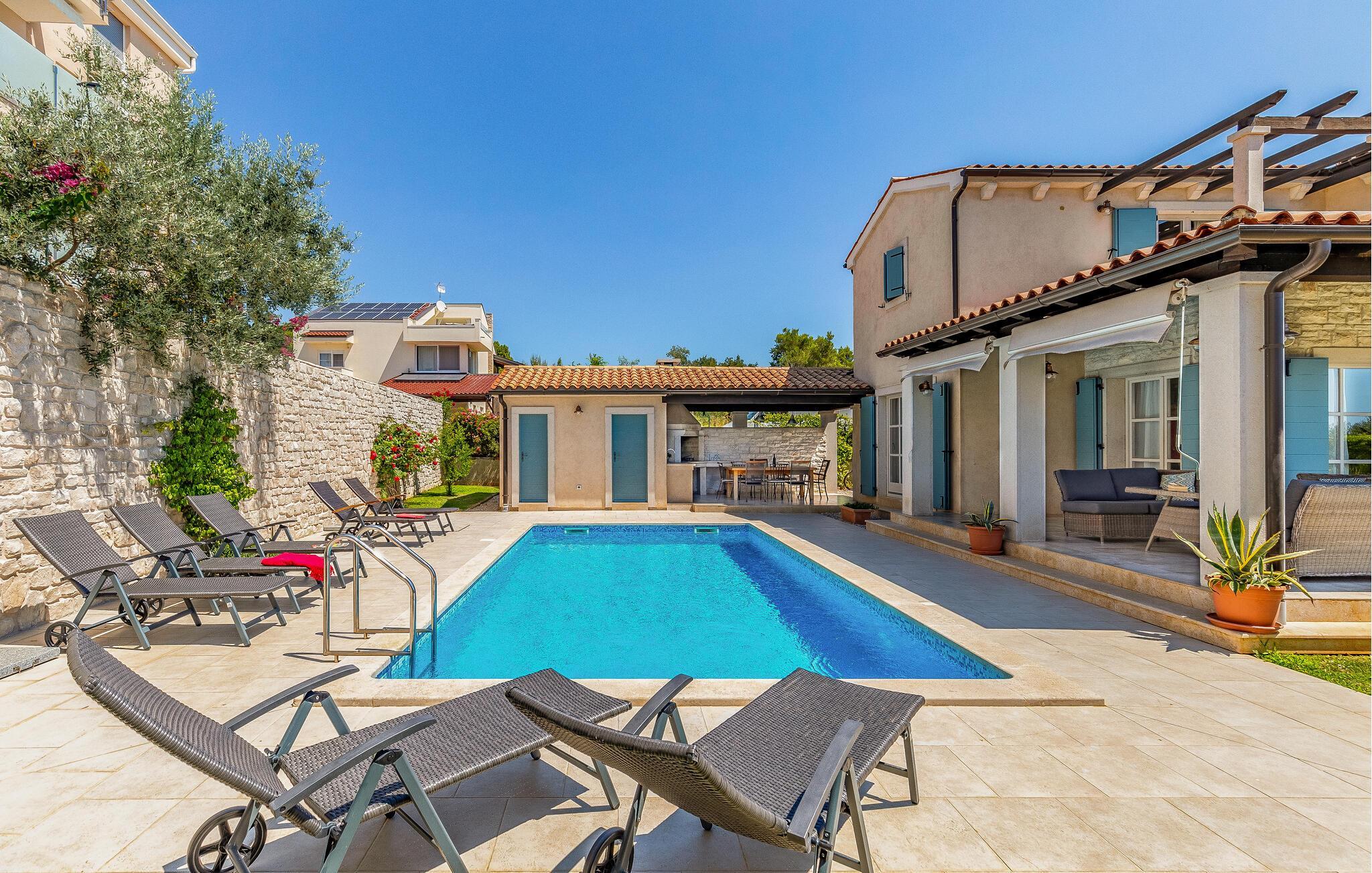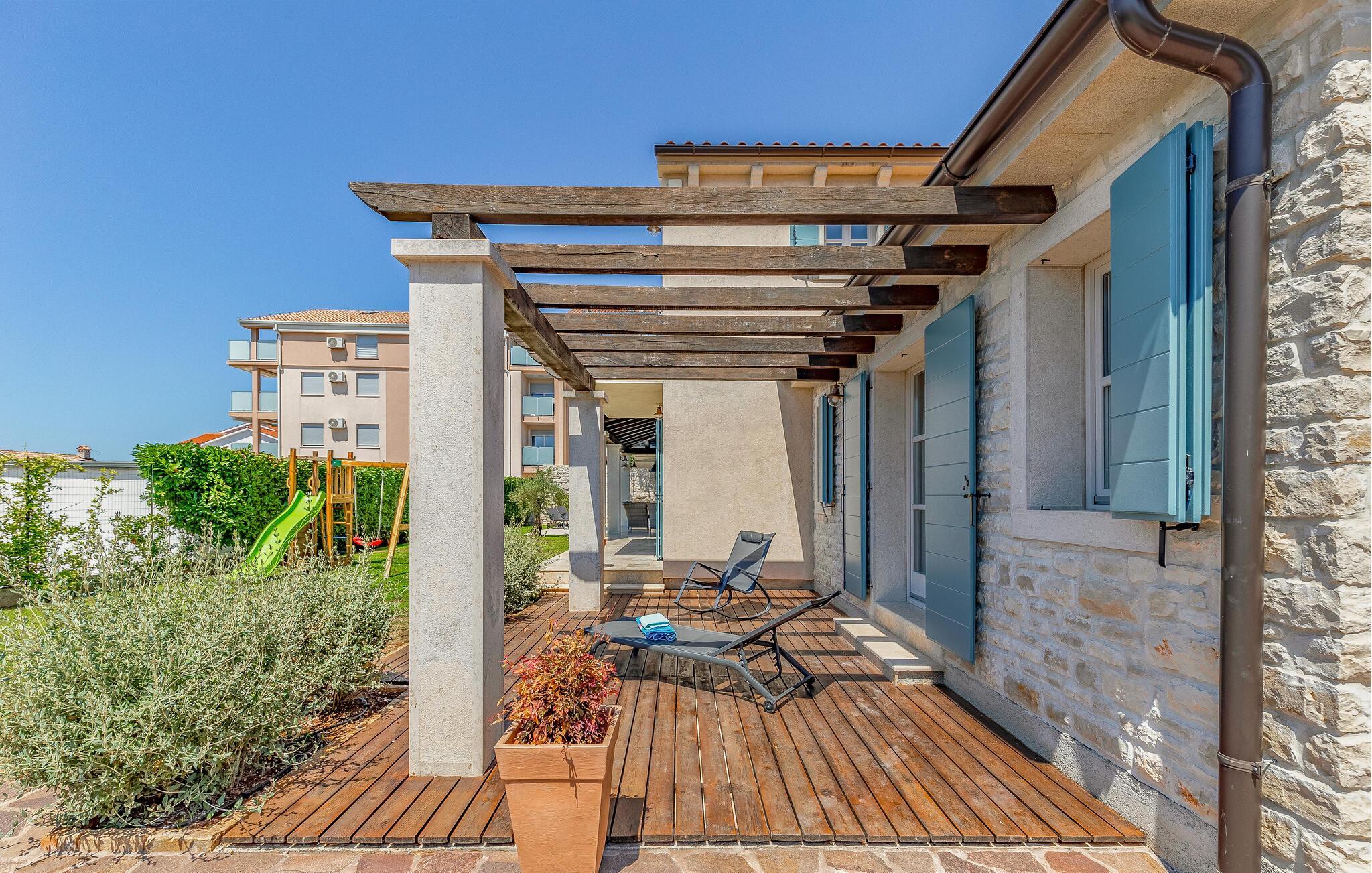 Diese wunderschöne moderne Villa befinde sich im Ort Fazana, der bekannt ist für seinen Hafen, von dem aus Ausflüge zu den Brijuni-Inseln gemacht werden, genauso wie für seine Strände, Promenaden, Wälder und Restaurants, ein ideales Reiseziel für Ihren Urlaub. Zum Haus gehören Kinderspielgeräte in einem eingezäunten Garten. Die Sauna, der Fitnessraum sowie andere Einrichtungen werden Sie begeistern. Am Nachmittag können Sie sich im Pool abkühlen, besonders wenn von Erkundungen in der Kleinstadt Fazana und der näheren Umgebung mit dem Fahrrad heimkommen. Die Räder sind ebenfalls im Angebot. Wenn Sie den Zauber Istriens entdecken möchten, empfehlen wir Ausflüge ins Landesinnere. Entdecken Sie die Tavernen und Weinkeller, kosten Sie die traditionellen Spezialitäten.