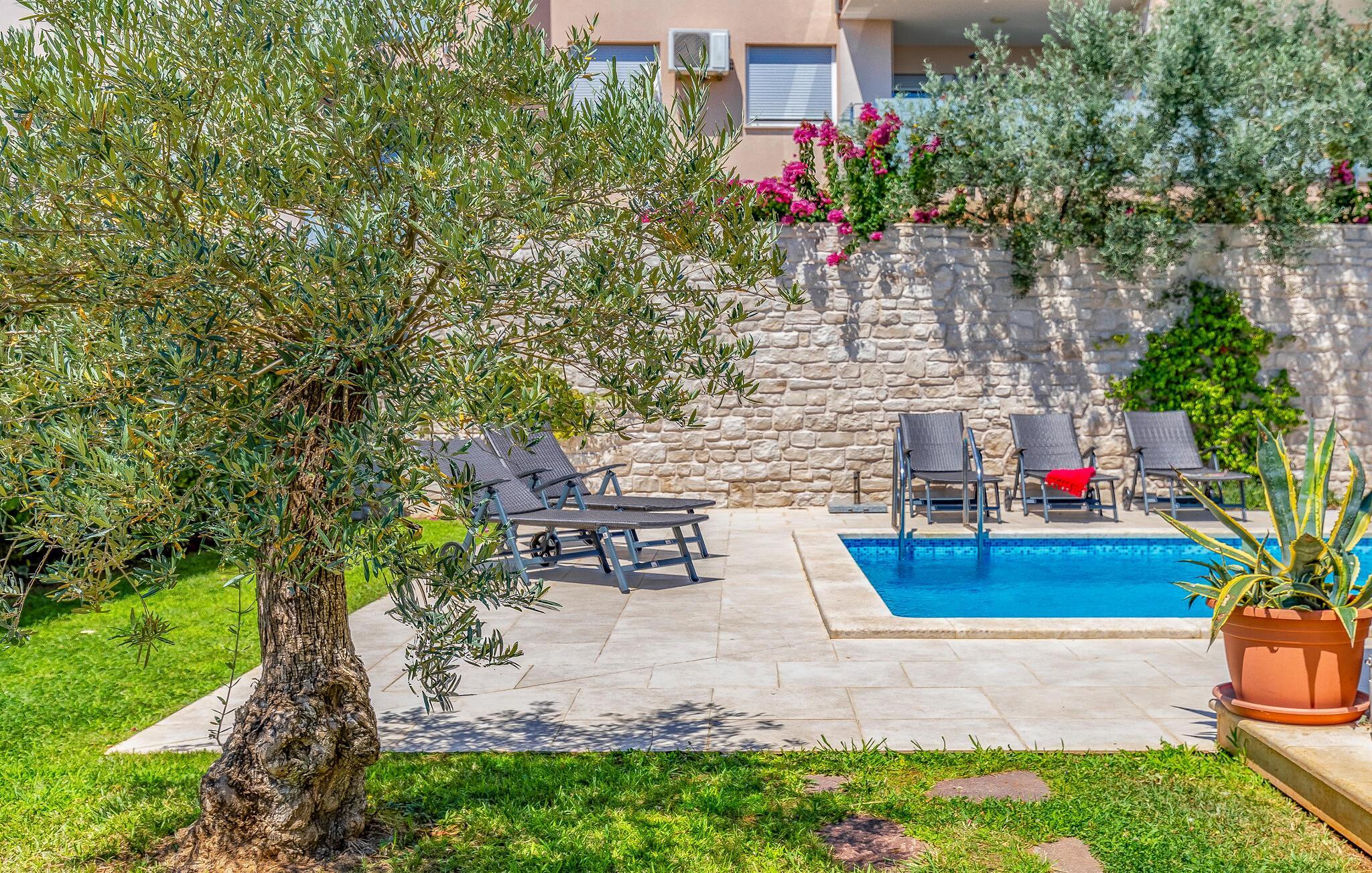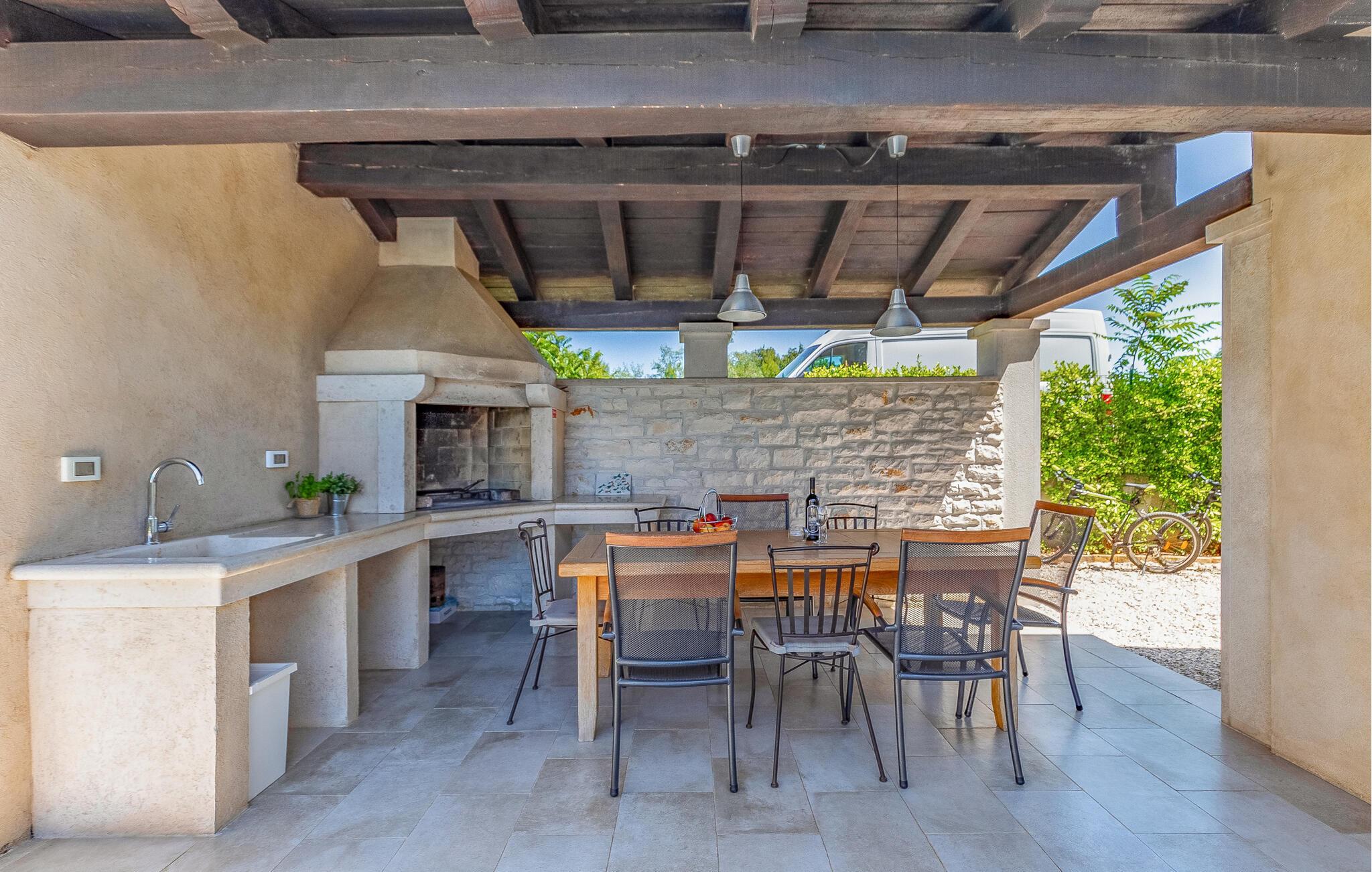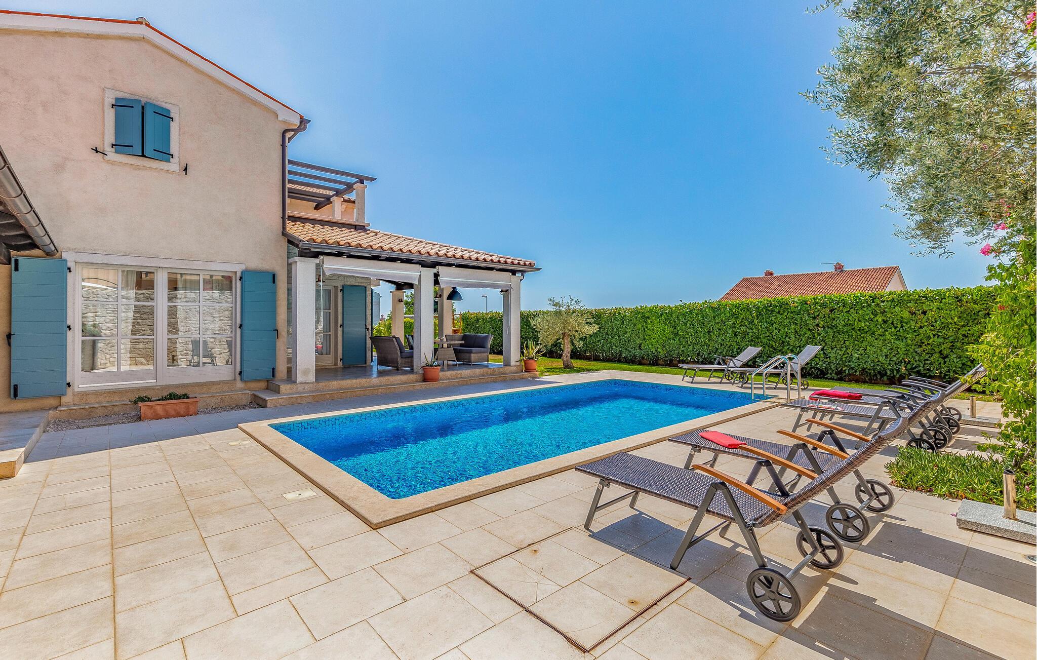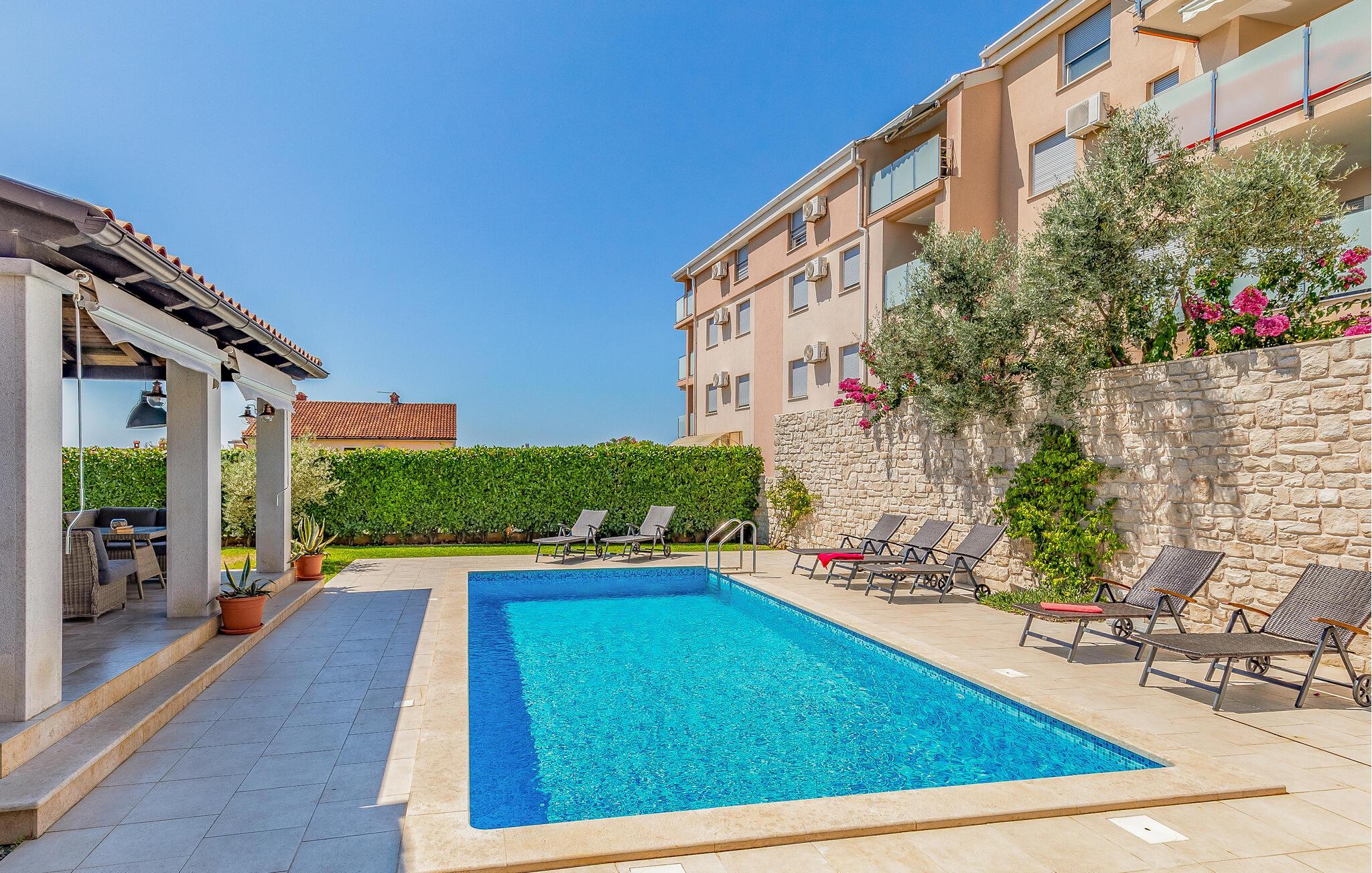 Diese wunderschöne moderne Villa befinde sich im Ort Fazana, der bekannt ist für seinen Hafen, von dem aus Ausflüge zu den Brijuni-Inseln gemacht werden, genauso wie für seine Strände, Promenaden, Wälder und Restaurants, ein ideales Reiseziel für Ihren Urlaub. Zum Haus gehören Kinderspielgeräte in einem eingezäunten Garten. Die Sauna, der Fitnessraum sowie andere Einrichtungen werden Sie begeistern. Am Nachmittag können Sie sich im Pool abkühlen, besonders wenn von Erkundungen in der Kleinstadt Fazana und der näheren Umgebung mit dem Fahrrad heimkommen. Die Räder sind ebenfalls im Angebot. Wenn Sie den Zauber Istriens entdecken möchten, empfehlen wir Ausflüge ins Landesinnere. Entdecken Sie die Tavernen und Weinkeller, kosten Sie die traditionellen Spezialitäten.