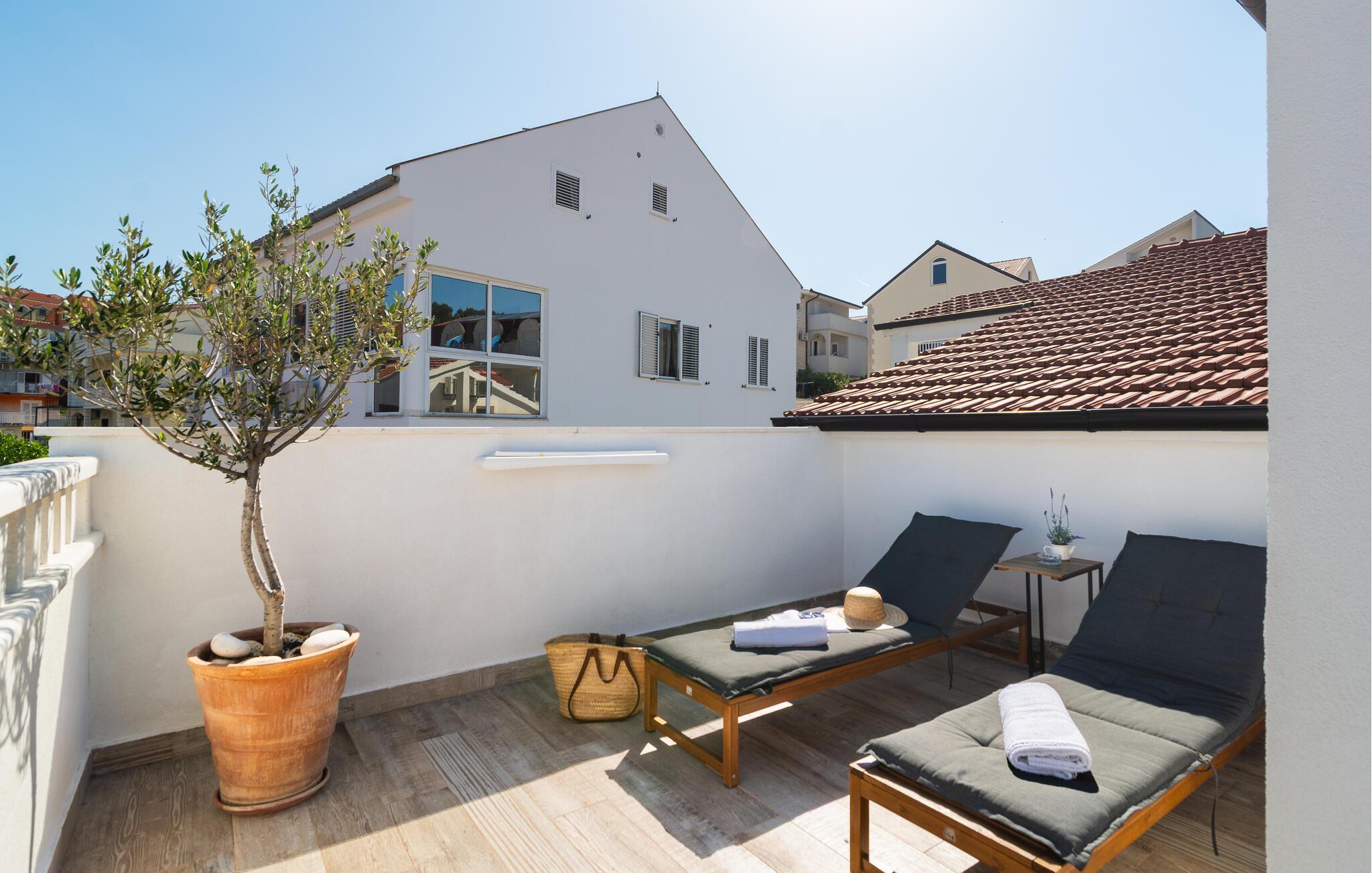 Die schöne Terrasse eröffnet Ihnen einen tollen Blick auf das nahegelegene Meer. Genießen Sie hier ein Frühstück in der milden Morgensonne und gönnen Sie sich bei Sonnenuntergang ein Glas Wein.