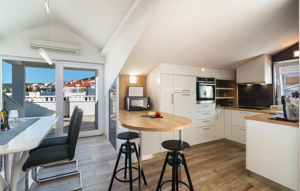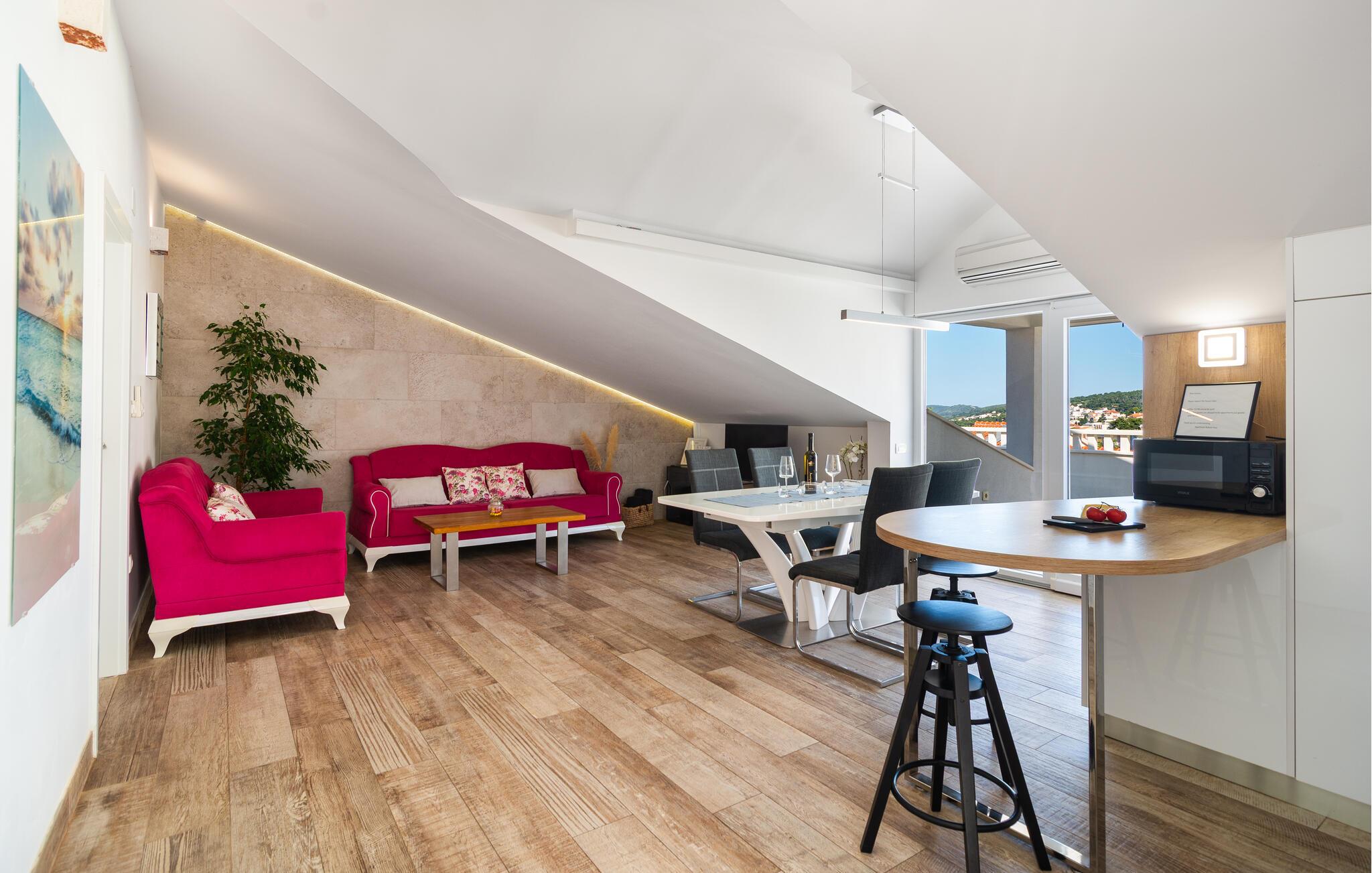 In dieser großzügigen und hellen Ferienwohnung werden Sie von einer modernen und geschmackvollen Einrichtung begrüßt. Kochen Sie gemeinsam köstliche Mahlzeiten in der offenen Küche, planen Sie Ihre Ausflüge am einladenden Esstisch und machen Sie es sich abends mit einem Film oder einer spannenden Serie in der bequemen Sofalandschaft gemütlich.