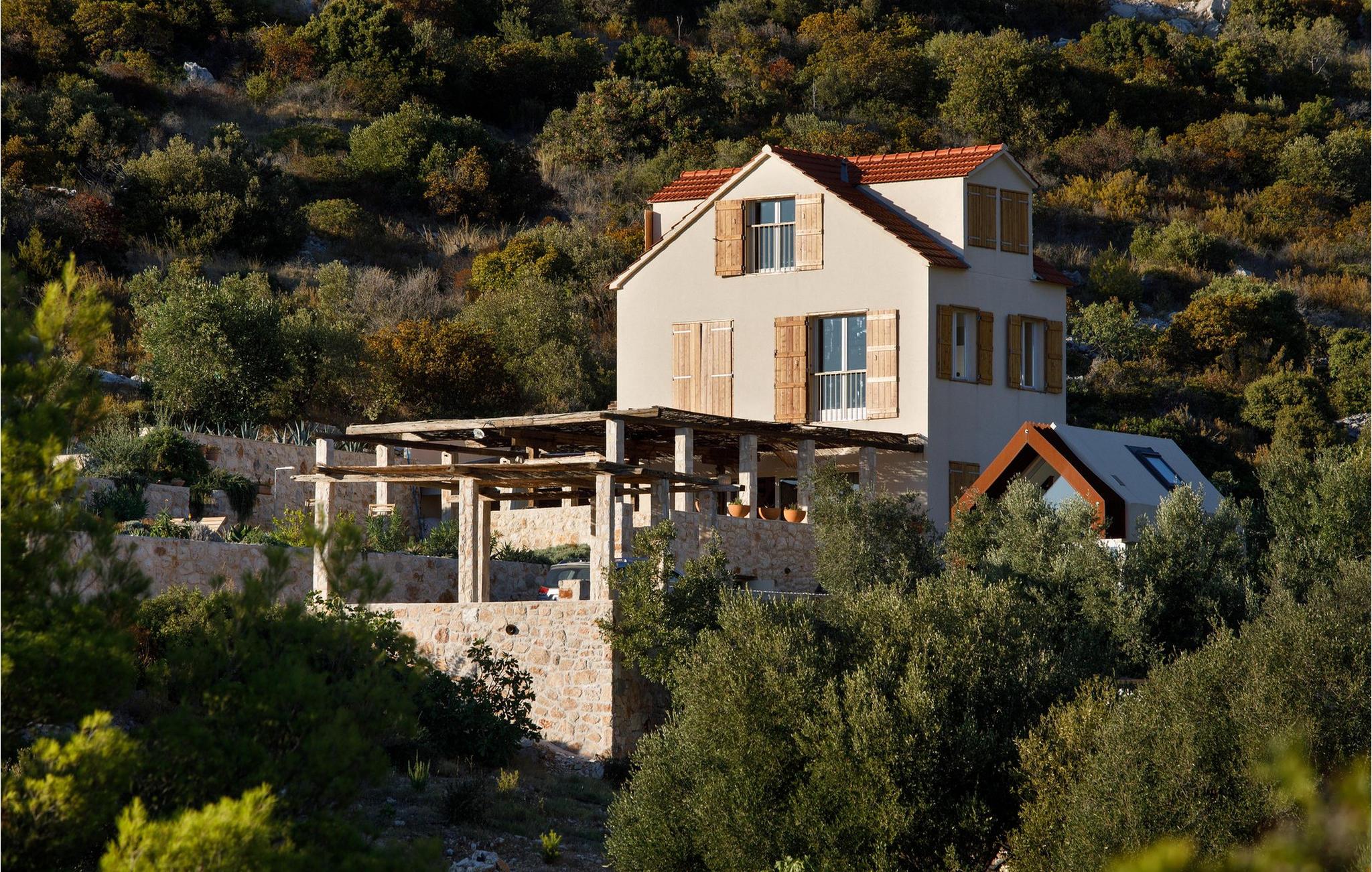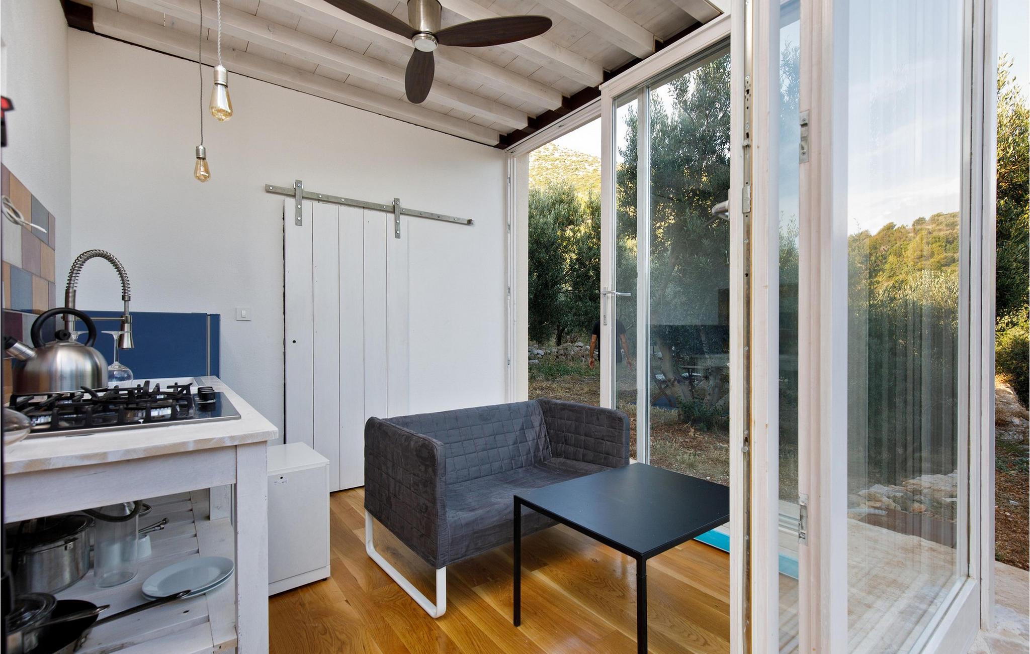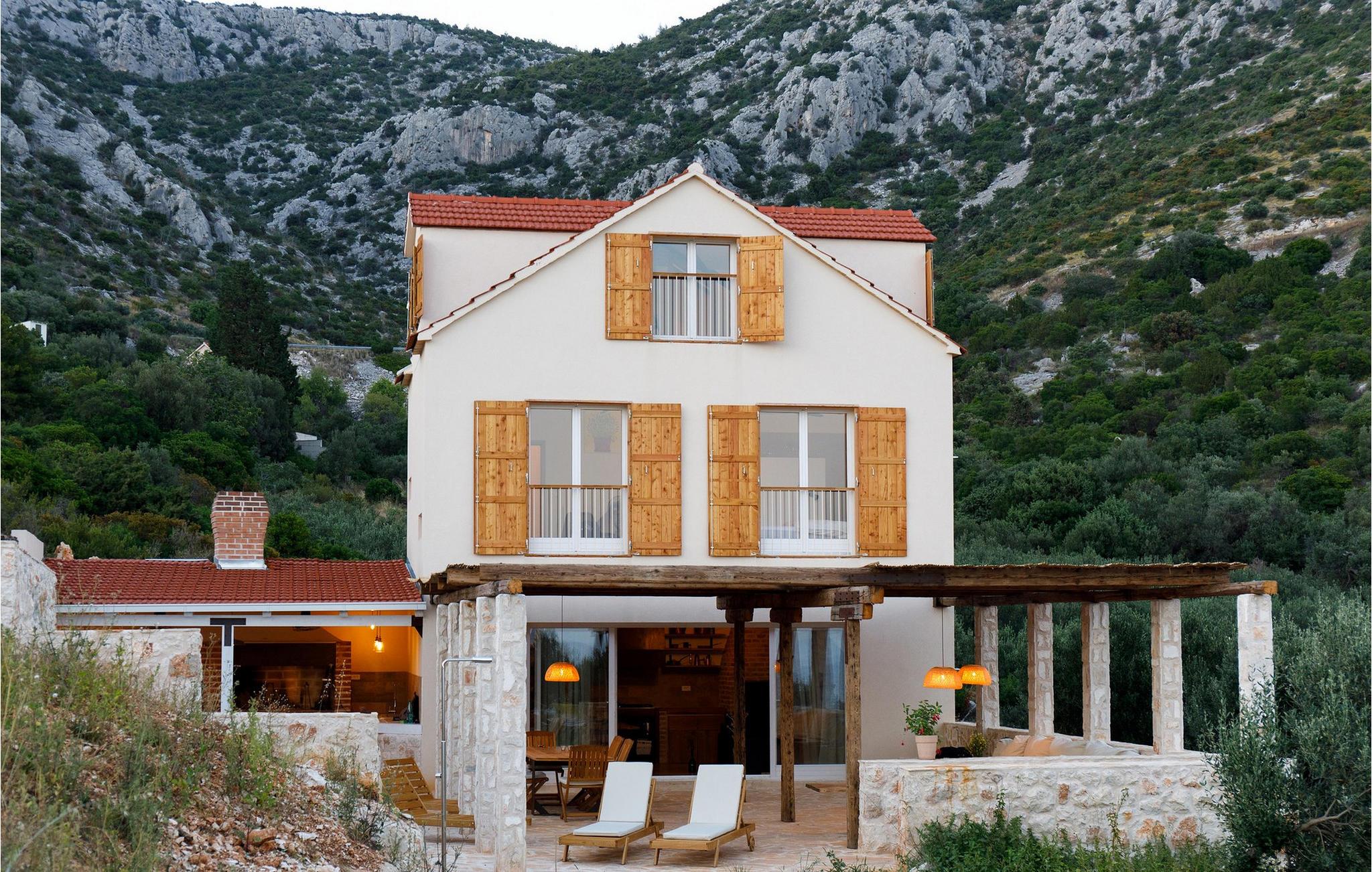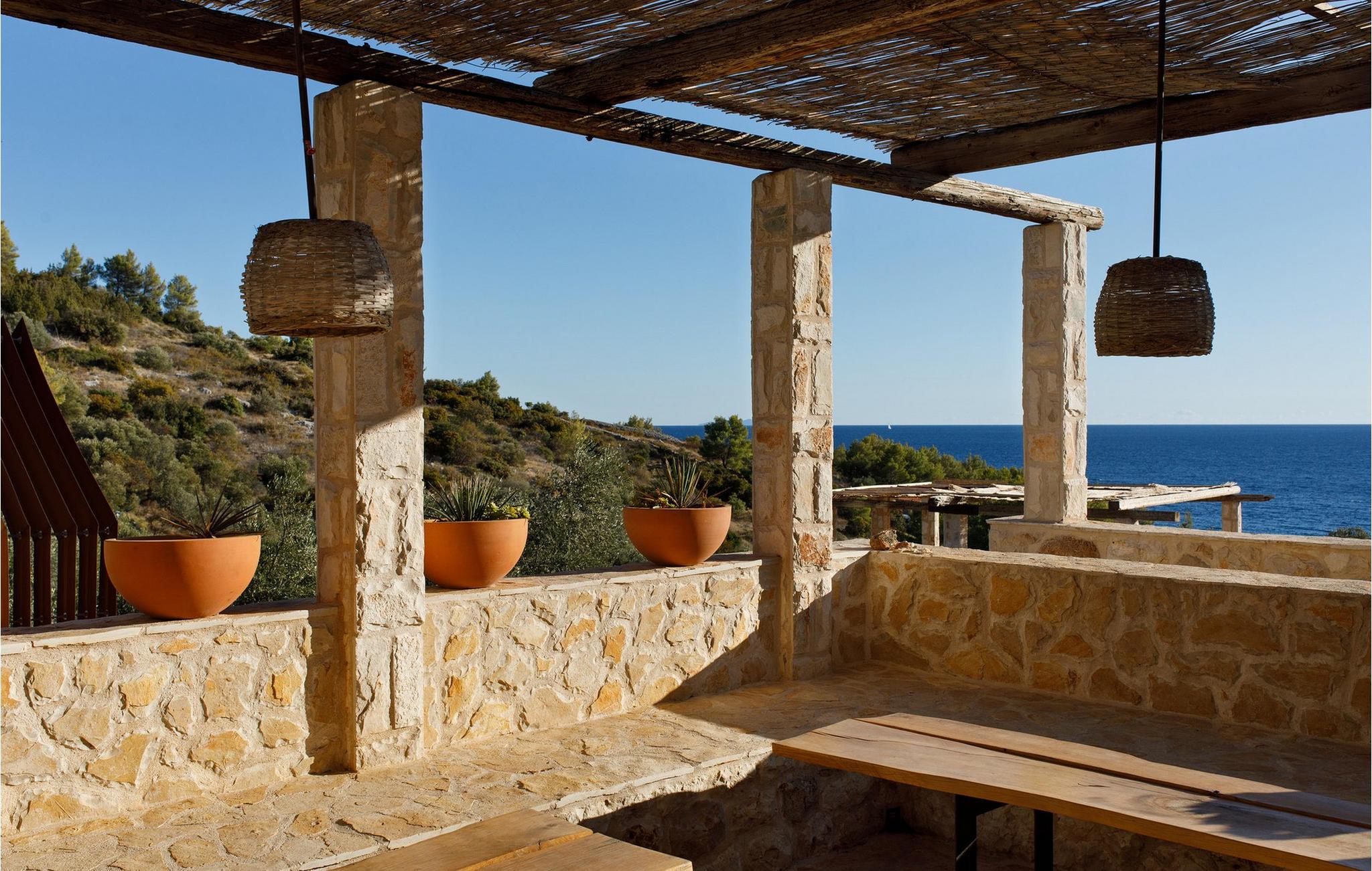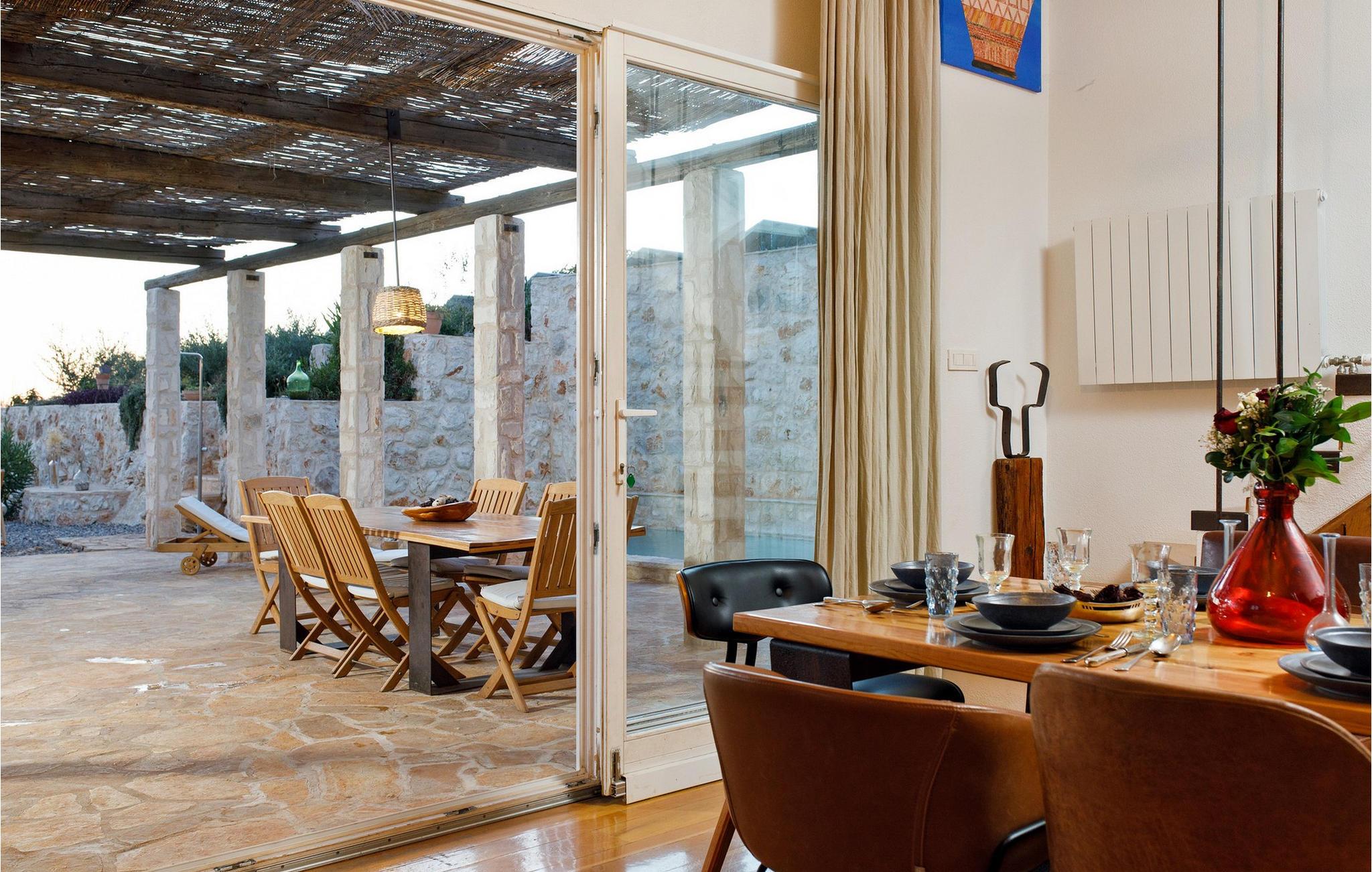 Im Inneren der Villa Vito erwartet Sie ein stilvolles Zusammenspiel aus mediterranem Charme und modernem Design. Die Wohnräume sind lichtdurchflutet, mit natürlichen Materialien, gemütlichen Sitzmöbeln und einem weiten Blick auf das Meer. Lehnen Sie sich hier entspannt mit einer Tasse Kaffee oder einem kühlen Drink zurück und lassen Sie die Seele baumeln. In der oberen Etage lädt eine kleine Lounge mit bequemen Sesseln zum Betrachten des Sonnenuntergangs ein. Die großzügige Küche mit Backsteinofen, rustikalen Holzelementen und einer großen Kochinsel ist ideal für gemeinsame Mahlzeiten. Genießen Sie hier eine erholsame Auszeit bei einem köstlichen Essen und einer Flasche kroatischem Wein.