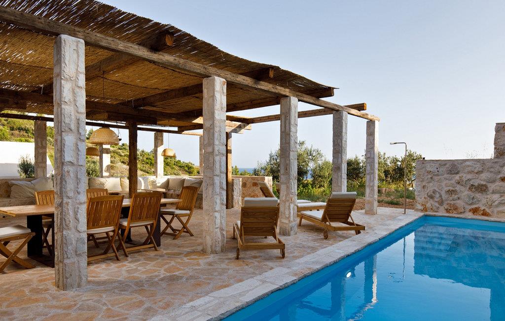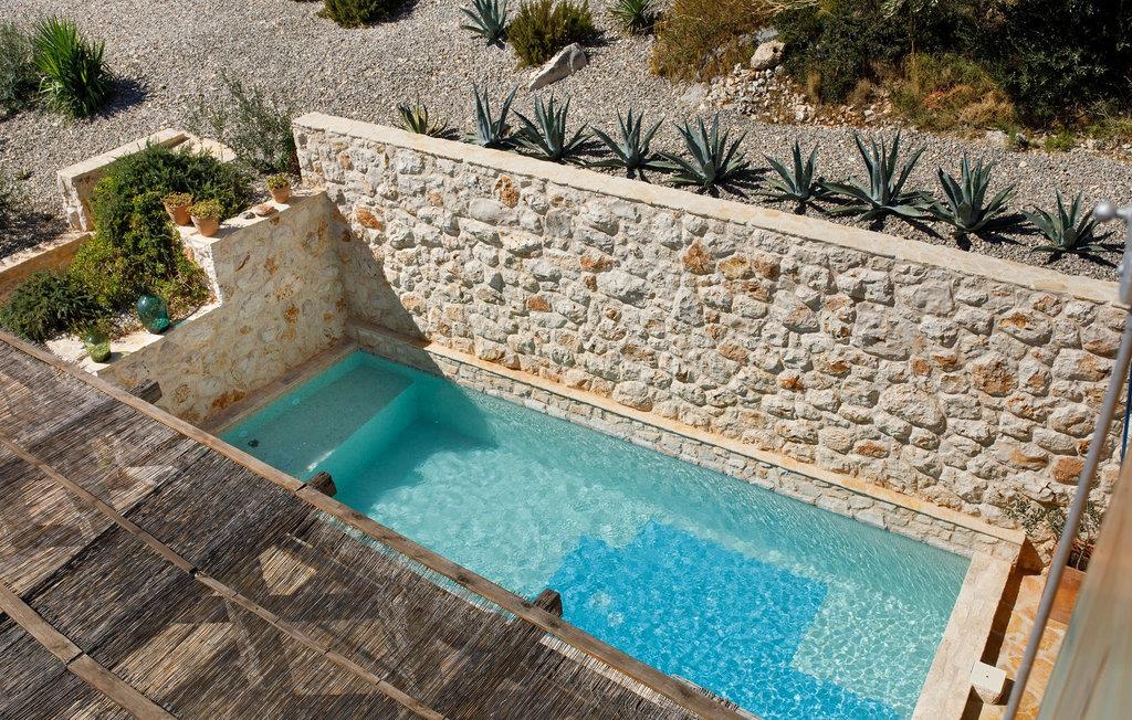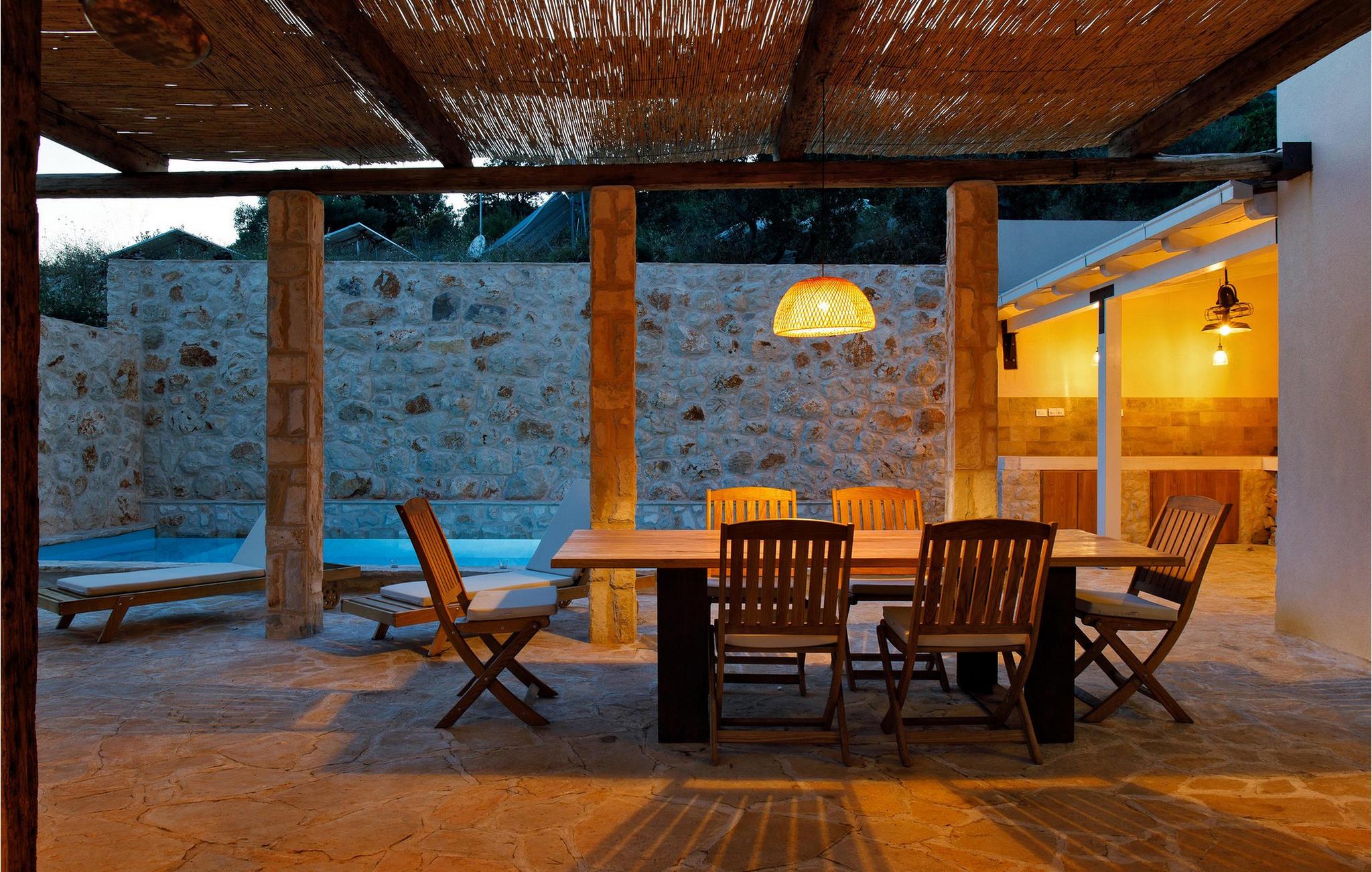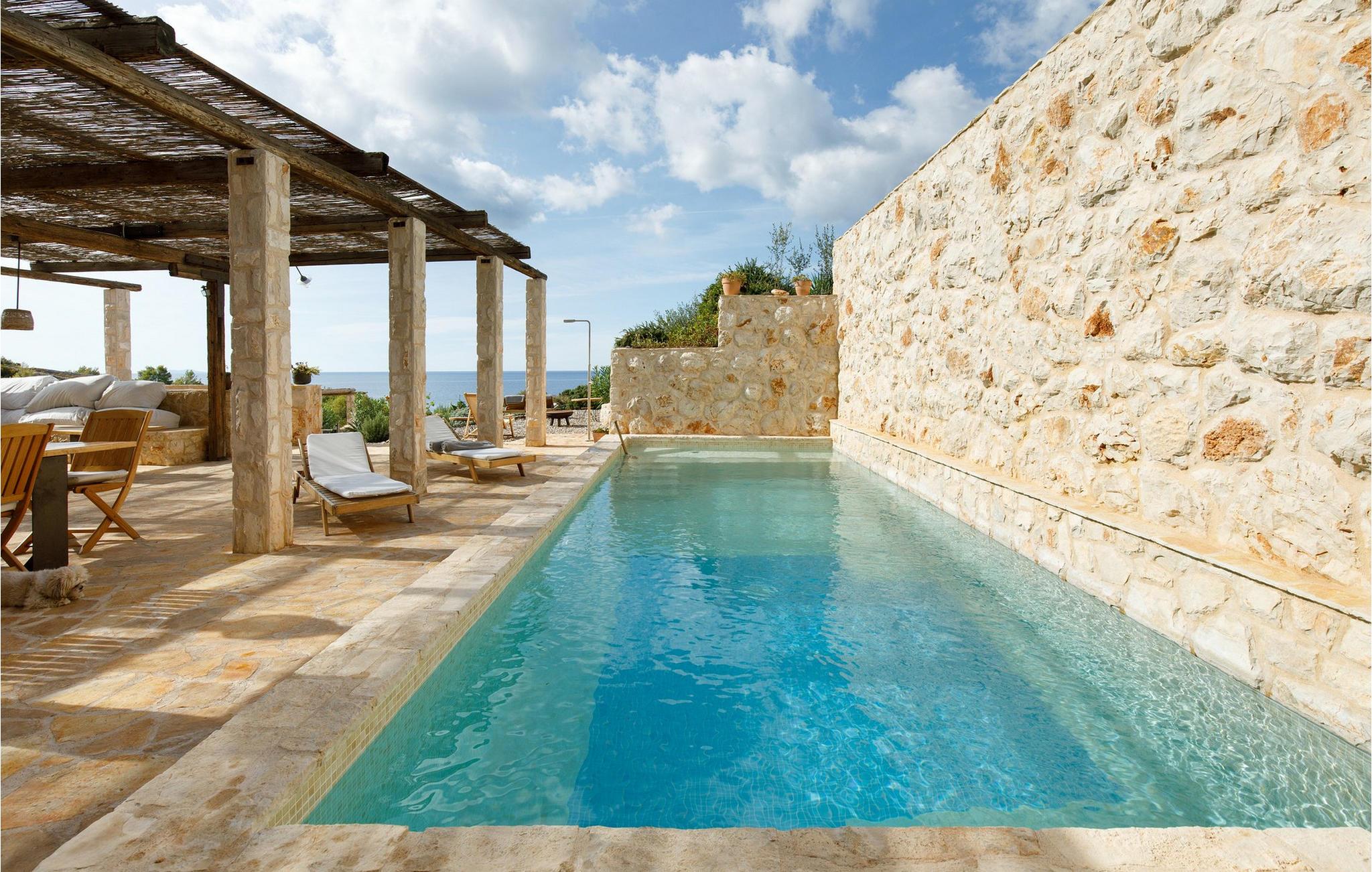 Draußen eröffnet sich Ihnen ein traumhafter Rückzugsort, umgeben von Naturstein, mediterraner Vegetation und warmem Licht. Genießen Sie auf der großzügigen Terrasse mit überdachtem Essbereich Ihre Mahlzeiten, begleitet vom Duft der Kräuter und dem Rauschen der Meereswellen. Springen Sie für ein erfrischendes Bad in den Pool und entspannen Sie sich hinterher mit einem guten Buch auf einer der komfortablen Liegen. Am Abend verwandelt sich der Pool in eine stimmungsvolle Kulisse. Nur wenige Schritte trennen Sie von einer kleinen Bucht – ideal für ein Bad im klaren Wasser oder einen ruhigen Moment am Meer.