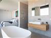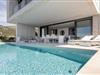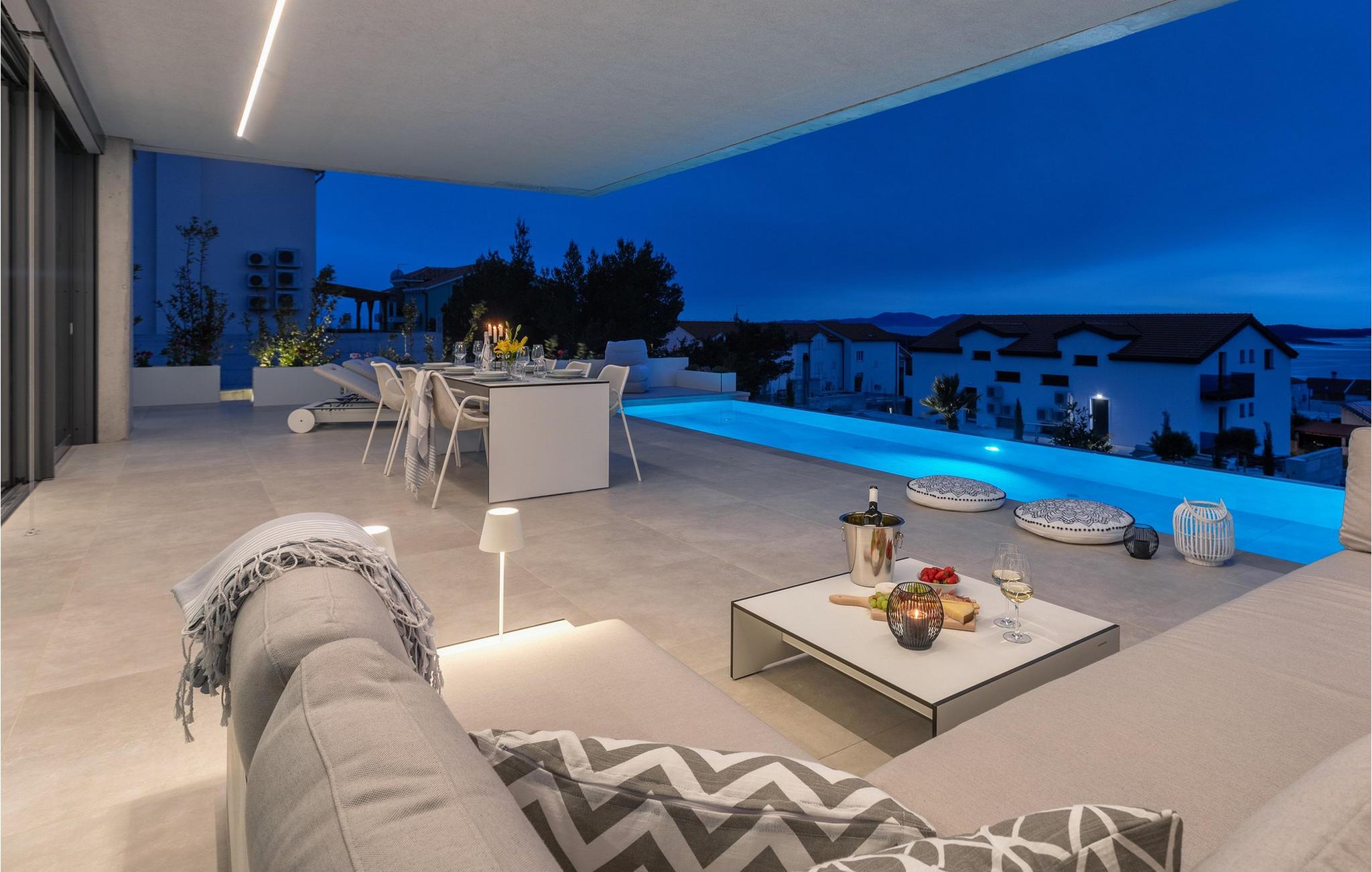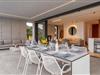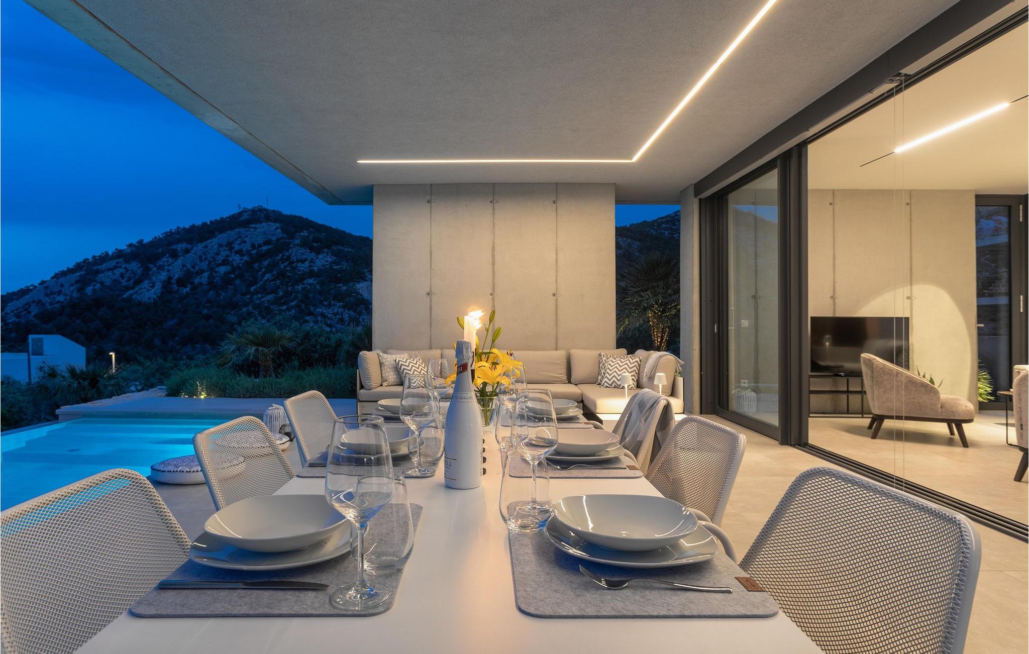 Dank breiter Schiebetüren gelangen Sie bequem hinaus auf die elegant möblierte Terrasse, auf der Sie eine gemütliche Lounge vorfinden, in der Sie sich nach erfrischenden Bädern im abends stimmungsvoll beleuchteten Pool einen Drink servieren können. Komfortable Sonnenliegen laden zum Entspannen unter dem blauen Himmel ein. Entfachen Sie den Grill und freuen Sie sich auf lange, laue Sommerabende bei Wein und Kerzenschein.