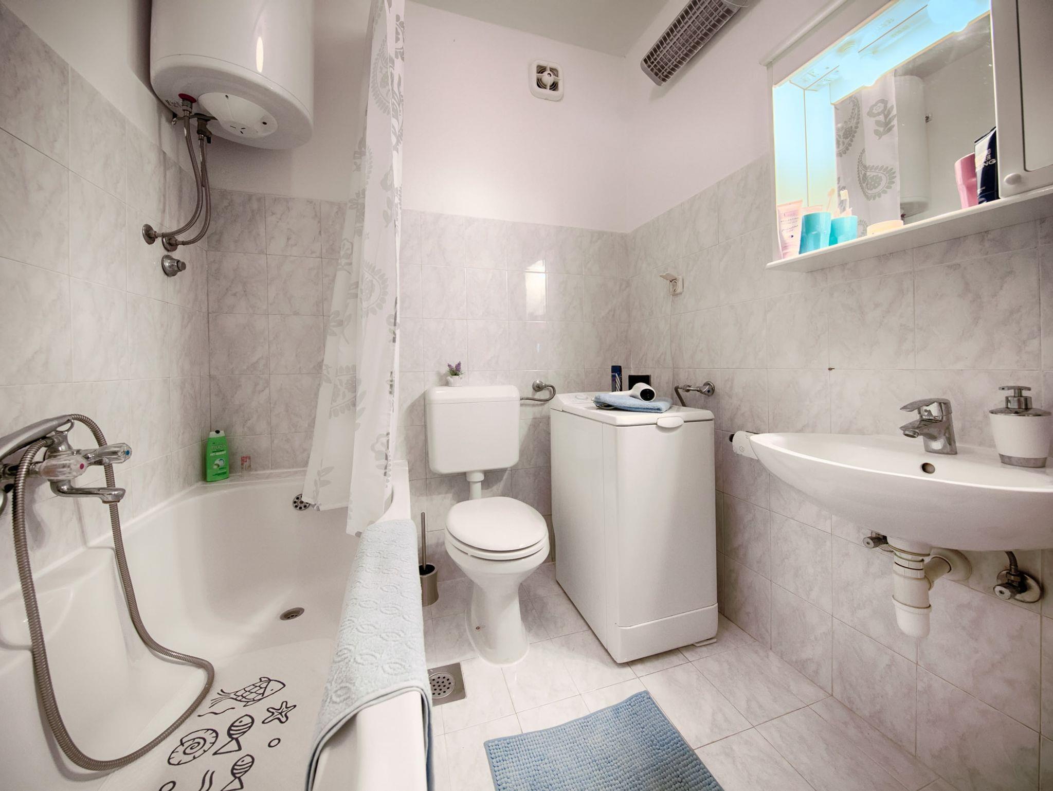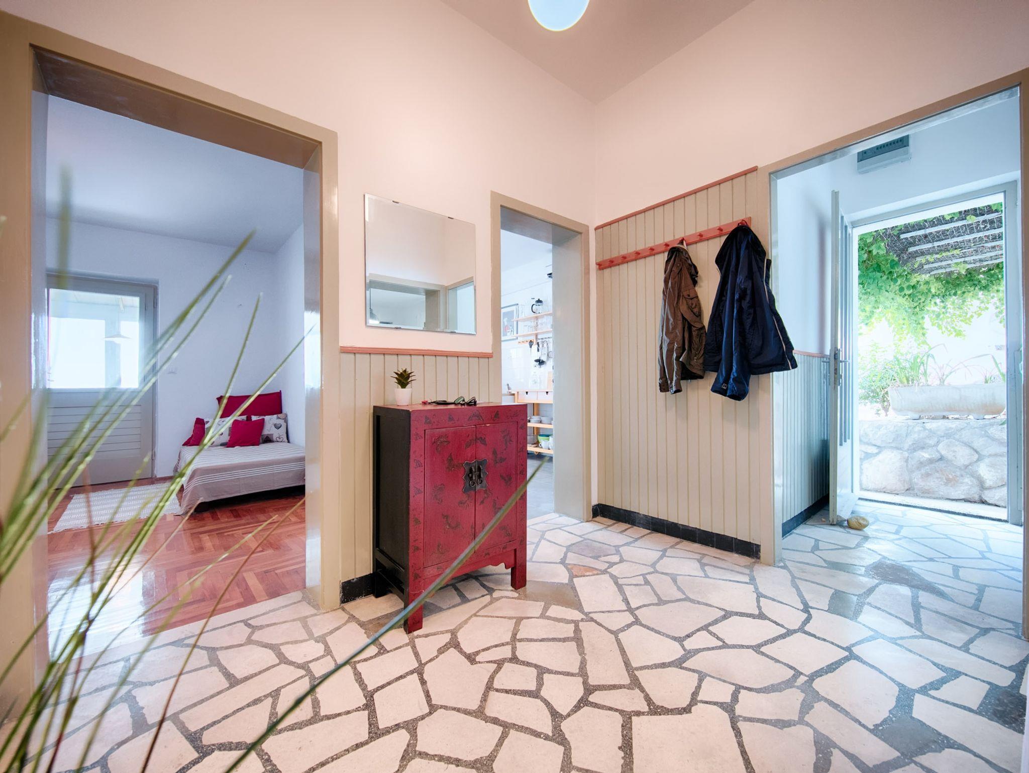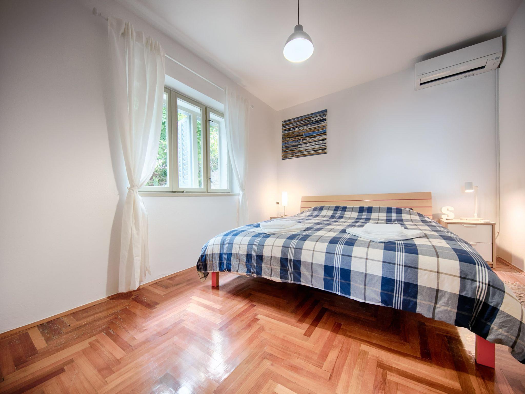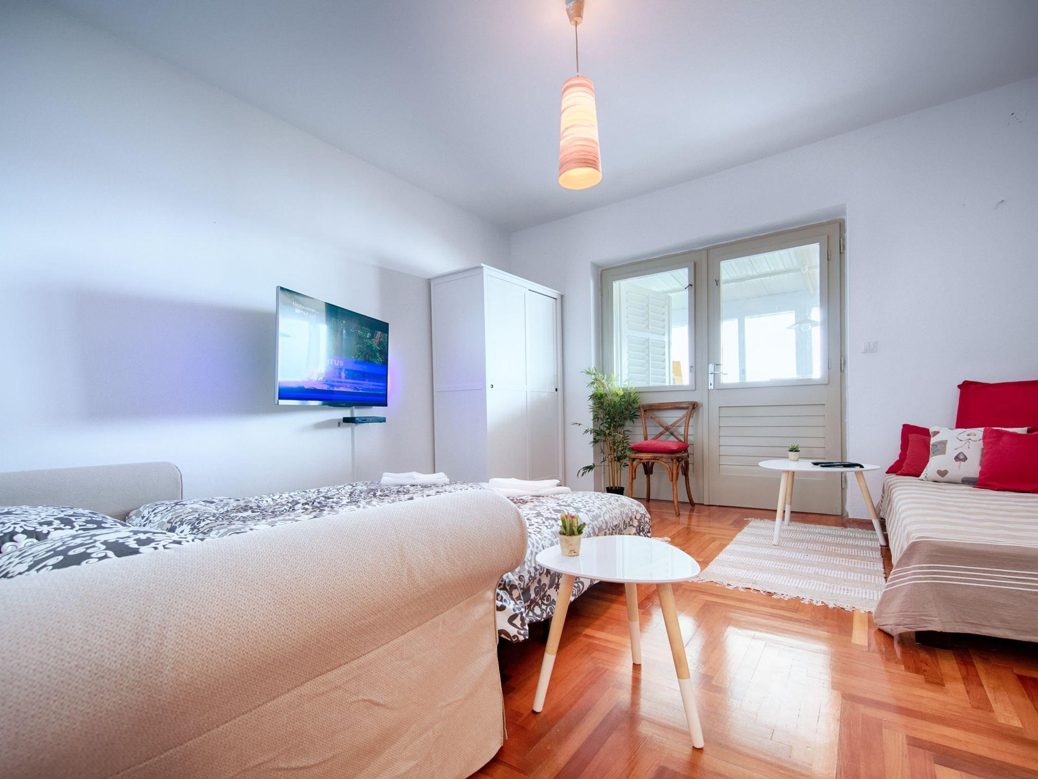 Ferienwohnung bietet Platz für 7 Gäste. Die Betten sind in Schlafzimmern, die es 2 gibt, und in Wohnzimmer, innerhalb einer Gesamtfläche von 90m2, angeordnet. Das Apartment bietet Meerblick. In der Unterkunftseinheit besteht die Möglichkeit des Mitbringens von Haustieren, und die Dienstleistung ist im Preis der Unterkunft enthalten. Die reservierte Unterkunftseinheit hat keinen Balkon und keine Terrasse. IM PREIS INBEGRIFFEN: Kurtaxe, Endreinigung, Klimatisierung, Internet, Haustiere, Bügeleisen, Bügelbrett, Föhn. Die Verfügbarkeit zusätzlicher Dienstleistungen in Ihrem reservierten Termin und die Preise derselben (falls nicht aufgeführt) müssen im Voraus überprüft werden. Zusätzliche Dienstleistungen die in der Zahlungsaufforderung nicht aufgeführt sind werden direkt beim Vermieter bezahlt, angenommen der Gast nutzt auch diese.