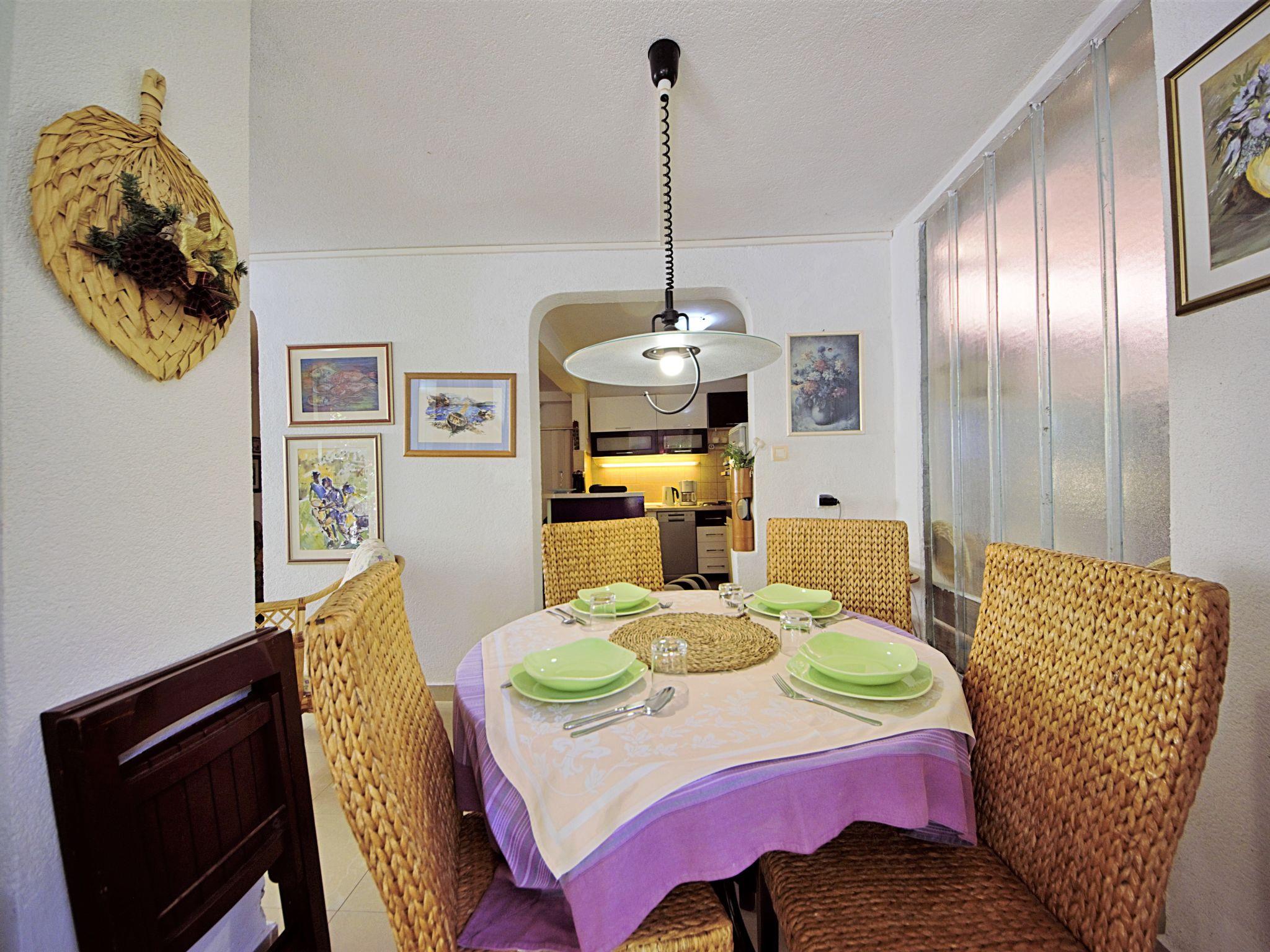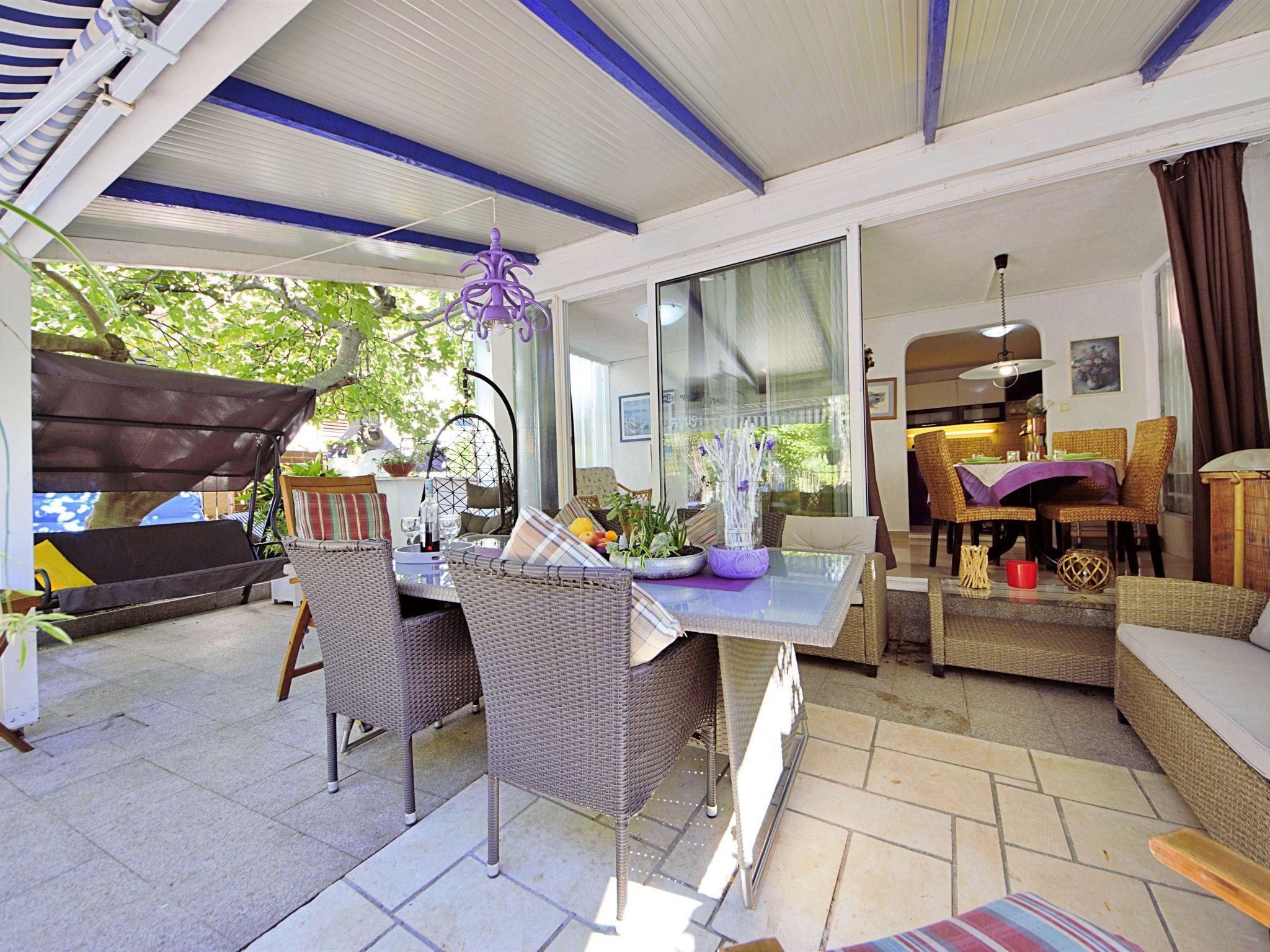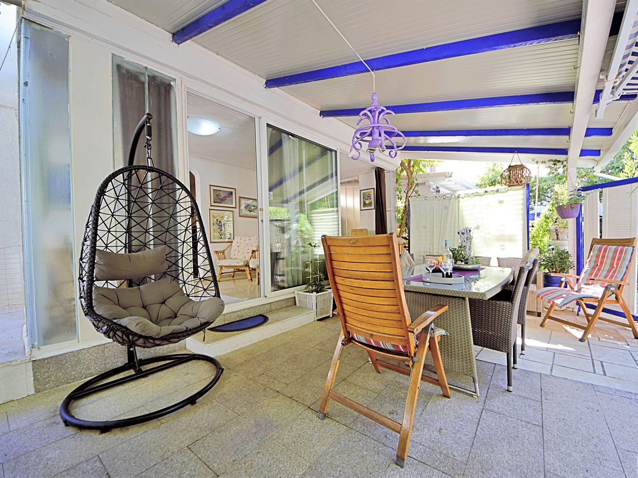 4-Zimmer-Doppelhaushälfte 110 m2 auf 2 Stockwerken, Westlage. Wohn-/Esszimmer mit Sat-TV (Flachbildschirm), Klimaanlage. Ausgang zur Terrasse. Offene Küche (2 Kochplatten, Backofen, Geschirrspüler, Mikrowelle, Tiefkühler, elektrische Kaffeemaschine). Dusche/WC. Obergeschoss: 1 Zimmer mit 1 franz. Bett (160 cm, Länge 200 cm). Ausgang zum Balkon. 1 Zimmer mit 2 Betten (90 cm, Länge 200 cm). 1 Zimmer mit 1 Bett (90 cm, Länge 200 cm). Dusche/WC. Keine Heizmöglichkeit. Balkon 5 m2, kleiner Balkon Terrasse 15 m2. Terrassenmöbel, Balkonmöbel, Liegestühle. Zur Verfügung: Internet (WLAN, gratis). Maximal 2 Haustiere/Hunde erlaubt.