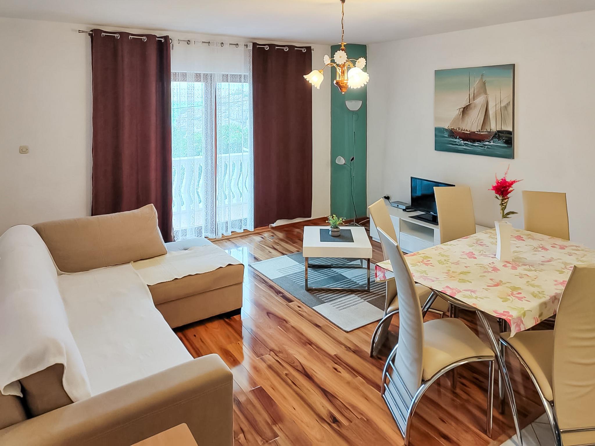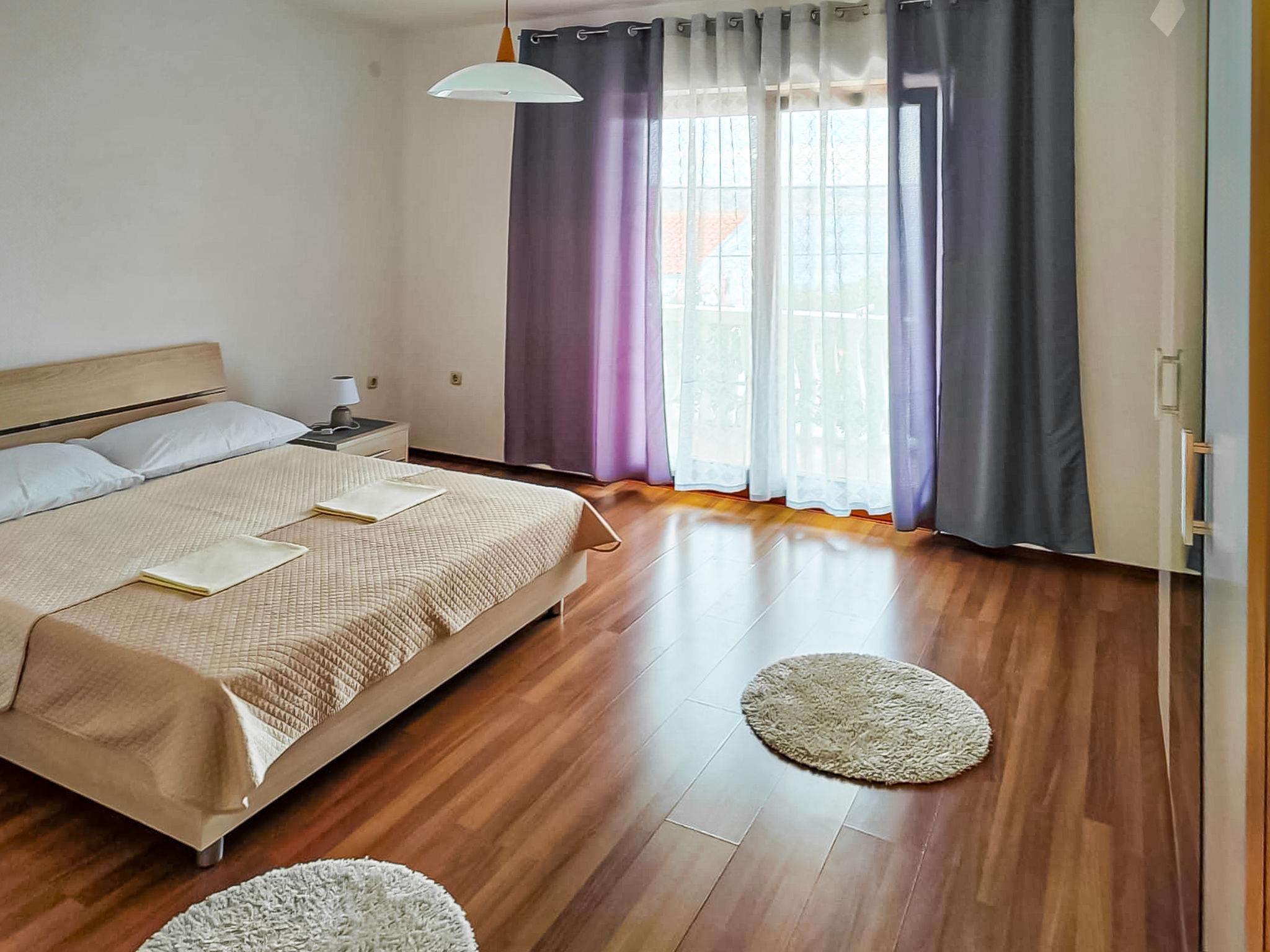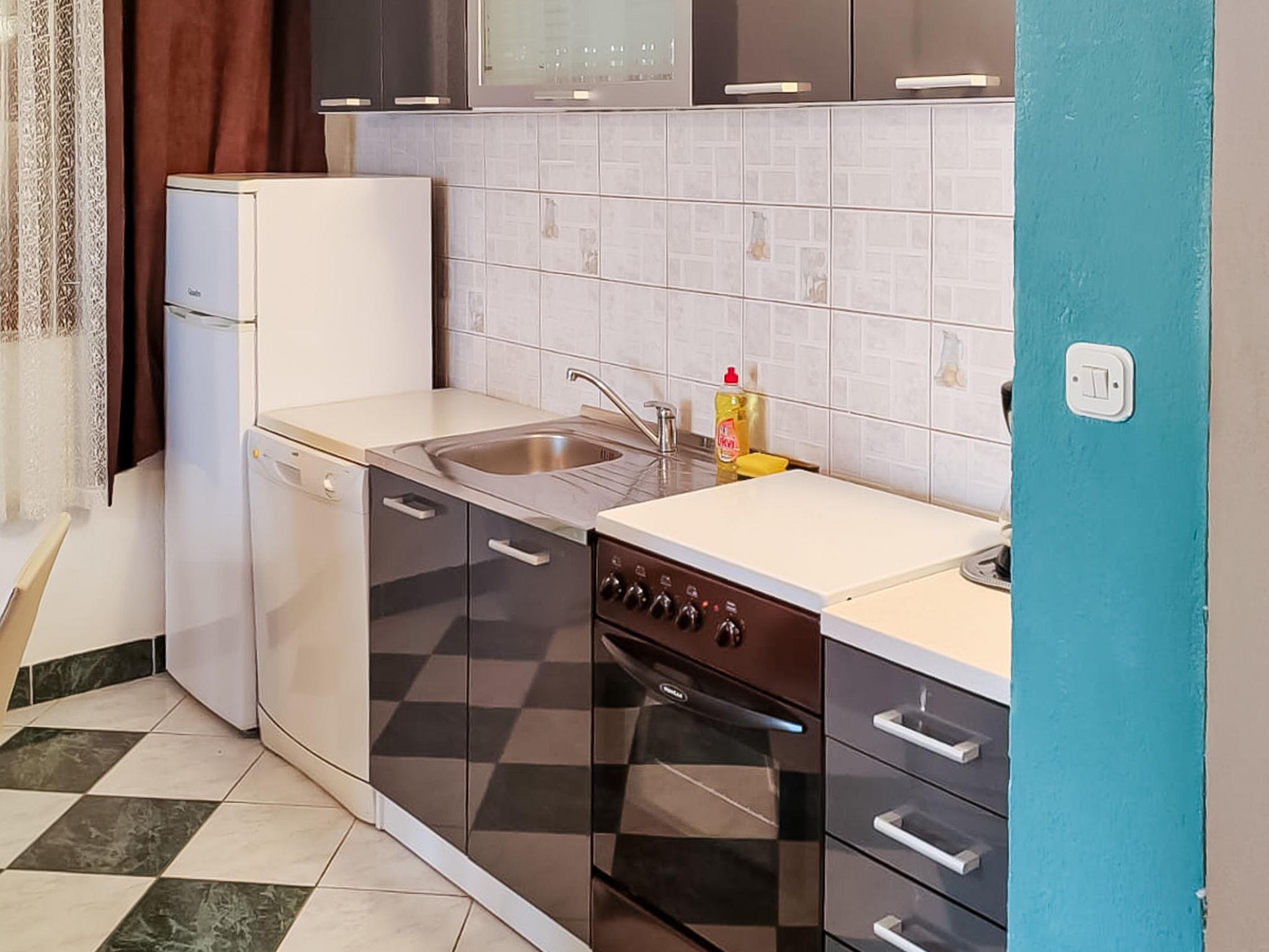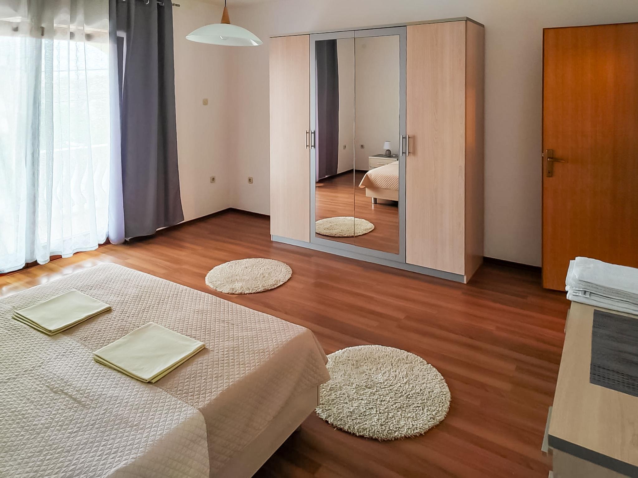3-Zimmer-Wohnung 85 m2 im 1. Stock, Südwestlage. Wohn-/Esszimmer 30 m2 mit 1 Doppeldiwanbett (140 cm, Länge 200 cm), Sat-TV (Flachbildschirm). Ausgang zur Terrasse. Eingang mit Klimaanlage. 1 Zimmer mit 1 Doppelbett (2 x 90 cm, Länge 200 cm). Ausgang zur Terrasse. 1 Zimmer mit 2 Betten (90 cm, Länge 190 cm). Offene Küche (4 Kochplatten, Backofen, Geschirrspüler, Tiefkühler, elektrische Kaffeemaschine). Dusche/Bidet/WC. Klimaanlage (extra). Keine Heizmöglichkeit. Terrasse 16 m2, überdacht. Terrassenmöbel. Sicht auf das Meer. Zur Verfügung: Waschmaschine. Internet (Wireless LAN, gratis).