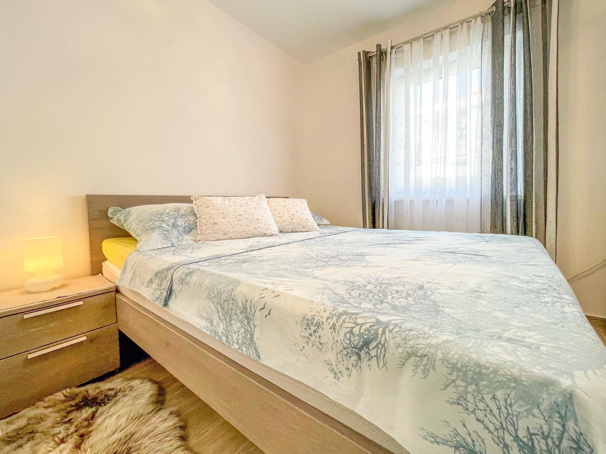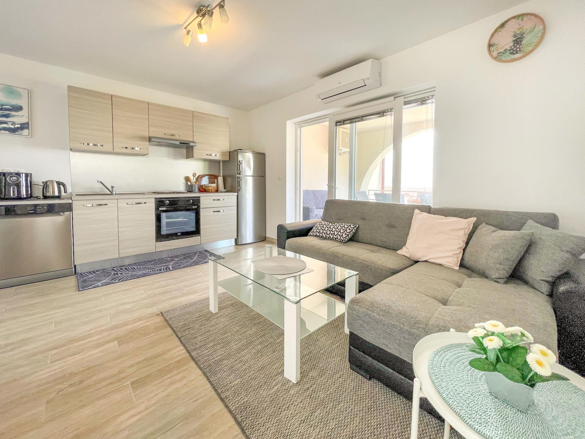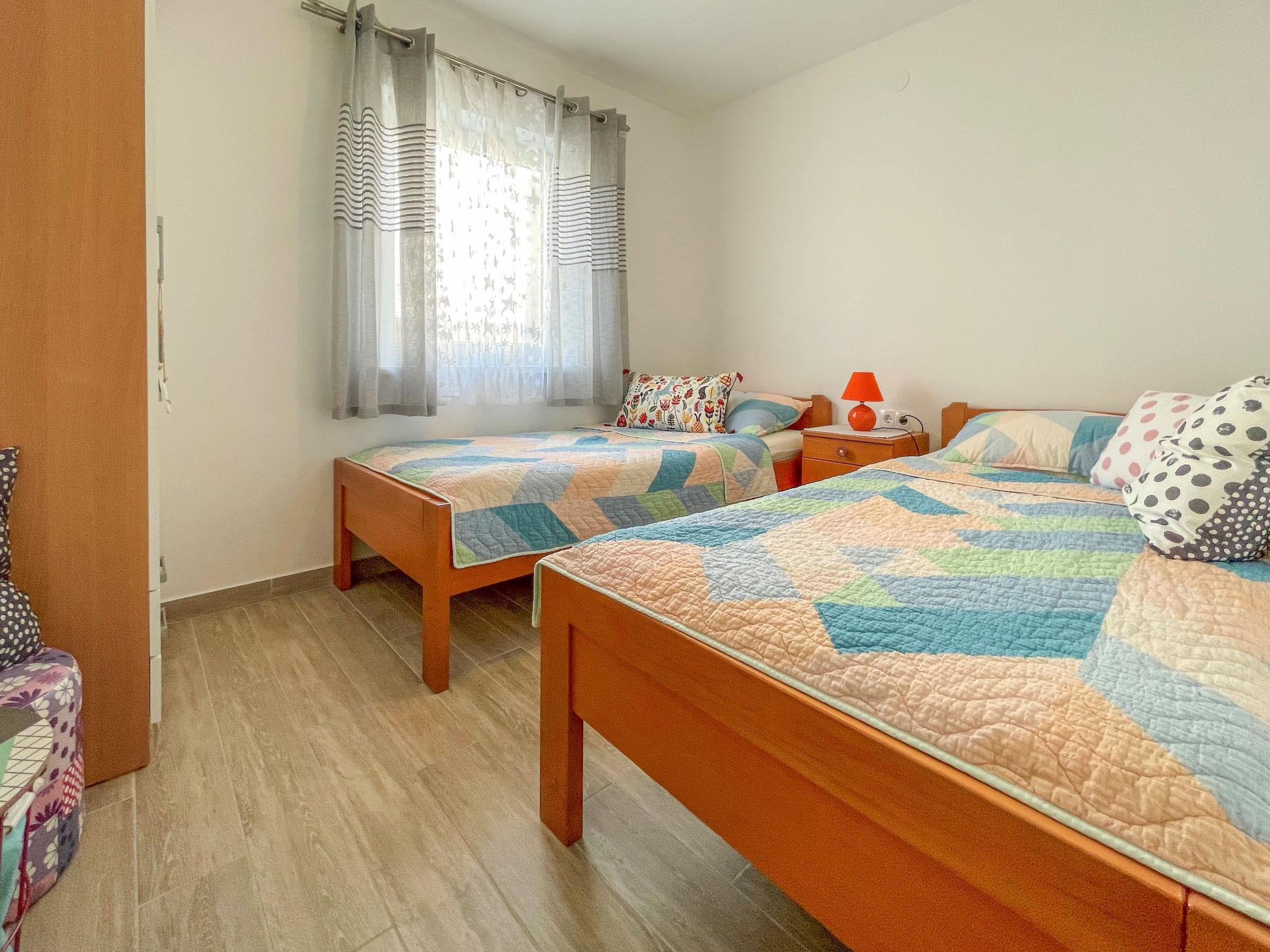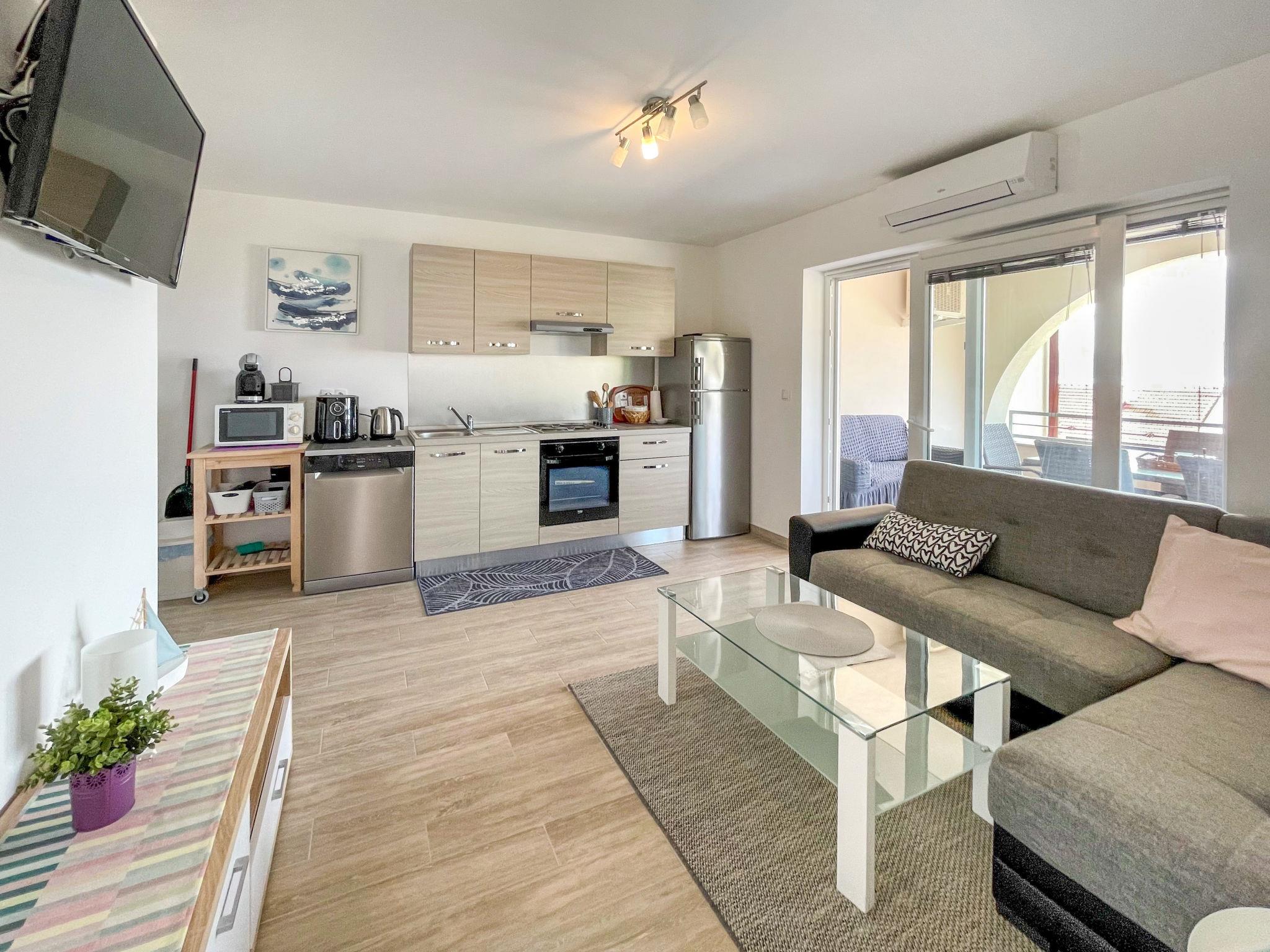 3-Zimmer-Wohnung 60 m2 im 1. Stock, Südlage. Objekt geeignet für 2 Erwachsene + 2 Kinder. Komfortabel eingerichtet: Wohn-/Esszimmer mit Sat-TV und Klimaanlage. Ausgang zur Terrasse. 1 Zimmer mit 1 franz. Bett (160 cm, Länge 200 cm). 1 Zimmer mit 2 Betten (90 cm, Länge 200 cm). Offene Küche (4 Kochplatten, Backofen, Geschirrspüler, Toaster, Wasserkocher, Mikrowelle, Tiefkühler, elektrische Kaffeemaschine). Dusche/WC. Keine Heizmöglichkeit. Terrasse 16 m2, überdacht. Terrassenmöbel. Schöne Sicht auf das Meer. Zur Verfügung: Waschmaschine. Internet (WLAN, gratis). Parkplatz (1 Auto). Geeignet für Familien. Max. Belegung: 2 Erwachsene und 2 Kinder bis 17 Jahre.
