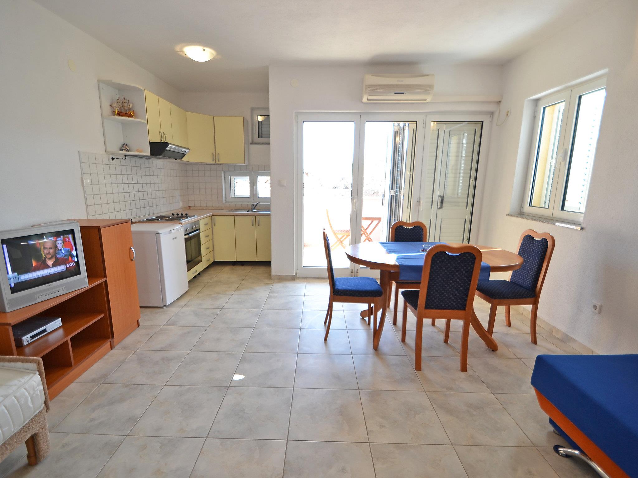 2-Zimmer-Wohnung 40 m2, im erhöhten Erdgeschoss, Südostlage. Wohn-/Esszimmer 20 m2 mit 1 Doppeldiwanbett (140 cm, Länge 200 cm), Sat-TV (Flachbildschirm), Klimaanlage. Ausgang zur Terrasse. 1 Zimmer mit 2 Betten (90 cm, Länge 200 cm). Offene Küche (4 Kochplatten, Backofen). Dusche/WC. Keine Heizmöglichkeit. Terrasse 6 m2, überdacht. Terrassenmöbel. Zur Verfügung: Internet (WLAN, gratis). Parkplatz (1 Auto).